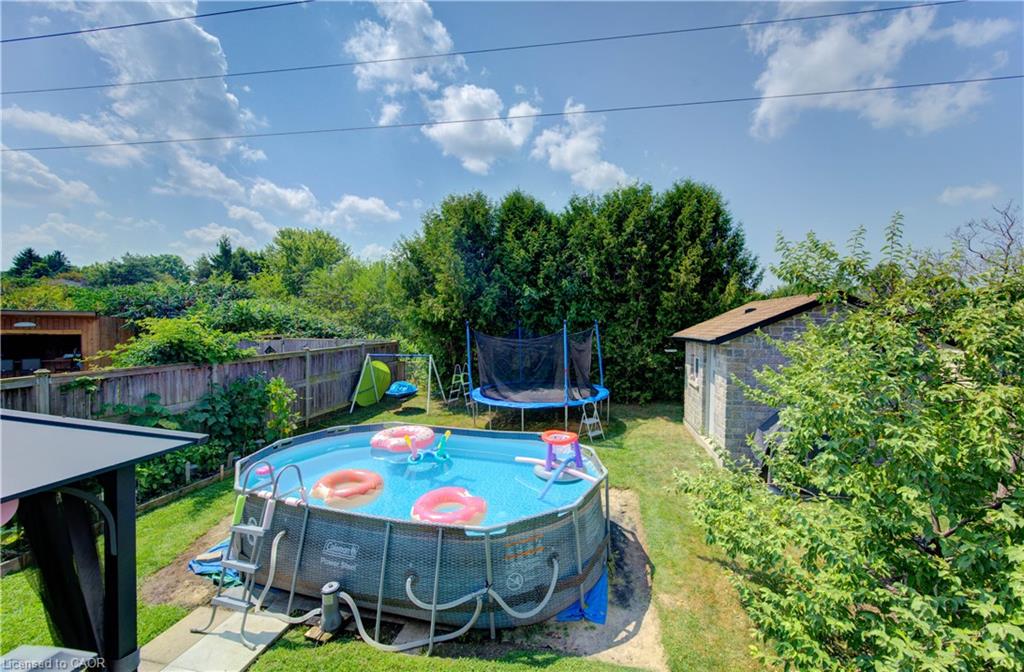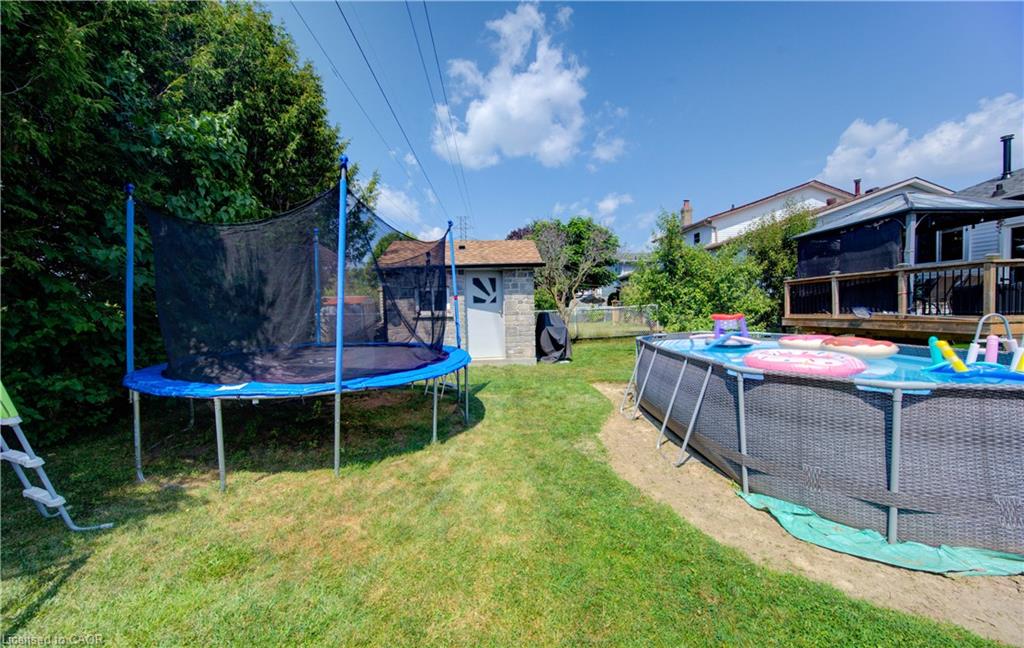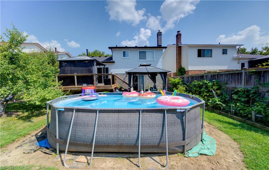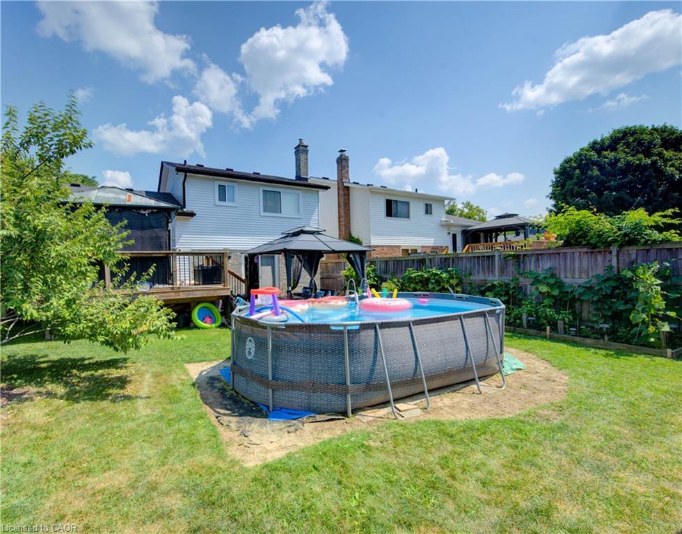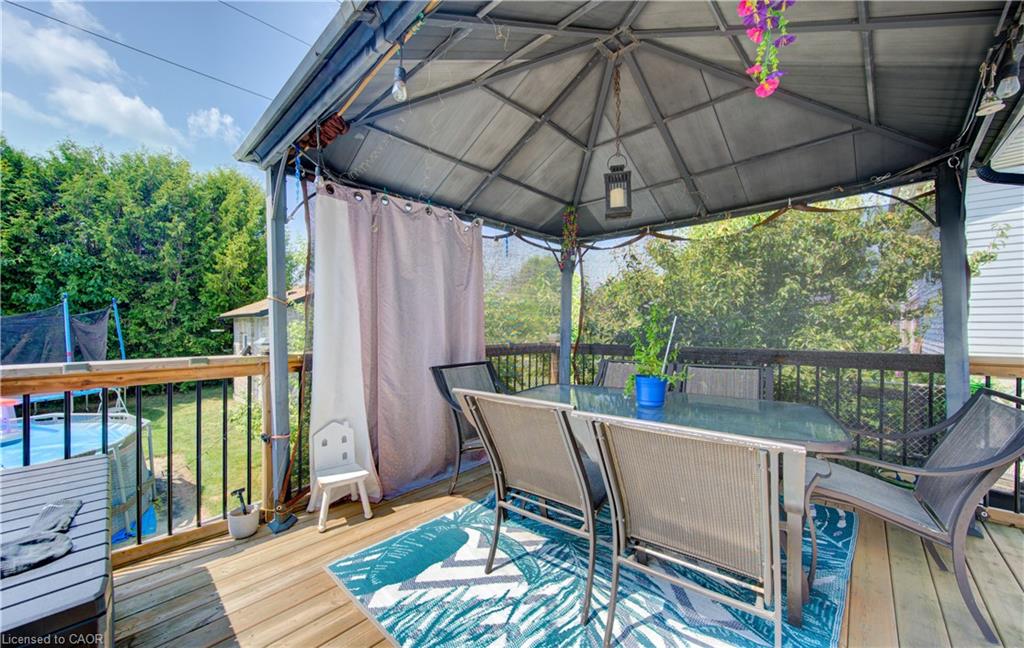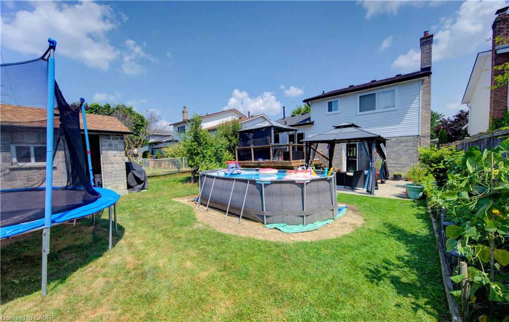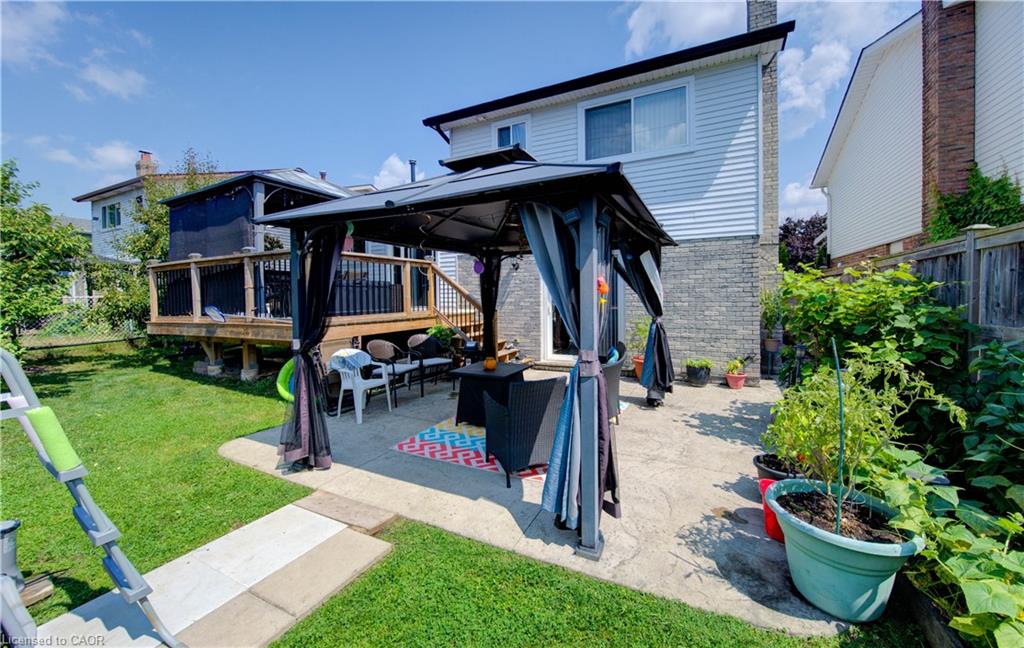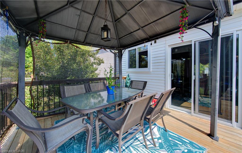 The backyard is a true highlight – featuring a large deck, two covered gazebo-style sitting areas, a storage shed, and ample room for kids to play or for hosting summer gatherings. Mature greenery and a wide lot create privacy and flexibility for outdoor living.