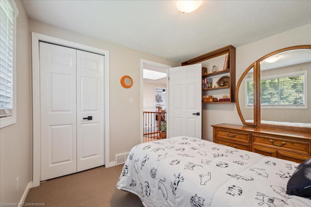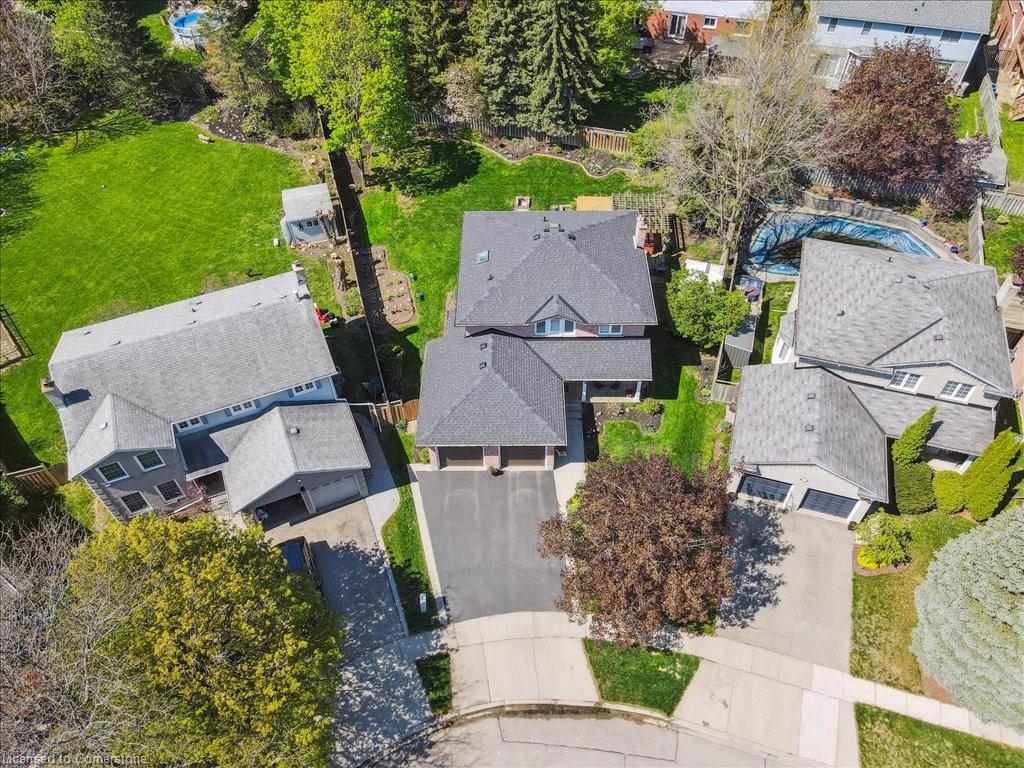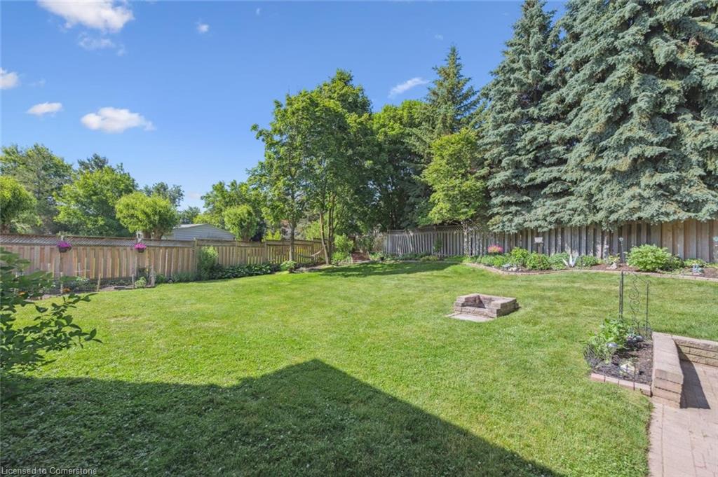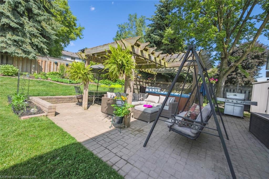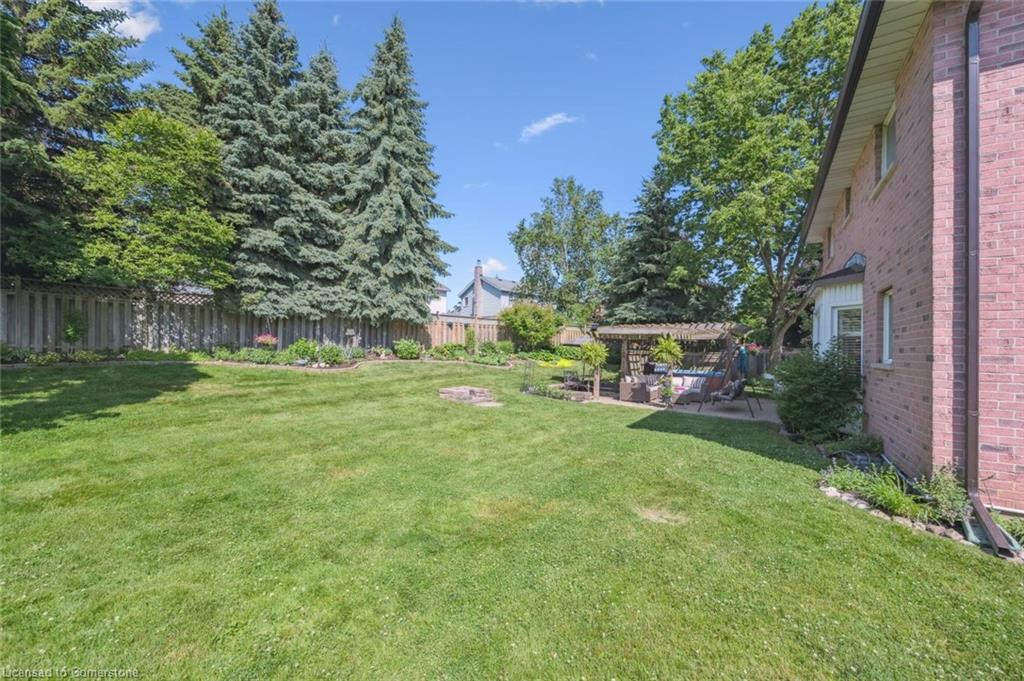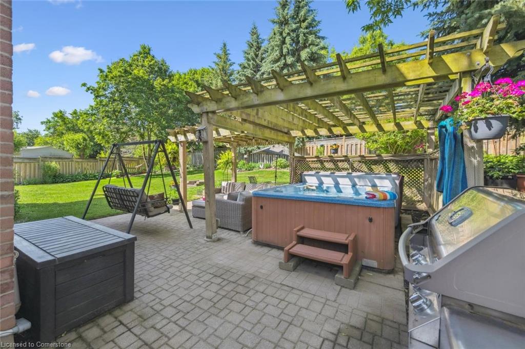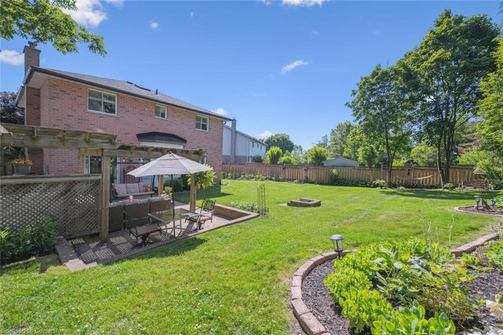 MOVE IN READY AND WELL MAINTANINED! All brick 2-storey home with 5 bedrooms and 4 bathrooms located in the Hespeler area of Cambridge with easy access to 401 Hwy for commuters. Built on a premium pool sized lot it has plenty to offer a family that has children, pets or extra live-in’s. The fenced-in yard boasts established perennial and vegetable gardens. Surrounding mature trees provide privacy for relaxation or entertaining on a pergola patio area with hot tub. Inside, this home includes a carpet free main floor family room with a wood burning brick fireplace and patio door. The connecting living room is bright and cheery with recessed lighting, a large window, H/W floors & crown molding. The dinning room also has H/W floors & large window overlooking the side gardens. Kitchen has a new quartz countertop installed in 2024 and includes S/S fridge, stove & microwave, Bosch B/I dishwasher. Dinette area has a bay window overlooking the rear yard, patio & hot tub. The sunny main floor Laundry room has 2pcs, large coat closet, storage cupboards and door leading to the 2 car garage. 2nd floor you will find 4 bedrooms with the Primary having a bright ensuite with W/I shower, heated tile flooring, skylight and plenty of counter space. There is still another 4 pc main bath located on the 2nd floor. If you require extra space the lower level is finished with a large rec-room with wet bar, counter, shelving & cupboards. There is also an extra oversized bedroom with W/I closet and a 3pc ensuite. Additional information: the staircase was updated in 2023, roof shingles 2024, eavestroughs 2023, primary ensuite 2022, H/W floors in living room, dining room, primary bedroom and upper hallway 2023, kitchen quartz counter 2024, water softener 2024. Garage Doors with openers 2021, both Skylights in 2020. Walking distance to schools, parks, arena, community centre, churches & close to great shopping and restaurants