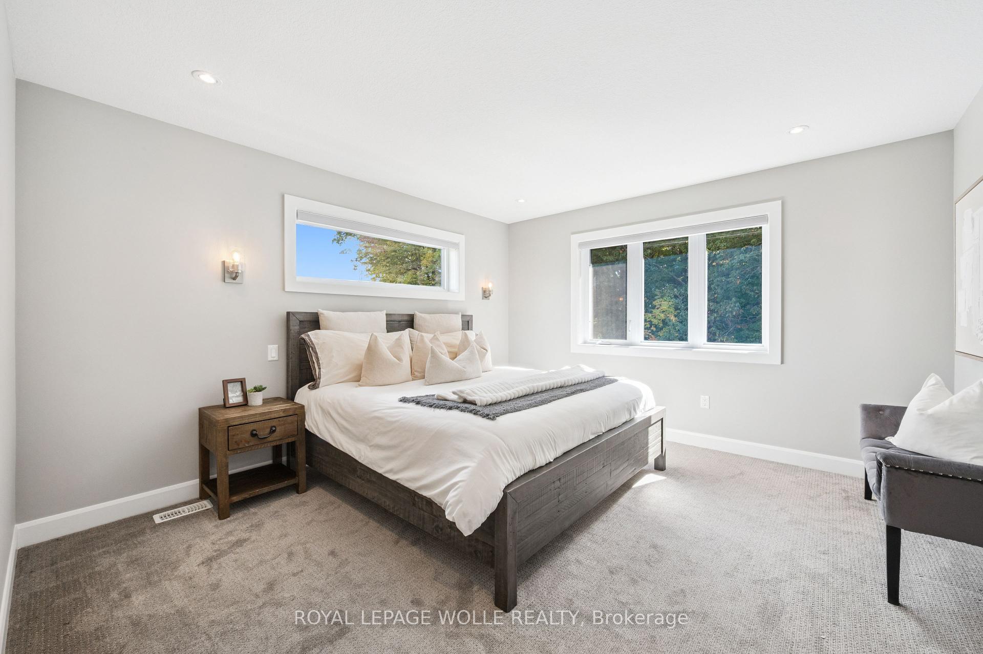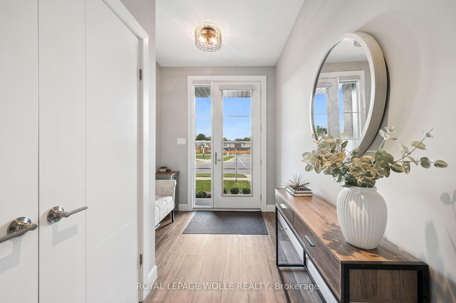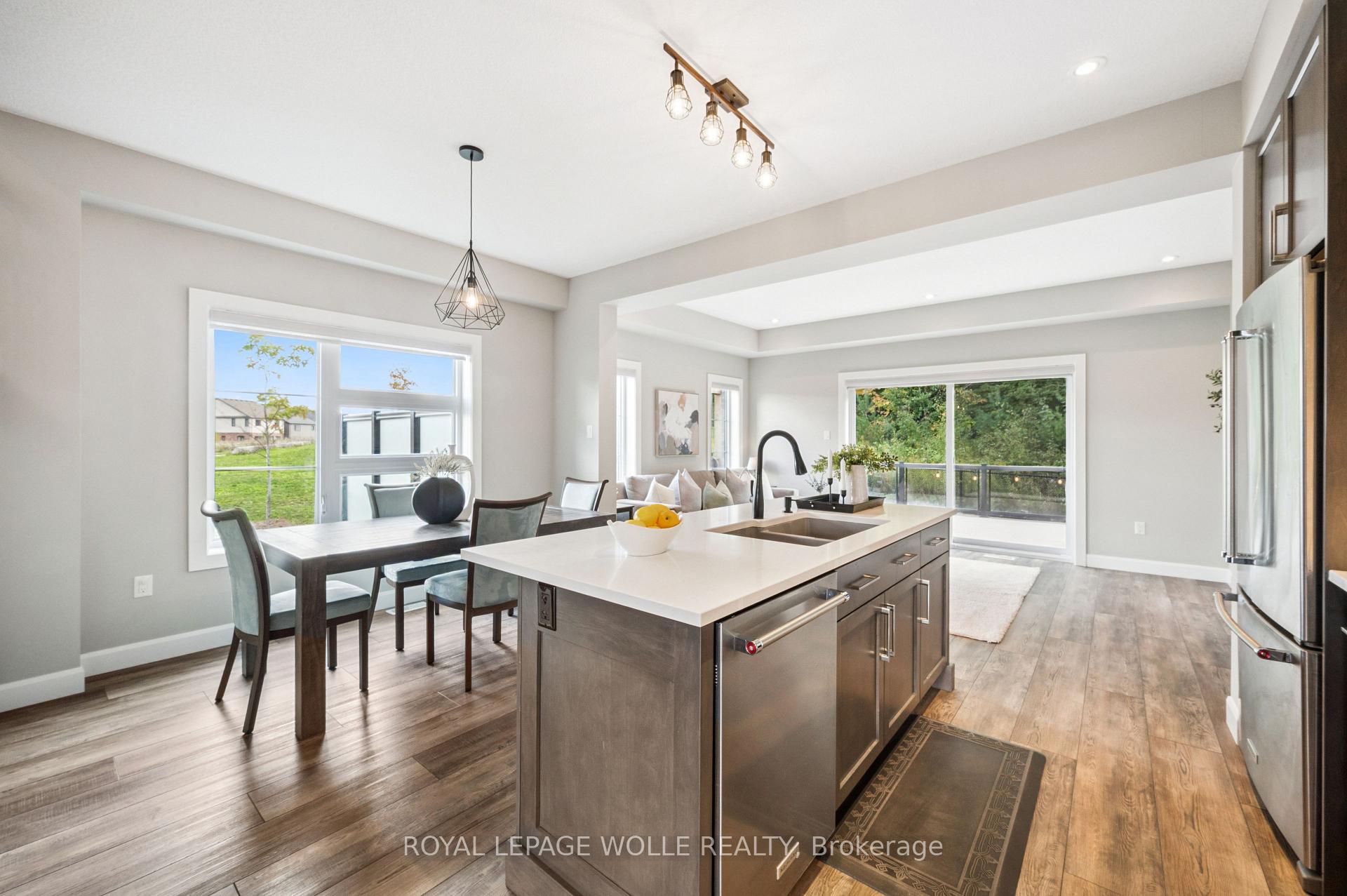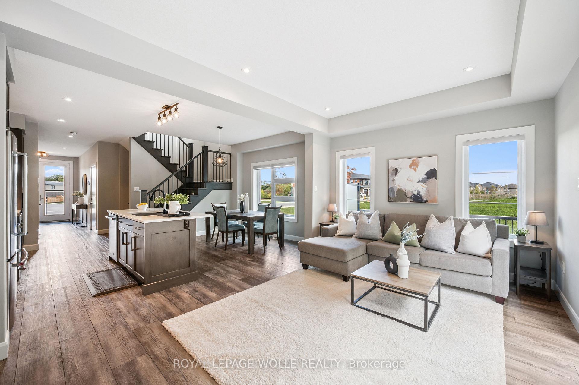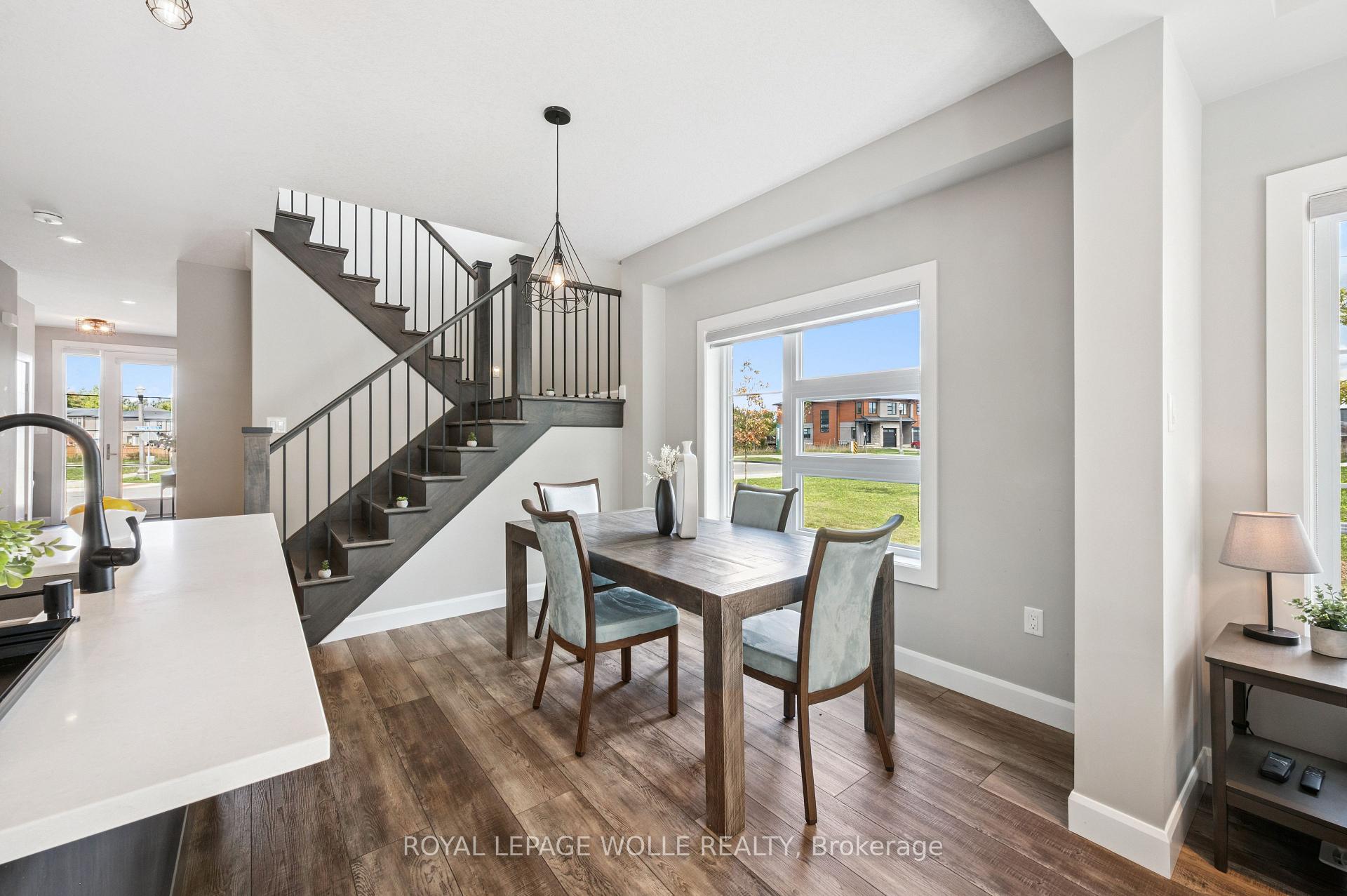 THIS IS THE ONE! Freehold END UNIT Townhome in highly desirable Doon, minutes to the 401, with RARE 1.5 car garage, DOUBLE WIDE driveway, backing AND siding onto greenspace! With upgrades galore, this home is finished top to bottom. From the moment you pull up, you’ll notice its stunning exterior, featuring contemporary brick, stonework, and Maibec horizontal wood siding, and a thoughtfully designed interior, blending sophisticated style with everyday comfort. Be greeted with 9′ ceilings on the main floor, a bright, open-concept main floor layout, ideal for entertaining. At the heart of the home is a designer kitchen with a show-stopping 10-foot island and breakfast bar seating for four. The spacious dining area and great room flow seamlessly together, framed by oversized patio doors leading to the expansive wrap around deck, backing onto private greenspace ideal for weekend lounging, friends and family gathering, or just a perfect night outside. A chic 2pc bath and hardwood floors throughout the main level add warmth and character. Upstairs, youll find three spacious bedrooms, two full baths, upstairs laundry and a versatile loft spaceperfect for a home office, play area, or creative nook. Wake up to a view of greenspace in the primary suite. A true standout offering SEPARATED walk-in closets, a fully upgraded spa-like ensuite with double vanity and custom glass walk-in shower. Downstairs, the finished basement offers even more flexible living space, featuring a luxurious 3-piece bath, rec room, and additional storage space. This home is perfect for anyone craving ample living space, the utmost care in upgrades and finishes, all within a central location.