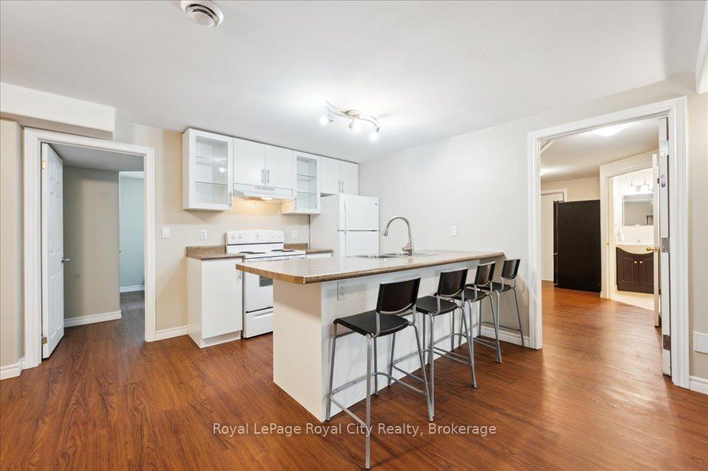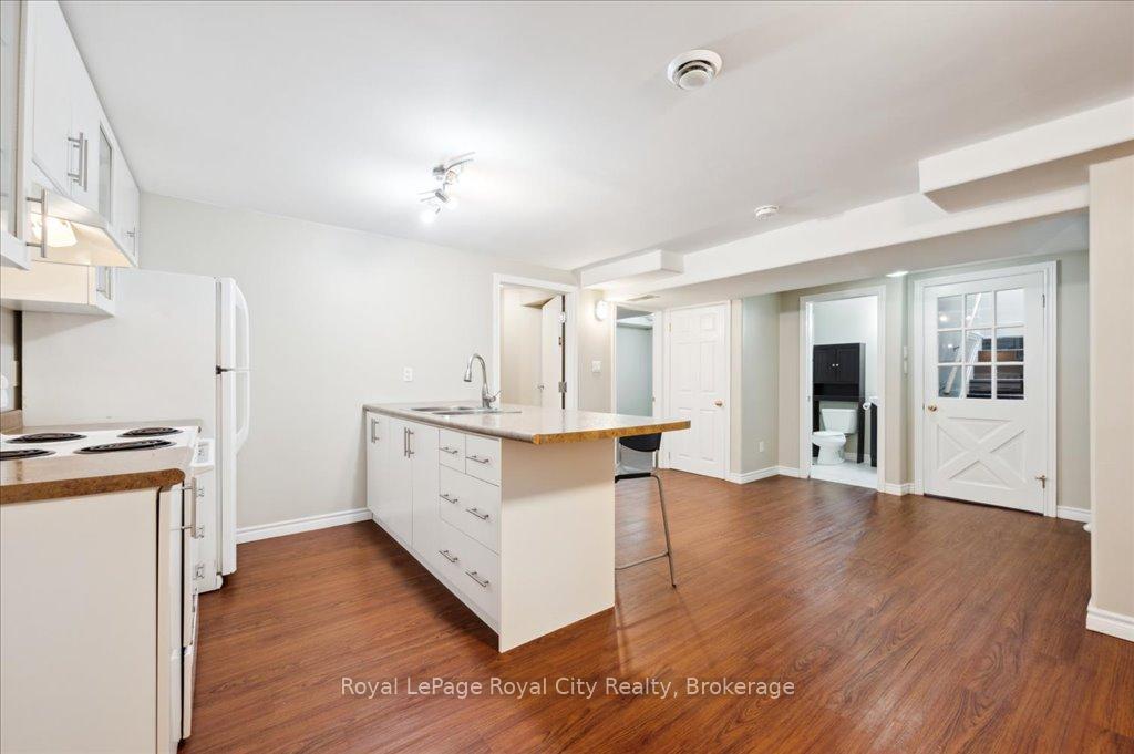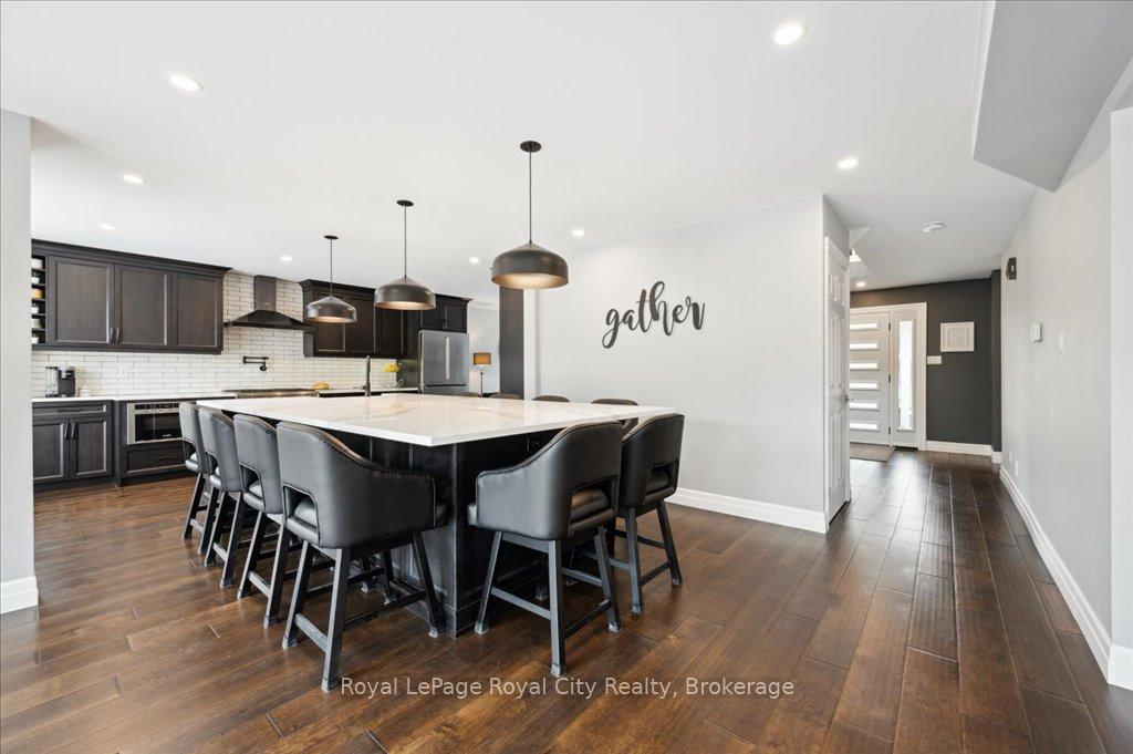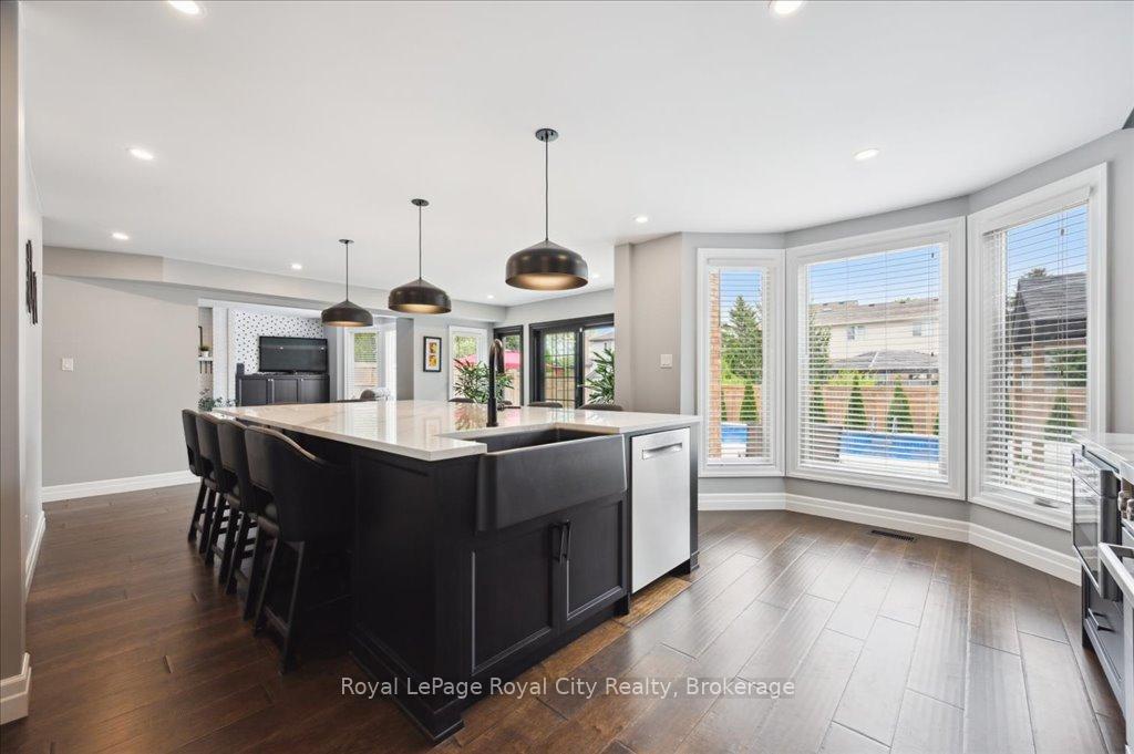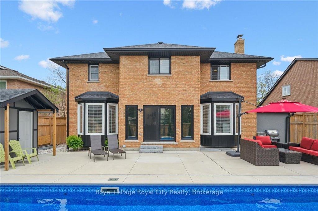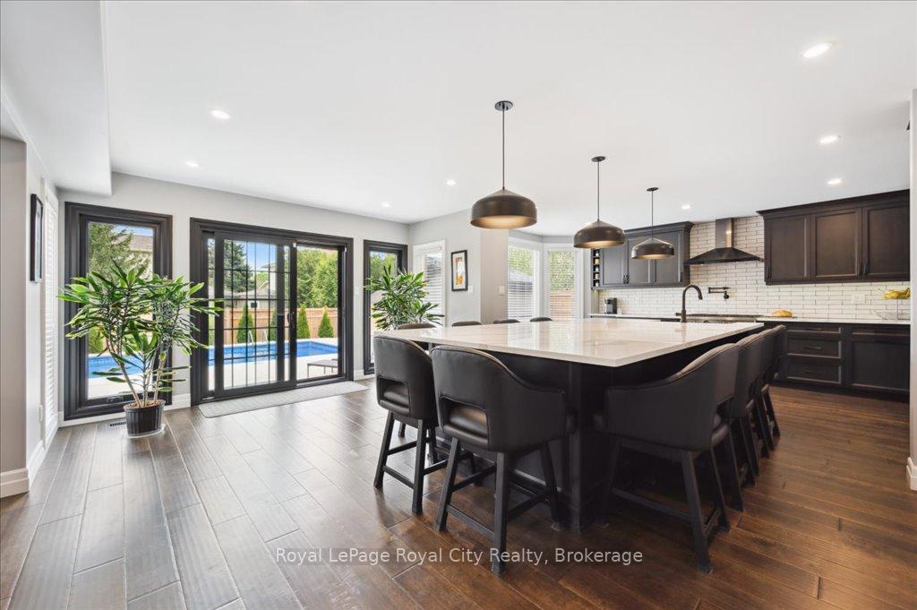Welcome to 9 Kortright Road East, where elegance meets everyday functionality in one of Guelphs most desirable neighborhoods. This beautifully renovated, two-storey brick home offers exceptional curb appeal with a double garage, interlock driveway, modern garage/front door, and mature landscaping. Step inside to a grand foyer with a curved wooden staircase and soaring ceilings, setting the tone for the refined interiors throughout. The heart of the home is the stunning chefs kitchen, featuring an oversized quartz island with seating for ten, sleek black cabinetry, a built in pot-filler, and statement lighting. Stunning glass sliding doors and picture windows provide panoramic views and seamless access to the resort-style backyard with a heated pool ideal for summer entertaining and relaxing. Enjoy the thoughtfully designed layout with spacious principal rooms, including a formal living room and cozy family room with accent wall and brick fireplace. Upstairs, the primary suite is a luxurious retreat, featuring a 4pc bathroom with soaker tub and walk-in closet. The second bedroom includes a secondary bedroom/dressing room which has its own entrance to the shared 4pc bathroom, while the third bedroom is also generous in size. Downstairs, find a 2-bedroom basement apartment with ample living space. Separating the apartment is a door that takes you through to the exercise room. Enjoy the footprint of your basement while having an entirely separate suite. This meticulously maintained home is move-in ready with countless upgrades and located just minutes from top-rated schools, the University of Guelph, shopping, transit, and parks.