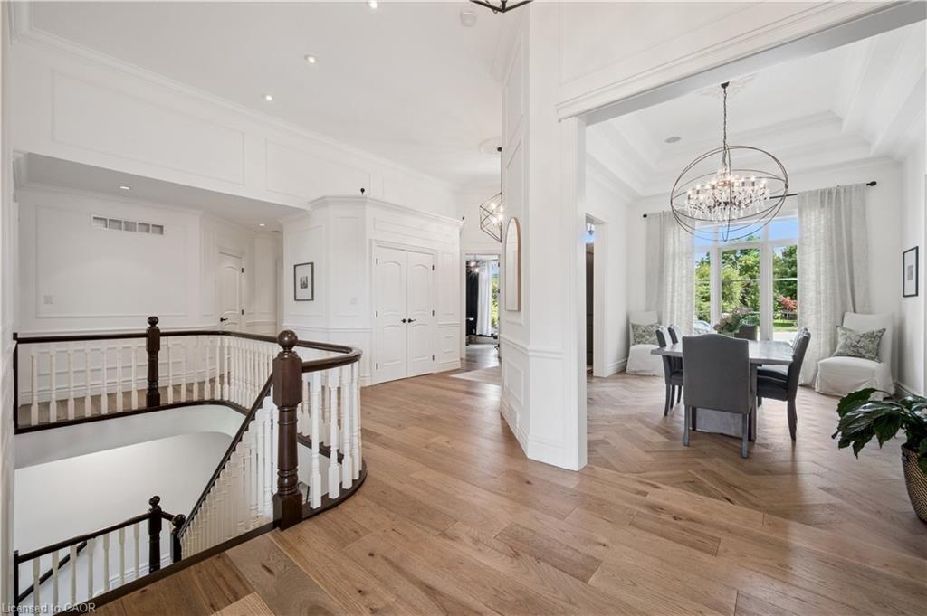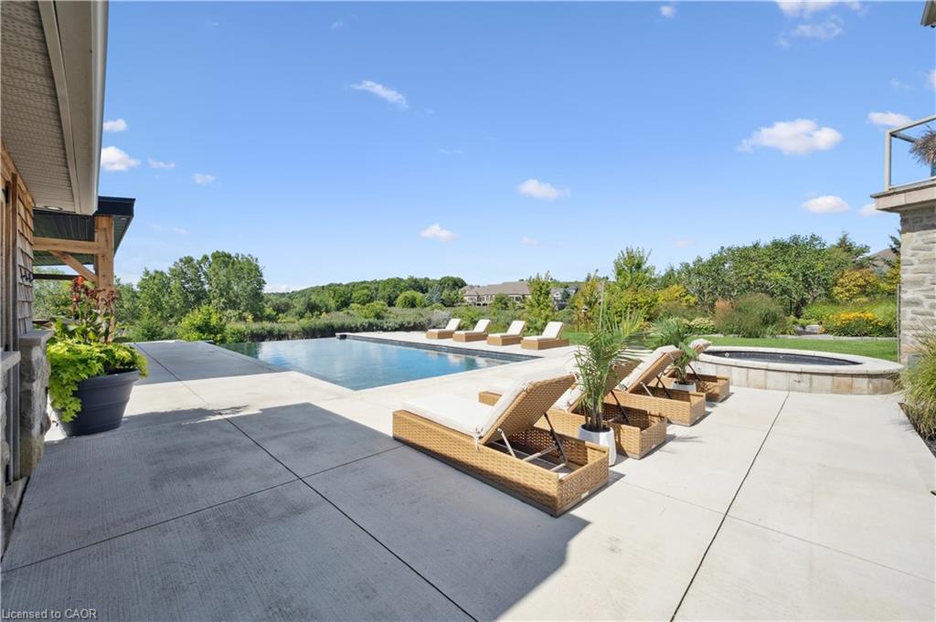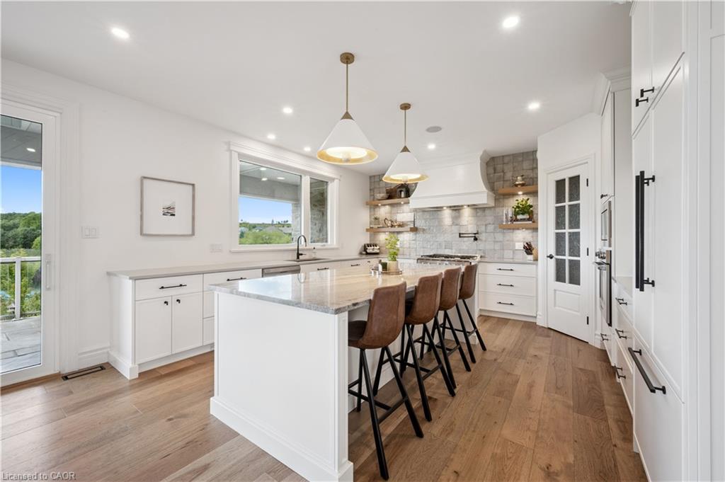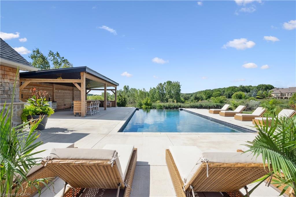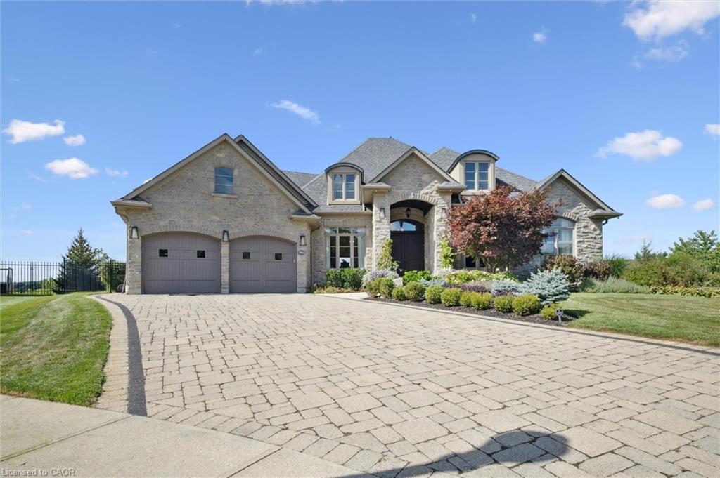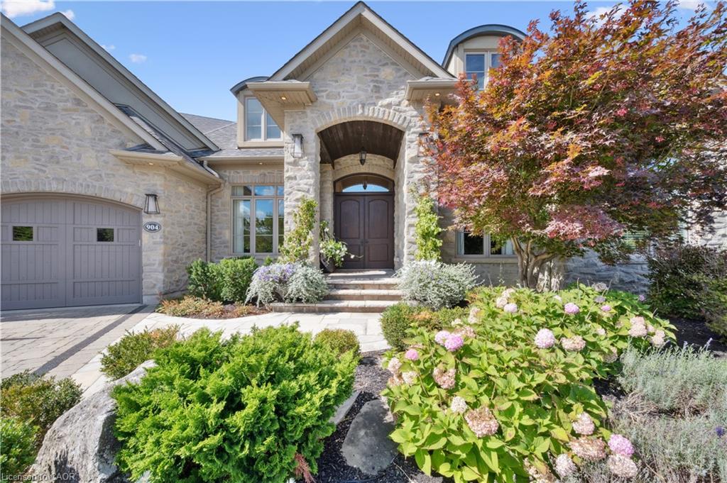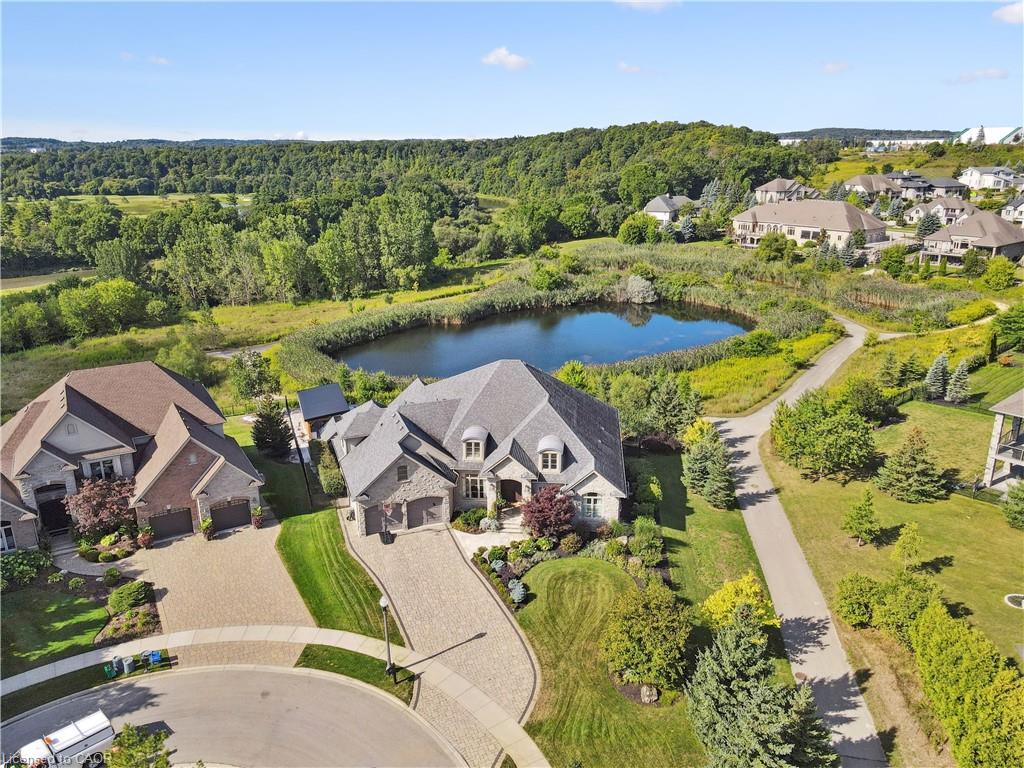 904 River Birch Court offers one of the most premier residential views in the City of Kitchener. This estate sits atop the Grand River Valley, providing views of the river floor, protected forests, and even a quaint local pond. The custom home spans its 90-foot frontage and is surrounded by perennial gardens leading up to a grand front entrance. Inside, a gracious foyer is accented by hardwood herringbone floors, impressive millwork and designer lighting. Families will likely spend most of their time in the large, eat-in chef’s kitchen with floor-to-ceiling views of the river valley and resort-like backyard; or walk out to the covered porch to take the views directly. Off the kitchen is a rustic family room with a Muskoka stone fireplace and vaulted ceilings. Further features on the main floor are a convenient front office, a gorgeous dining room with trayed ceilings and a chandelier, and a sage green Parisienne laundry room that has its own wrought iron spiral staircase leading down to the backyard amenities. The primary wing includes a vast walk-in closet and a luxurious 5-piece ensuite with a standalone soaker tub. A second bedroom on the main floor also includes a 3-piece en-suite and a walk-in closet. The third bedroom is located on the second floor’s bunga-loft, a self-contained floor with a bedroom, 3-piece bathroom, and walk-in closet. The walk-out lower level complements this luxury residence with a vast recreational space, highlighted by another feature stone fireplace, a home gym, two additional bedrooms (for a total of 5), a family room or second office with its own gas fireplace, and two more bathrooms (for a total of 6). But wait, there’s more! The backyard of this home has been transformed into a resort-like setting, featuring an infinity pool that cascades down towards the valley, a poolside cabana, and a stone-clad hot tub. This property offers up an exceptional opportunity to live in one of Kitchener’s most sought after and exclusive locations.