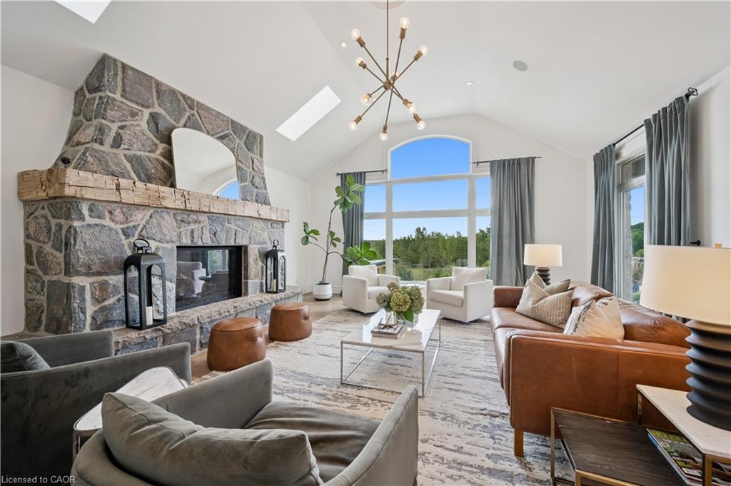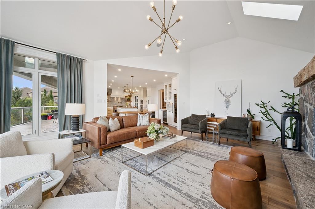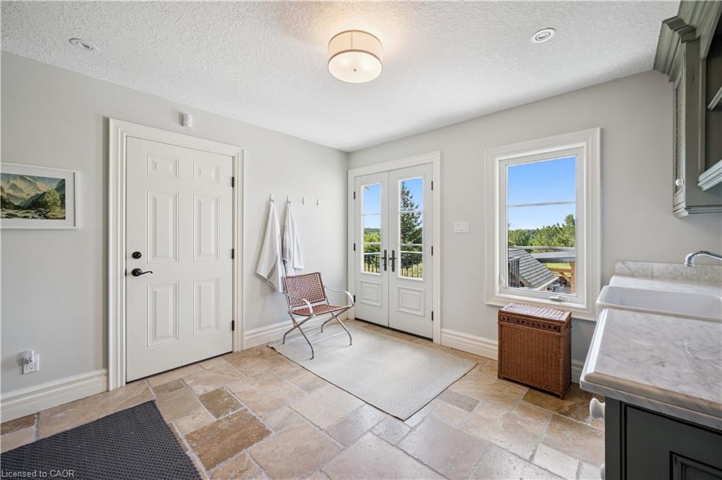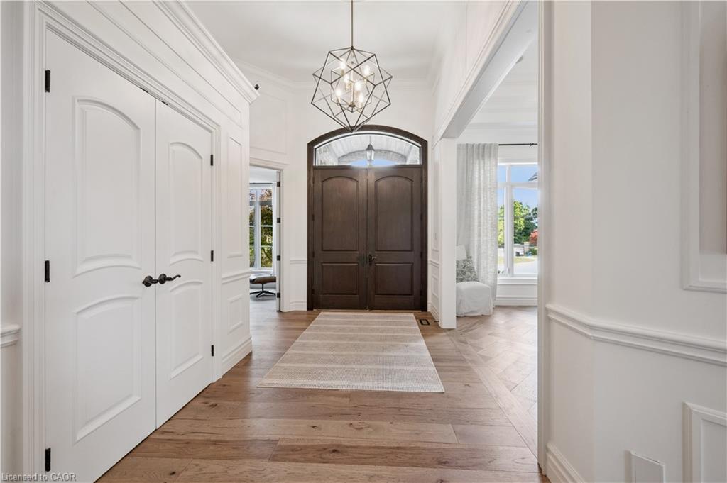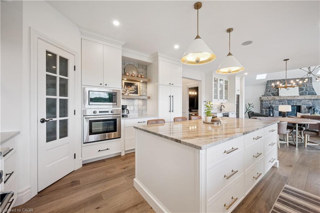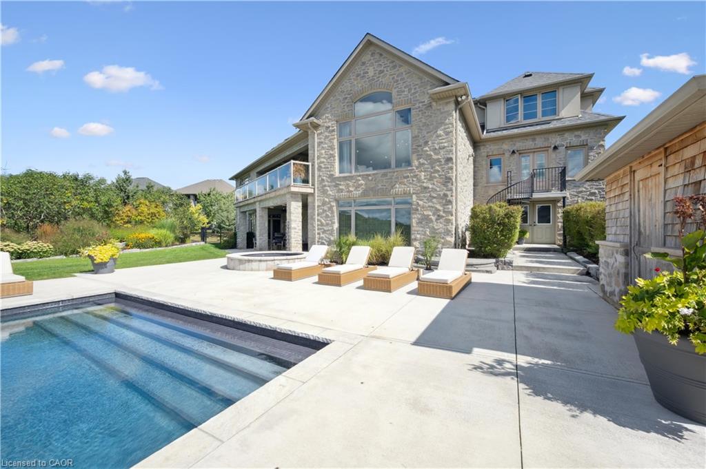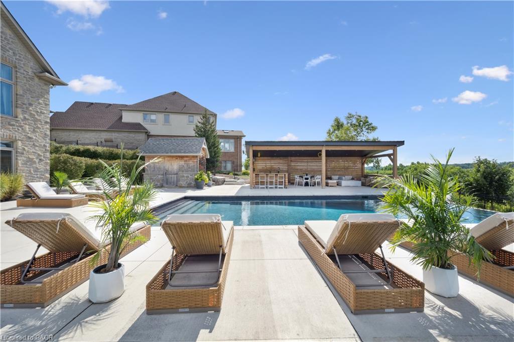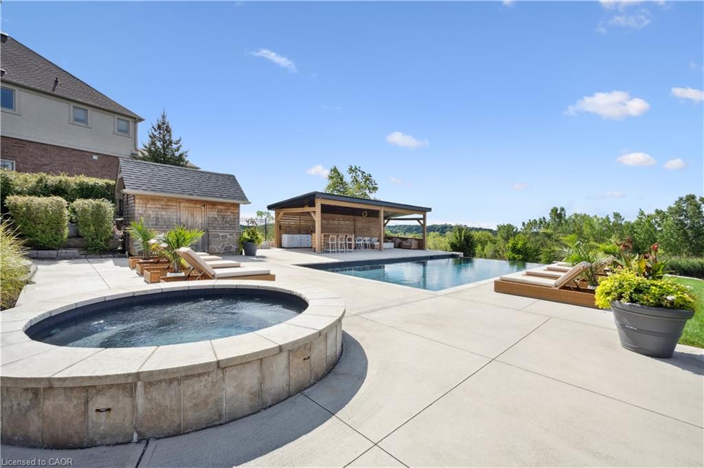 904 River Birch Court offers one of the most premier residential views in the City of Kitchener. This estate sits atop the Grand River Valley, providing views of the river floor, protected forests, and even a quaint local pond. The custom home spans its 90-foot frontage and is surrounded by perennial gardens leading up to a grand front entrance. Inside, a gracious foyer is accented by hardwood herringbone floors, impressive millwork and designer lighting. Families will likely spend most of their time in the large, eat-in chef’s kitchen with floor-to-ceiling views of the river valley and resort-like backyard; or walk out to the covered porch to take the views directly. Off the kitchen is a rustic family room with a Muskoka stone fireplace and vaulted ceilings. Further features on the main floor are a convenient front office, a gorgeous dining room with trayed ceilings and a chandelier, and a sage green Parisienne laundry room that has its own wrought iron spiral staircase leading down to the backyard amenities. The primary wing includes a vast walk-in closet and a luxurious 5-piece ensuite with a standalone soaker tub. A second bedroom on the main floor also includes a 3-piece en-suite and a walk-in closet. The third bedroom is located on the second floor’s bunga-loft, a self-contained floor with a bedroom, 3-piece bathroom, and walk-in closet. The walk-out lower level complements this luxury residence with a vast recreational space, highlighted by another feature stone fireplace, a home gym, two additional bedrooms (for a total of 5), a family room or second office with its own gas fireplace, and two more bathrooms (for a total of 6). But wait, there’s more! The backyard of this home has been transformed into a resort-like setting, featuring an infinity pool that cascades down towards the valley, a poolside cabana, and a stone-clad hot tub. This property offers up an exceptional opportunity to live in one of Kitchener’s most sought after and exclusive locations.