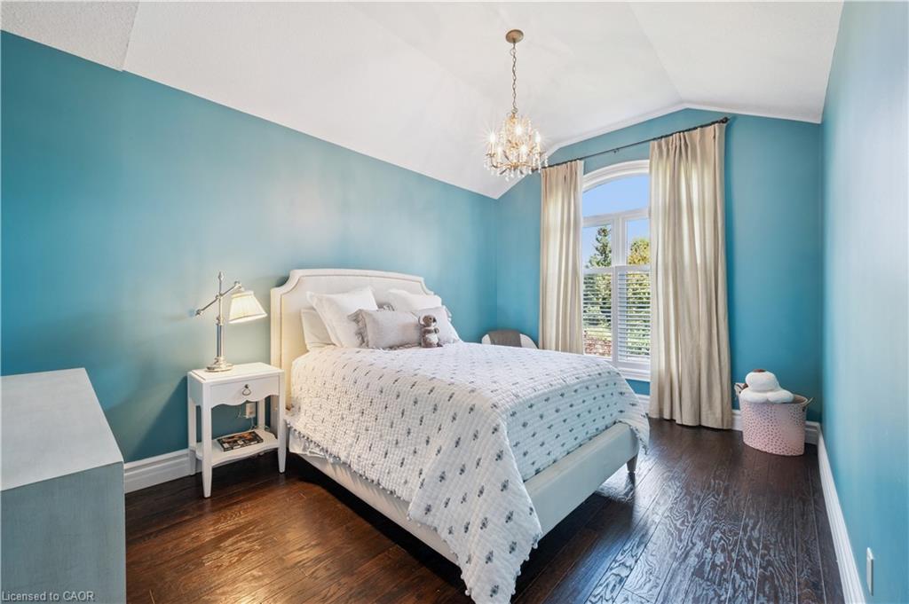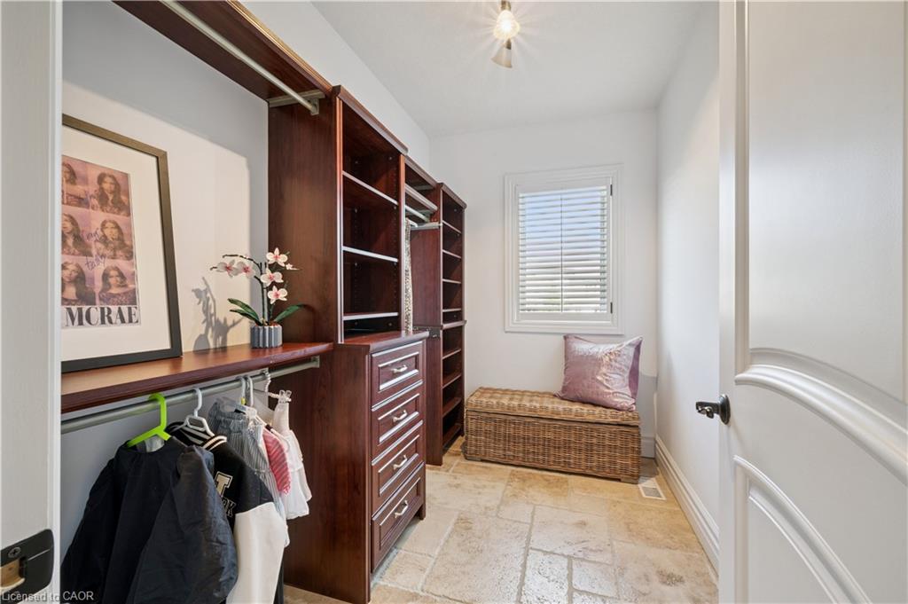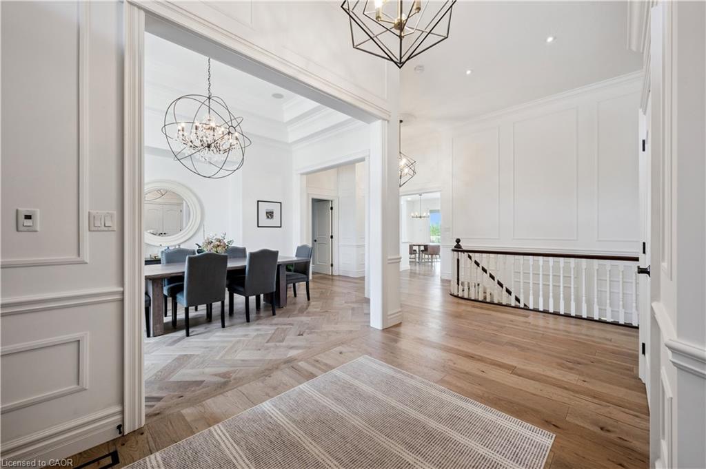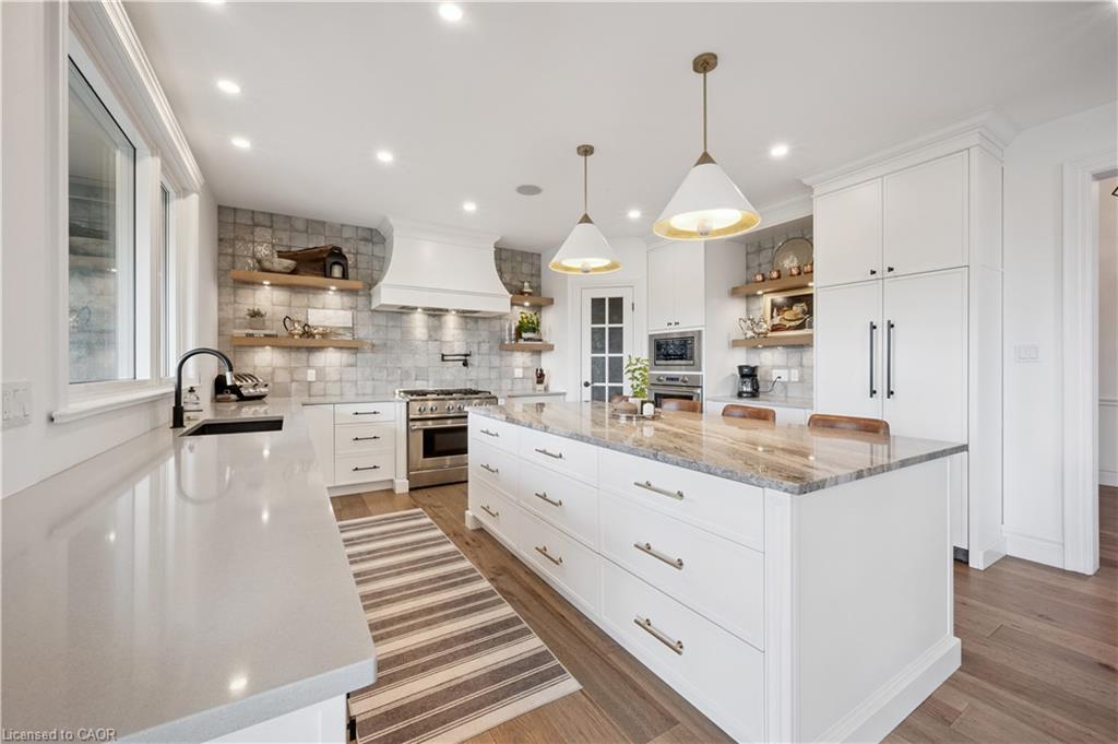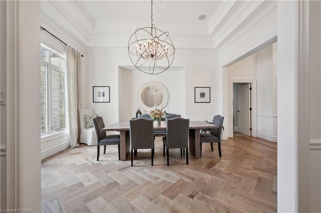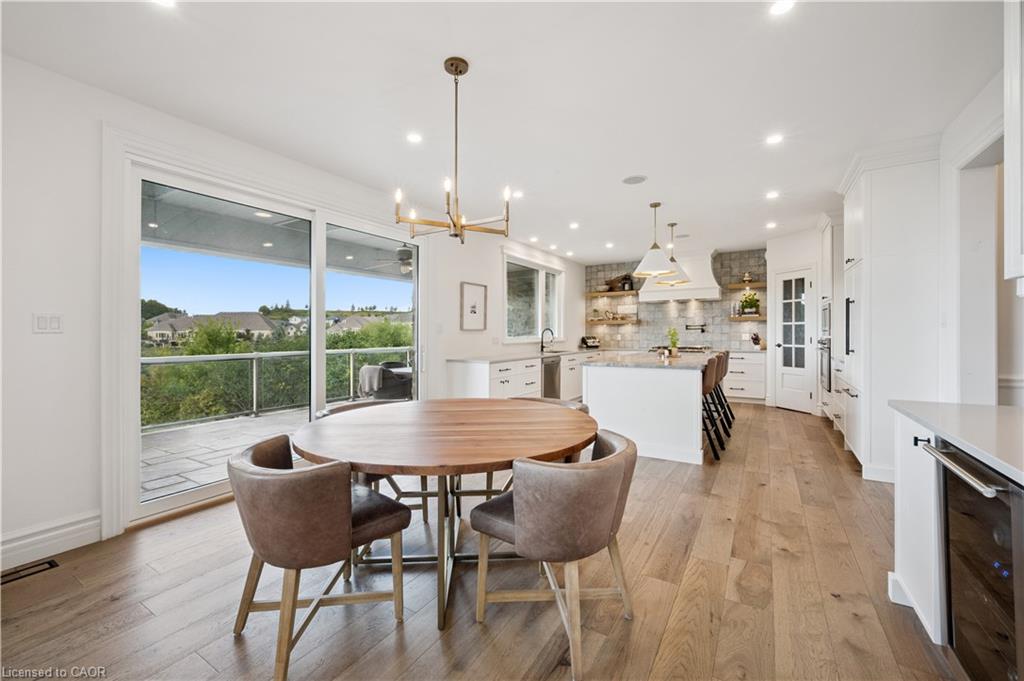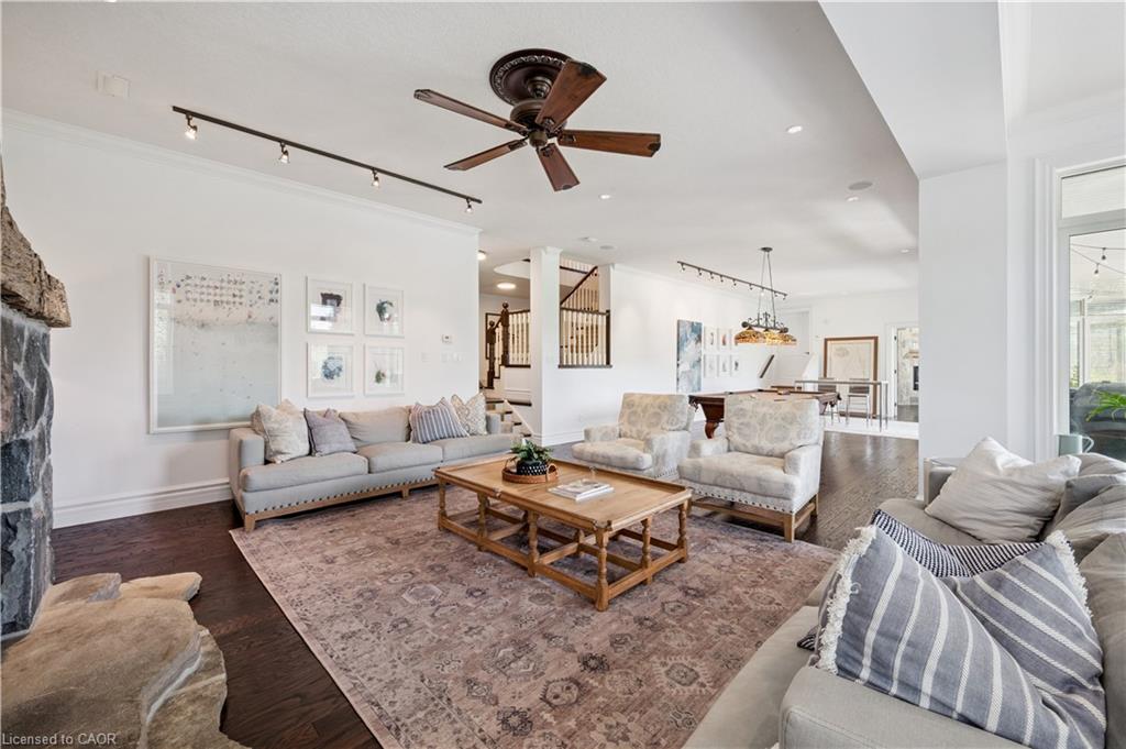 904 River Birch Court offers one of the most premier residential views in the City of Kitchener. This estate sits atop the Grand River Valley, providing views of the river floor, protected forests, and even a quaint local pond. The custom home spans its 90-foot frontage and is surrounded by perennial gardens leading up to a grand front entrance. Inside, a gracious foyer is accented by hardwood herringbone floors, impressive millwork and designer lighting. Families will likely spend most of their time in the large, eat-in chef’s kitchen with floor-to-ceiling views of the river valley and resort-like backyard; or walk out to the covered porch to take the views directly. Off the kitchen is a rustic family room with a Muskoka stone fireplace and vaulted ceilings. Further features on the main floor are a convenient front office, a gorgeous dining room with trayed ceilings and a chandelier, and a sage green Parisienne laundry room that has its own wrought iron spiral staircase leading down to the backyard amenities. The primary wing includes a vast walk-in closet and a luxurious 5-piece ensuite with a standalone soaker tub. A second bedroom on the main floor also includes a 3-piece en-suite and a walk-in closet. The third bedroom is located on the second floor’s bunga-loft, a self-contained floor with a bedroom, 3-piece bathroom, and walk-in closet. The walk-out lower level complements this luxury residence with a vast recreational space, highlighted by another feature stone fireplace, a home gym, two additional bedrooms (for a total of 5), a family room or second office with its own gas fireplace, and two more bathrooms (for a total of 6). But wait, there’s more! The backyard of this home has been transformed into a resort-like setting, featuring an infinity pool that cascades down towards the valley, a poolside cabana, and a stone-clad hot tub. This property offers up an exceptional opportunity to live in one of Kitchener’s most sought after and exclusive locations.