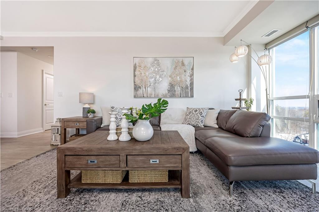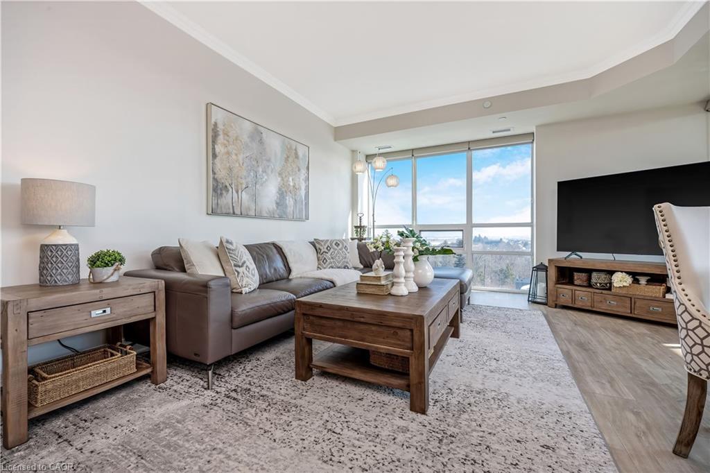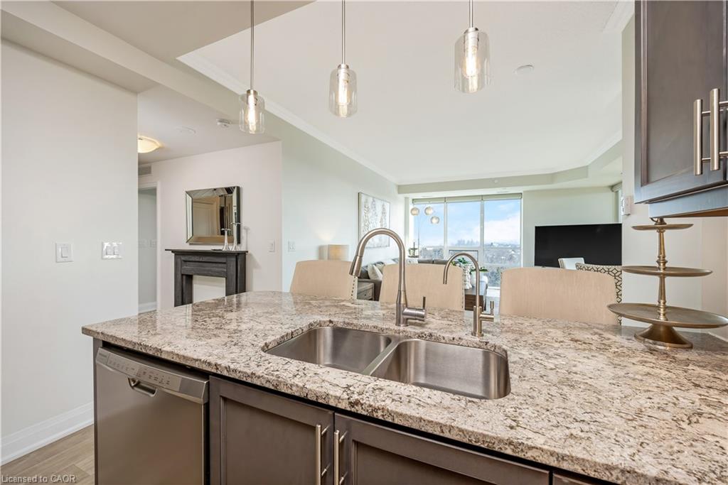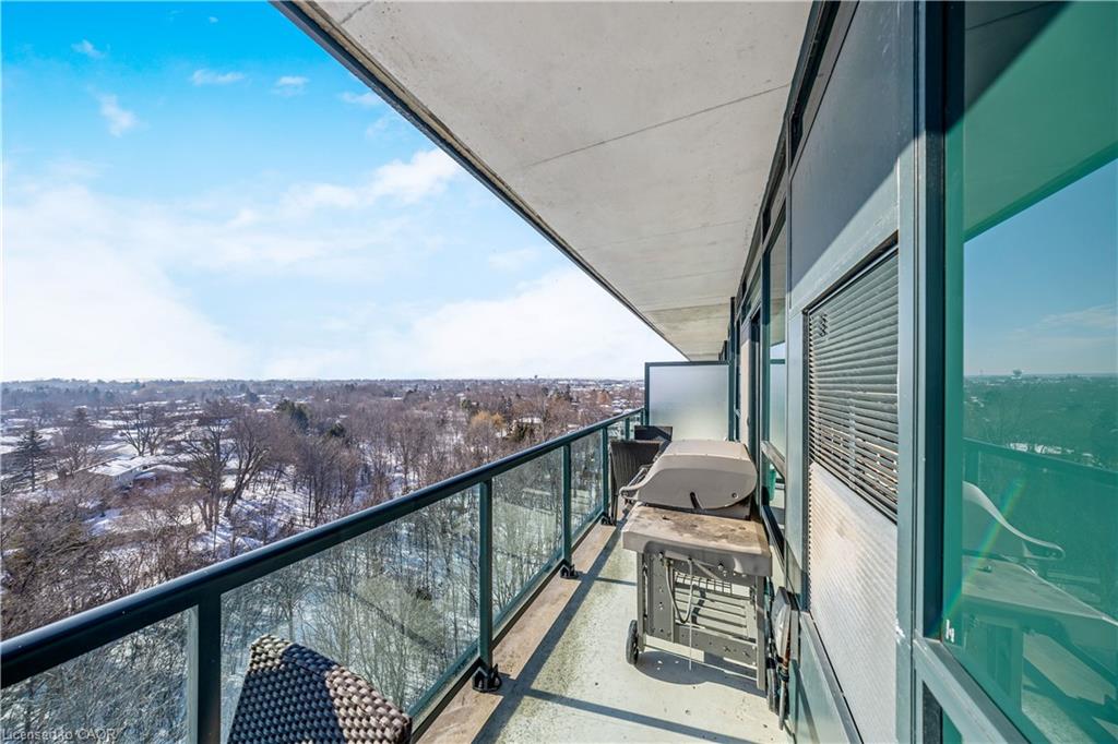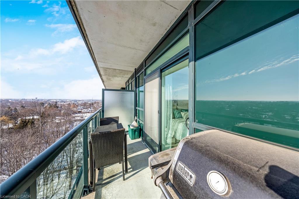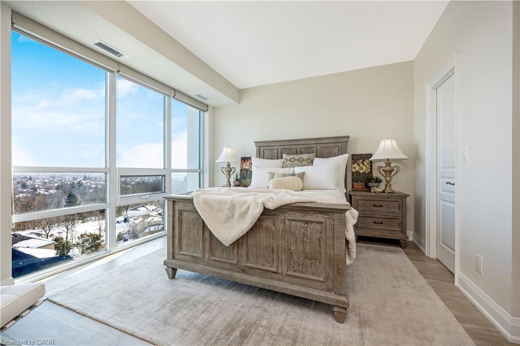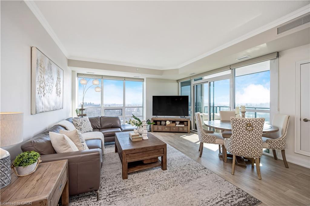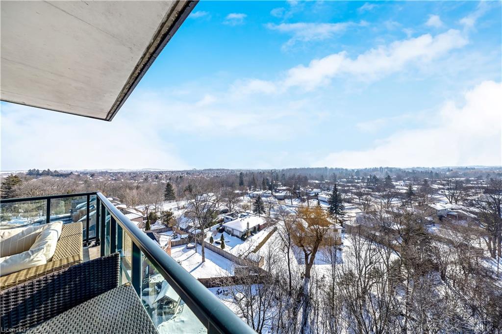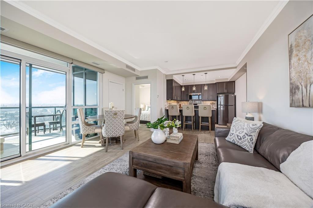Stunning upper floor 2 bedroom, 2 bathroom condo offering breathtaking views of the Mississauga and Toronto skylines! This beautifully appointed unit combines elegant living with modern comfort and convenient access to major commuter routes. The welcoming front foyer features upgraded wide plank laminate flooring, pot lighting, and generous storage with a double mirrored closet and a separate laundry closet. The bright and spacious open concept living and dining area is filled with natural light from three south facing windows, showcasing scenic views of the Hungry Hollow ravine and trailway. A walk out from the living room leads to an expansive west facing approximately 250 square foot balcony, perfect for enjoying sunsets, relaxing, or entertaining outdoors. The modern kitchen is thoughtfully designed and also includes upgraded wide plank laminate flooring, quartz countertops with an extended breakfast bar featuring rounded edge detail, pot lights, stylish pendant lighting, and a full suite of new stainless steel Frigidaire appliances, including a gas stove. An undermount double sink with reverse osmosis filtered water completes the space. The primary bedroom offers two south facing windows with tranquil views, a walk-in closet, pot lights, and a private four-piece ensuite featuring a walk in glass shower. The second bedroom includes a double closet, west facing windows, and a sliding door with direct walk out to the balcony. A four-piece main bathroom with ceramic flooring and a tub shower combination completes the unit. Building amenities include a fitness room, residents lounge, outdoor patio with BBQ, secure lobby with mail and parcel lockers, on site maintenance office, two elevators, and underground parking. Ideally located close to shopping, dining, parks, and trails, this condo offers exceptional convenience for everyday living. A fantastic opportunity to enjoy low maintenance living in a sophisticated and stylish residence in the heart of Georgetown.