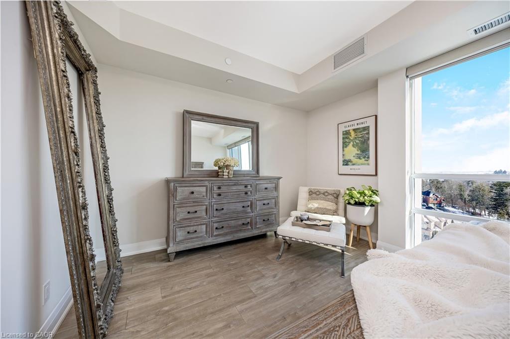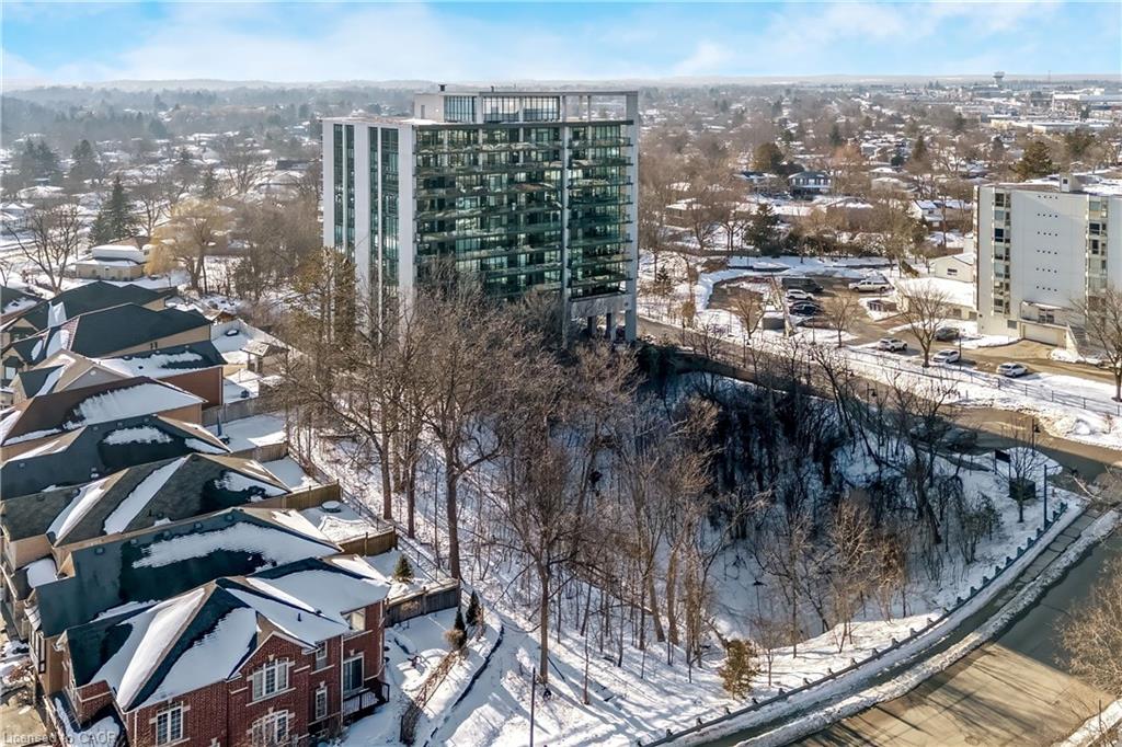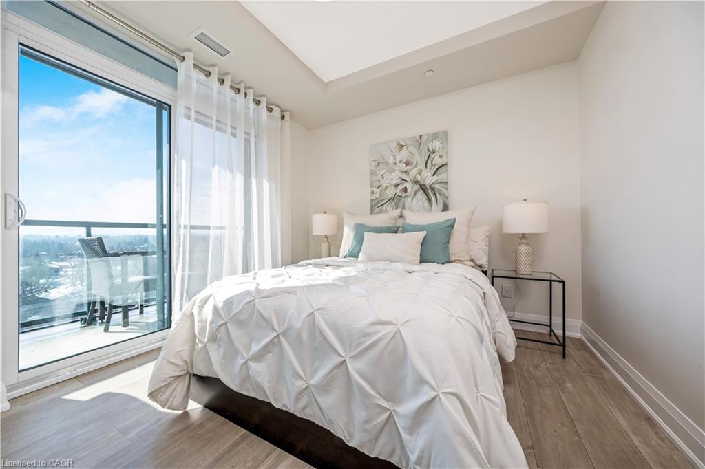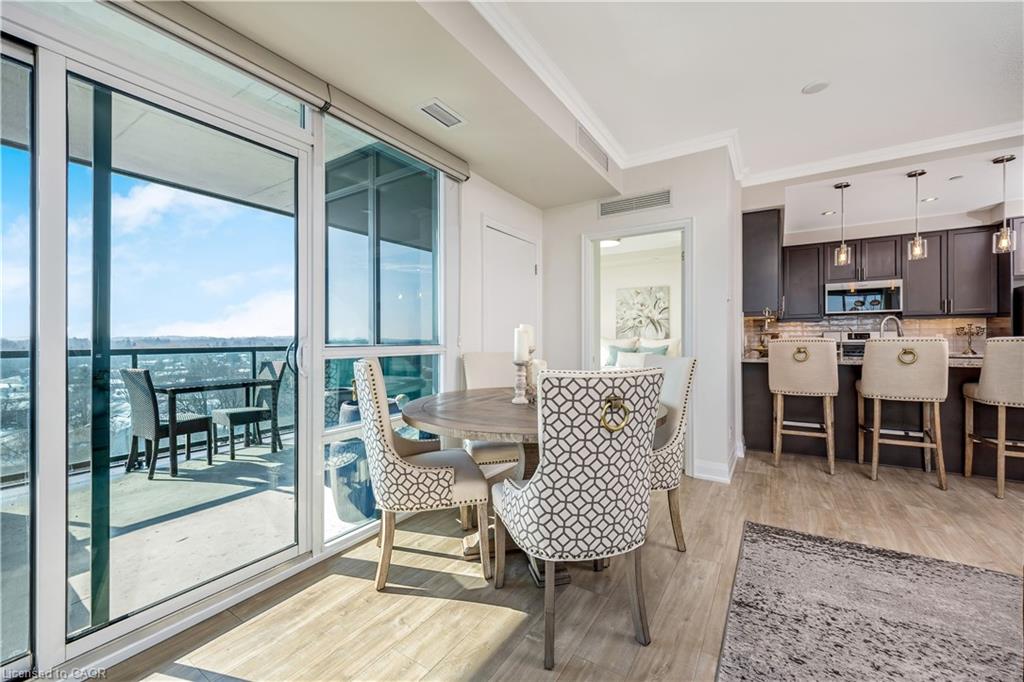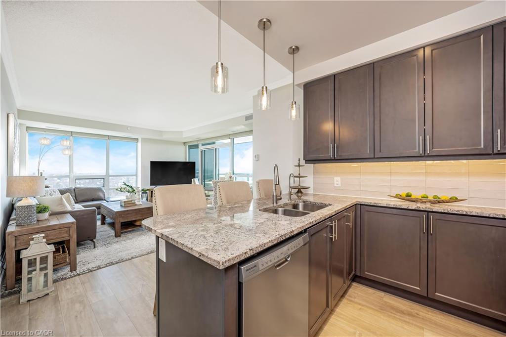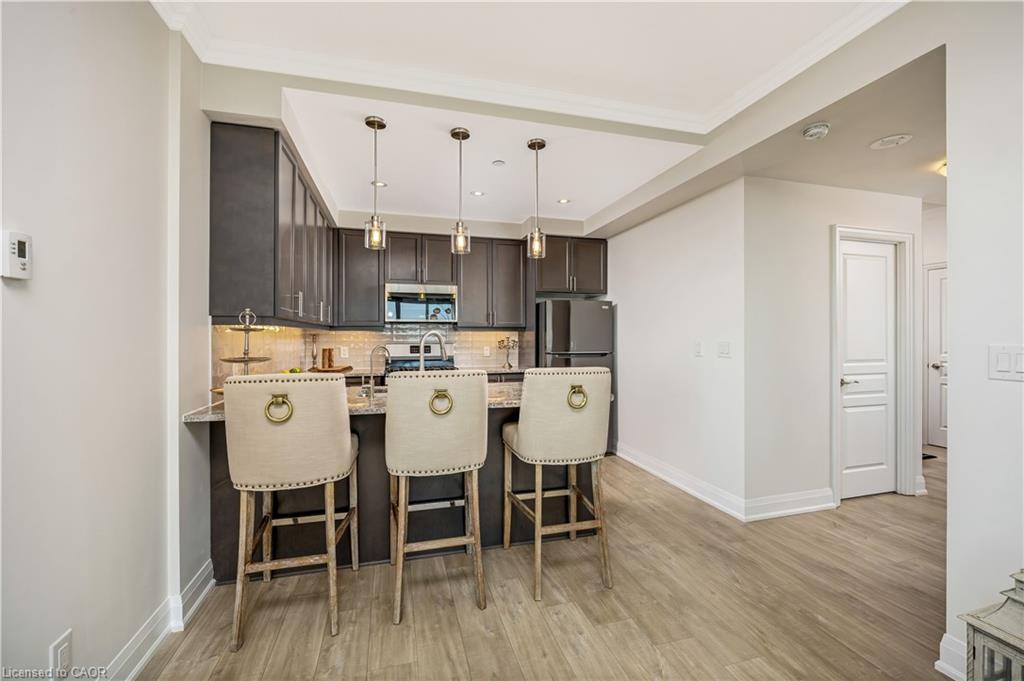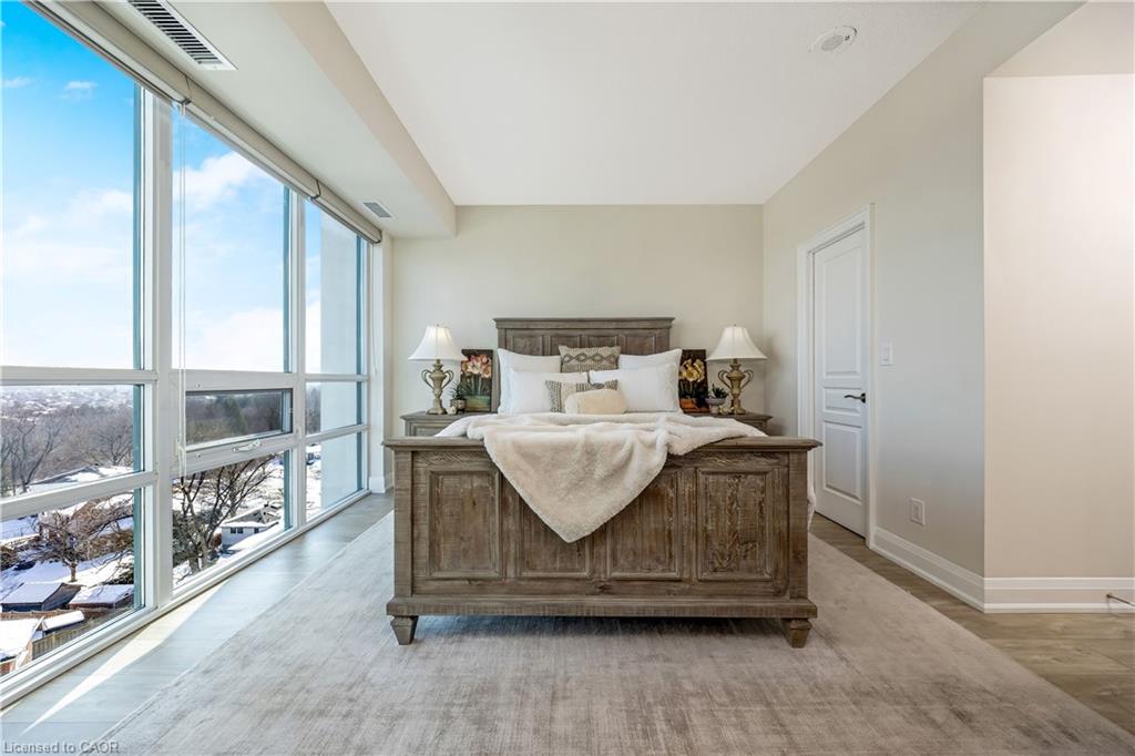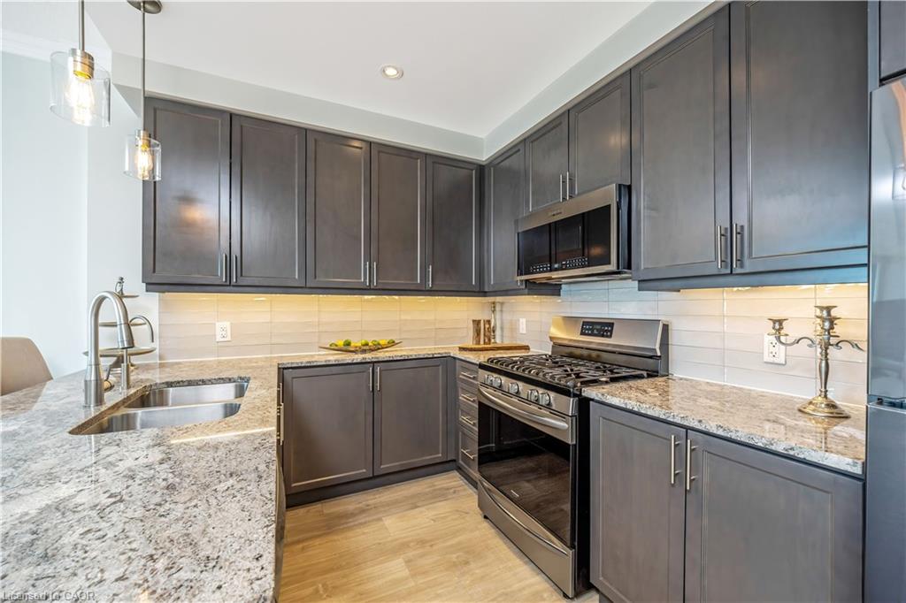 Stunning upper floor 2 bedroom, 2 bathroom condo offering breathtaking views of the Mississauga and Toronto skylines! This beautifully appointed unit combines elegant living with modern comfort and convenient access to major commuter routes. The welcoming front foyer features upgraded wide plank laminate flooring, pot lighting, and generous storage with a double mirrored closet and a separate laundry closet. The bright and spacious open concept living and dining area is filled with natural light from three south facing windows, showcasing scenic views of the Hungry Hollow ravine and trailway. A walk out from the living room leads to an expansive west facing approximately 250 square foot balcony, perfect for enjoying sunsets, relaxing, or entertaining outdoors. The modern kitchen is thoughtfully designed and also includes upgraded wide plank laminate flooring, quartz countertops with an extended breakfast bar featuring rounded edge detail, pot lights, stylish pendant lighting, and a full suite of new stainless steel Frigidaire appliances, including a gas stove. An undermount double sink with reverse osmosis filtered water completes the space. The primary bedroom offers two south facing windows with tranquil views, a walk-in closet, pot lights, and a private four-piece ensuite featuring a walk in glass shower. The second bedroom includes a double closet, west facing windows, and a sliding door with direct walk out to the balcony. A four-piece main bathroom with ceramic flooring and a tub shower combination completes the unit. Building amenities include a fitness room, residents lounge, outdoor patio with BBQ, secure lobby with mail and parcel lockers, on site maintenance office, two elevators, and underground parking. Ideally located close to shopping, dining, parks, and trails, this condo offers exceptional convenience for everyday living. A fantastic opportunity to enjoy low maintenance living in a sophisticated and stylish residence in the heart of Georgetown.