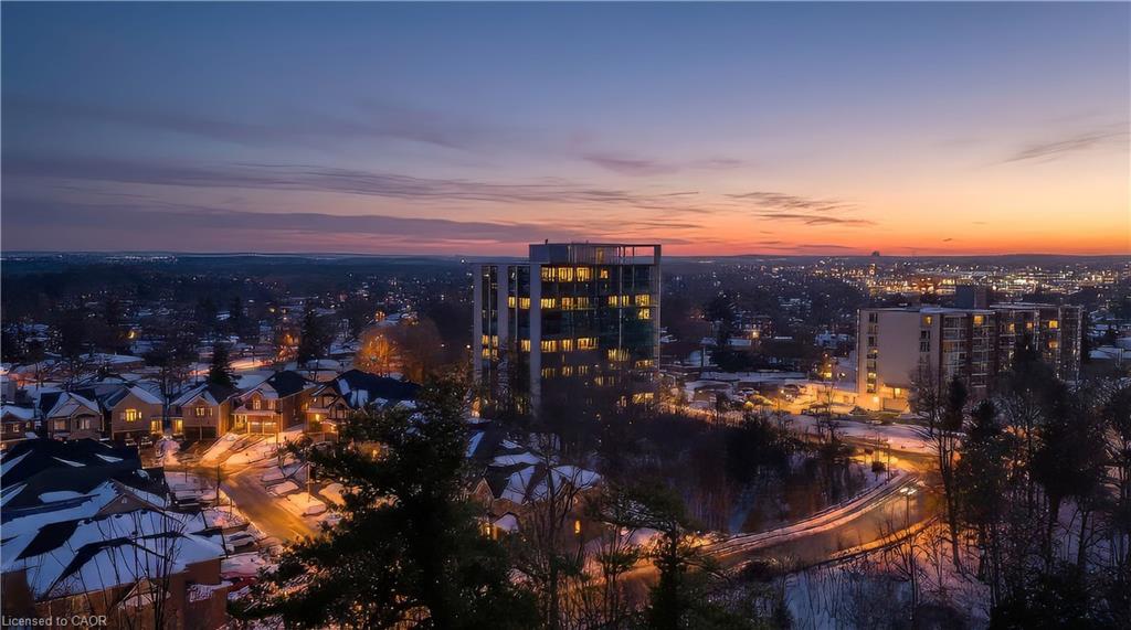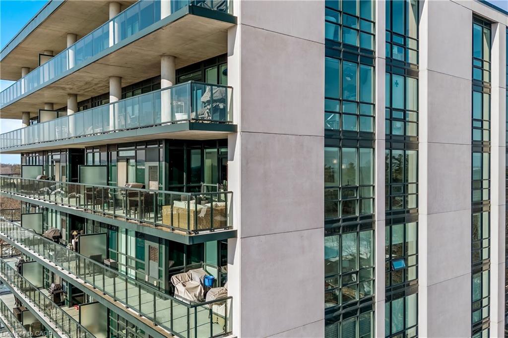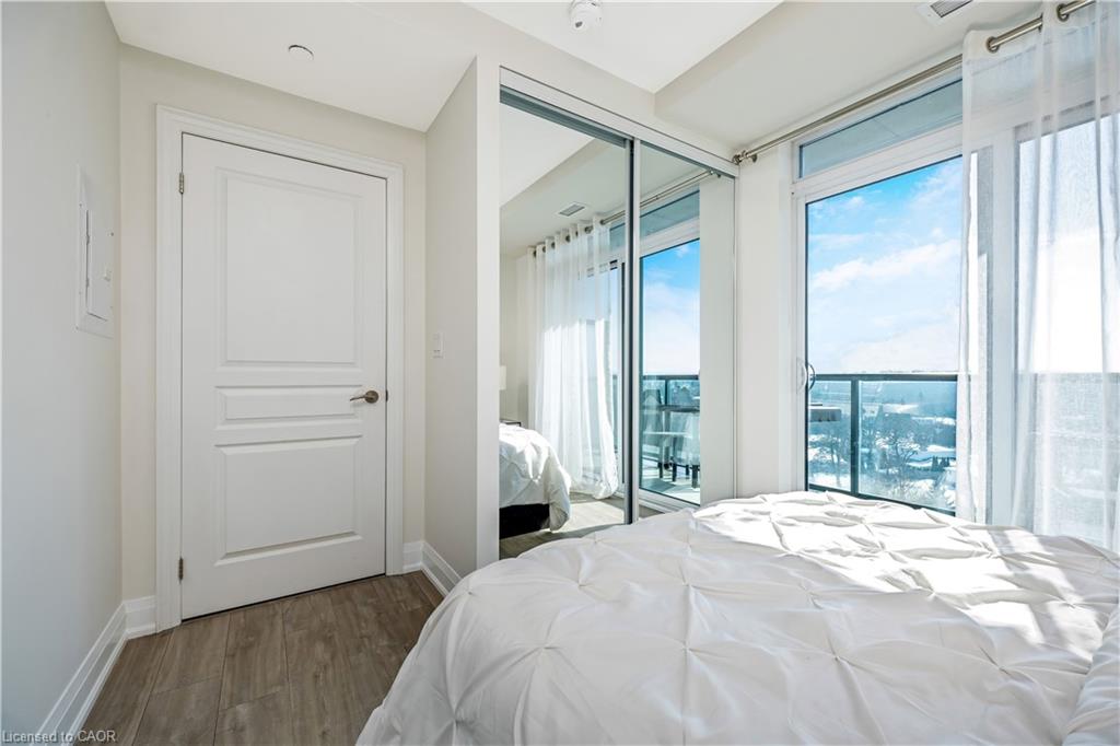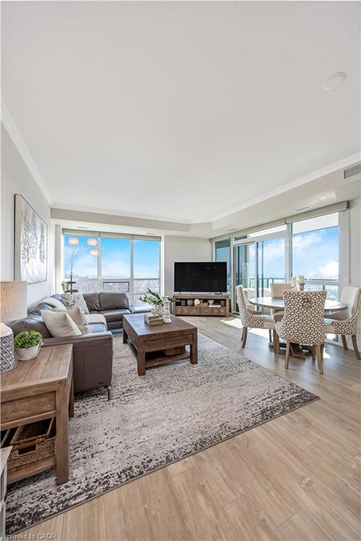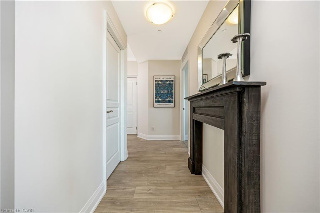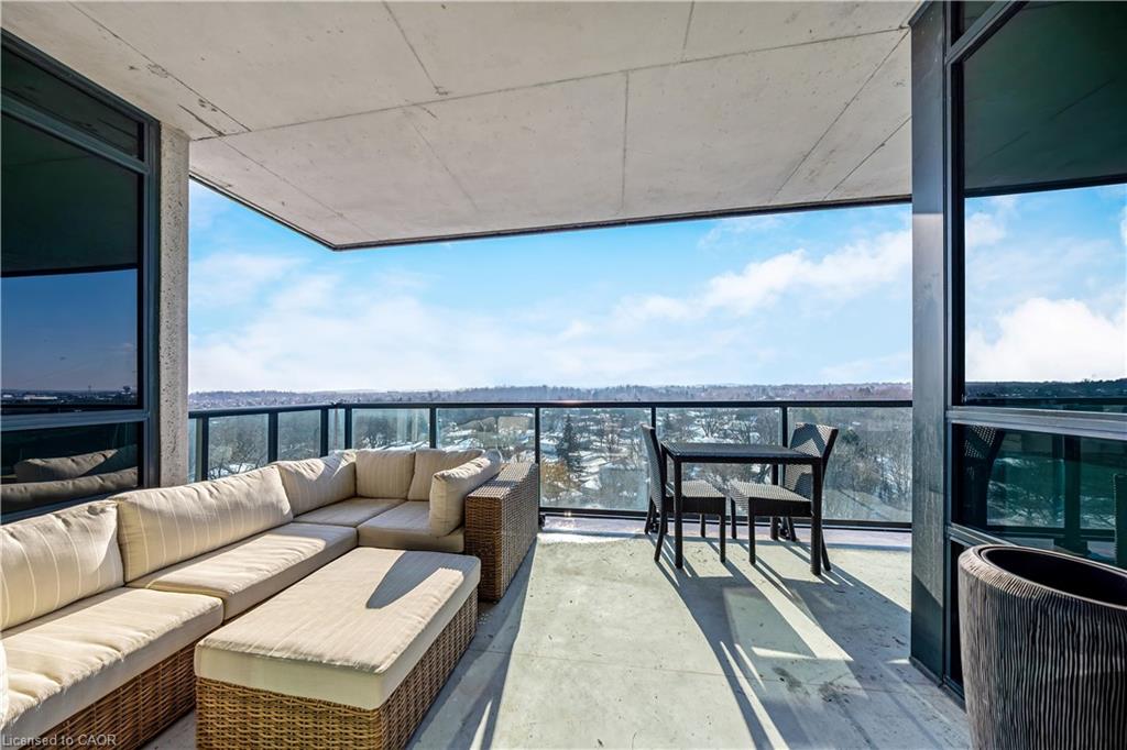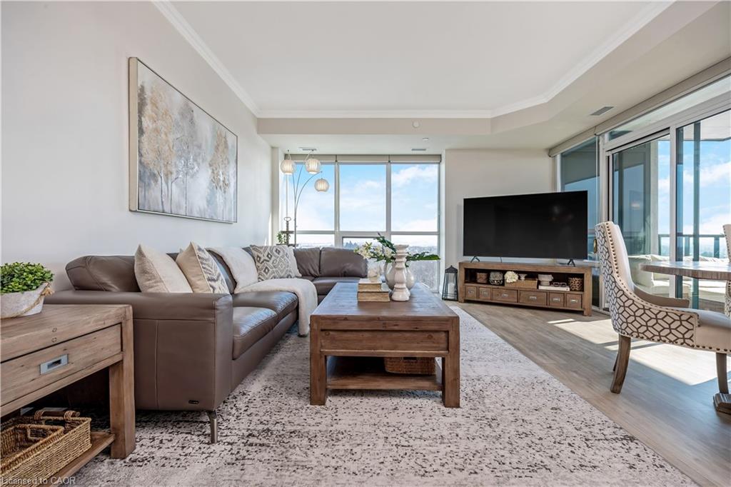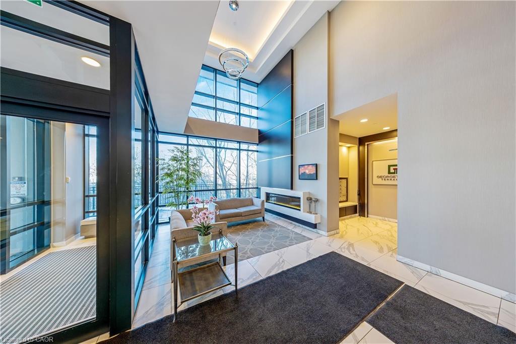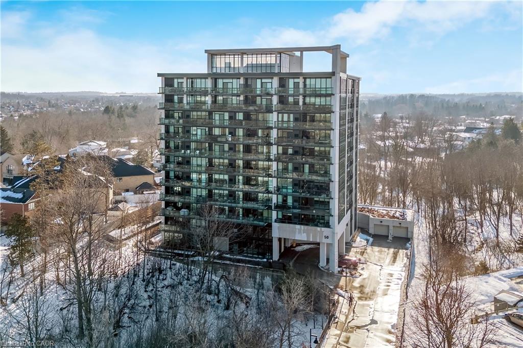 Stunning upper floor 2 bedroom, 2 bathroom condo offering breathtaking views of the Mississauga and Toronto skylines! This beautifully appointed unit combines elegant living with modern comfort and convenient access to major commuter routes. The welcoming front foyer features upgraded wide plank laminate flooring, pot lighting, and generous storage with a double mirrored closet and a separate laundry closet. The bright and spacious open concept living and dining area is filled with natural light from three south facing windows, showcasing scenic views of the Hungry Hollow ravine and trailway. A walk out from the living room leads to an expansive west facing approximately 250 square foot balcony, perfect for enjoying sunsets, relaxing, or entertaining outdoors. The modern kitchen is thoughtfully designed and also includes upgraded wide plank laminate flooring, quartz countertops with an extended breakfast bar featuring rounded edge detail, pot lights, stylish pendant lighting, and a full suite of new stainless steel Frigidaire appliances, including a gas stove. An undermount double sink with reverse osmosis filtered water completes the space. The primary bedroom offers two south facing windows with tranquil views, a walk-in closet, pot lights, and a private four-piece ensuite featuring a walk in glass shower. The second bedroom includes a double closet, west facing windows, and a sliding door with direct walk out to the balcony. A four-piece main bathroom with ceramic flooring and a tub shower combination completes the unit. Building amenities include a fitness room, residents lounge, outdoor patio with BBQ, secure lobby with mail and parcel lockers, on site maintenance office, two elevators, and underground parking. Ideally located close to shopping, dining, parks, and trails, this condo offers exceptional convenience for everyday living. A fantastic opportunity to enjoy low maintenance living in a sophisticated and stylish residence in the heart of Georgetown.