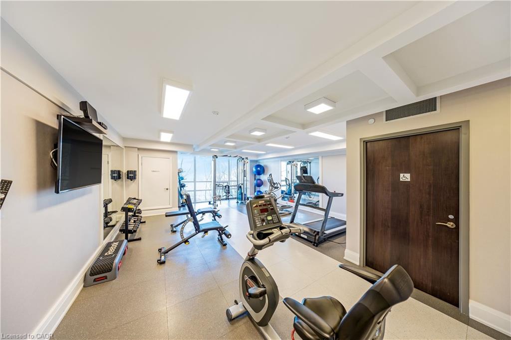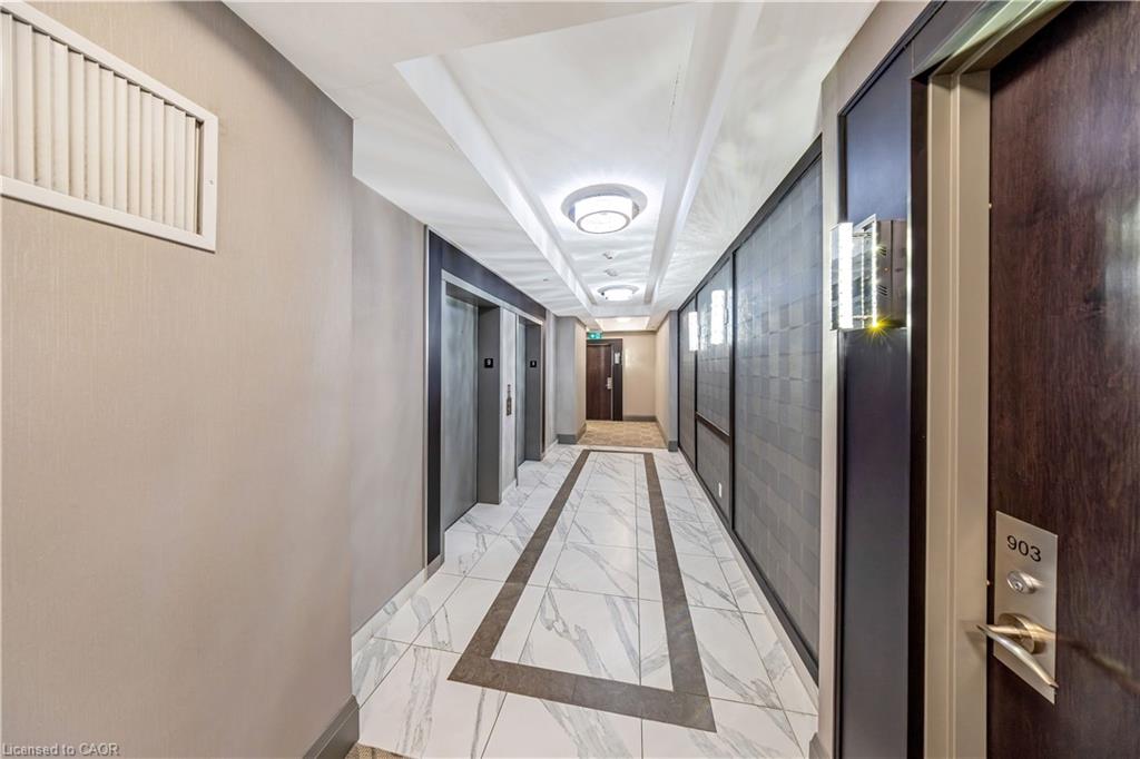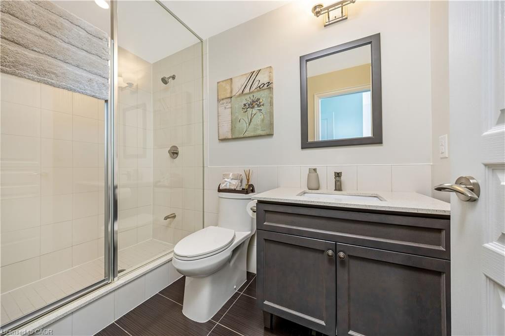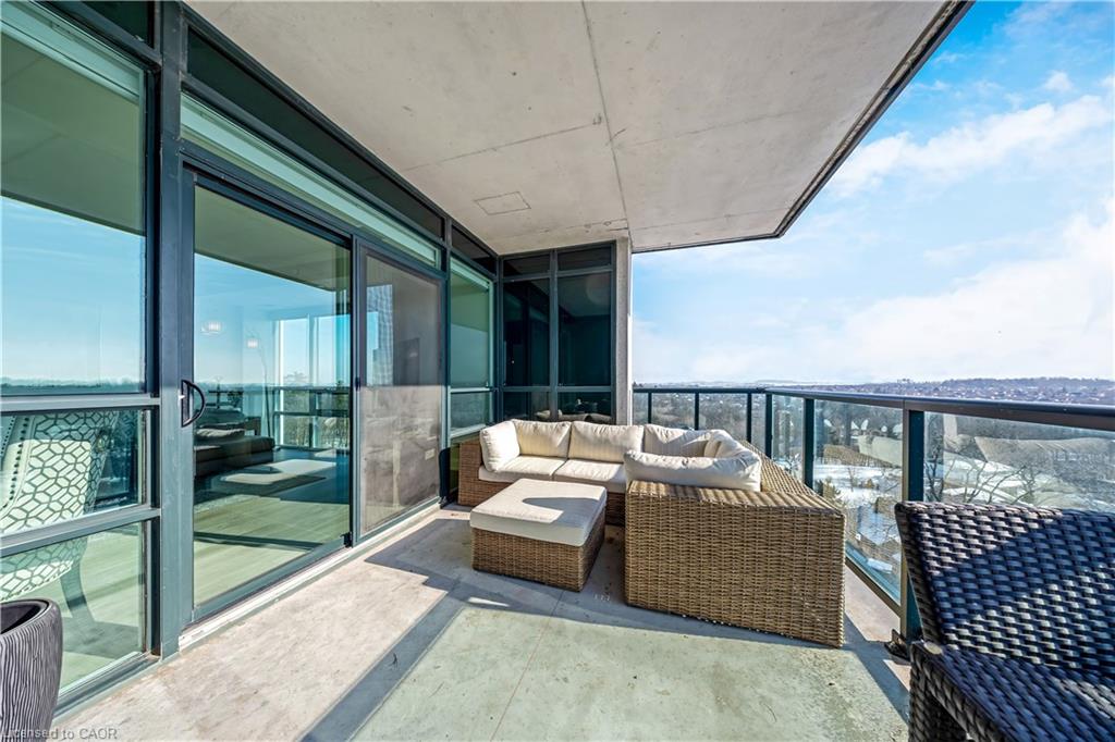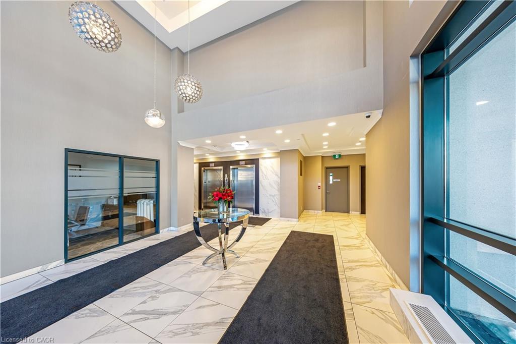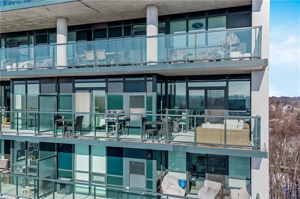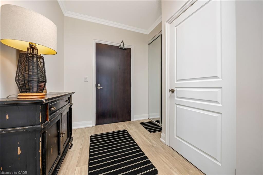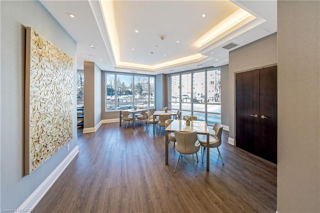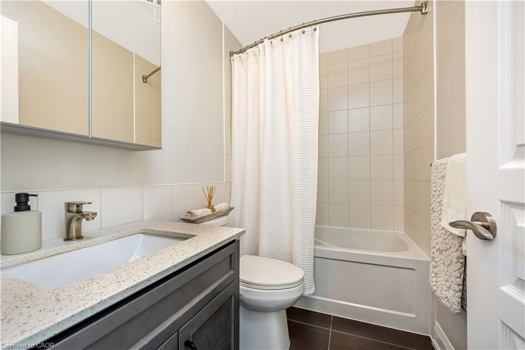 Stunning upper floor 2 bedroom, 2 bathroom condo offering breathtaking views of the Mississauga and Toronto skylines! This beautifully appointed unit combines elegant living with modern comfort and convenient access to major commuter routes. The welcoming front foyer features upgraded wide plank laminate flooring, pot lighting, and generous storage with a double mirrored closet and a separate laundry closet. The bright and spacious open concept living and dining area is filled with natural light from three south facing windows, showcasing scenic views of the Hungry Hollow ravine and trailway. A walk out from the living room leads to an expansive west facing approximately 250 square foot balcony, perfect for enjoying sunsets, relaxing, or entertaining outdoors. The modern kitchen is thoughtfully designed and also includes upgraded wide plank laminate flooring, quartz countertops with an extended breakfast bar featuring rounded edge detail, pot lights, stylish pendant lighting, and a full suite of new stainless steel Frigidaire appliances, including a gas stove. An undermount double sink with reverse osmosis filtered water completes the space. The primary bedroom offers two south facing windows with tranquil views, a walk-in closet, pot lights, and a private four-piece ensuite featuring a walk in glass shower. The second bedroom includes a double closet, west facing windows, and a sliding door with direct walk out to the balcony. A four-piece main bathroom with ceramic flooring and a tub shower combination completes the unit. Building amenities include a fitness room, residents lounge, outdoor patio with BBQ, secure lobby with mail and parcel lockers, on site maintenance office, two elevators, and underground parking. Ideally located close to shopping, dining, parks, and trails, this condo offers exceptional convenience for everyday living. A fantastic opportunity to enjoy low maintenance living in a sophisticated and stylish residence in the heart of Georgetown.