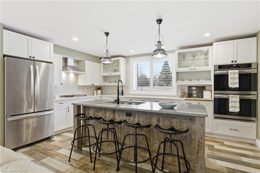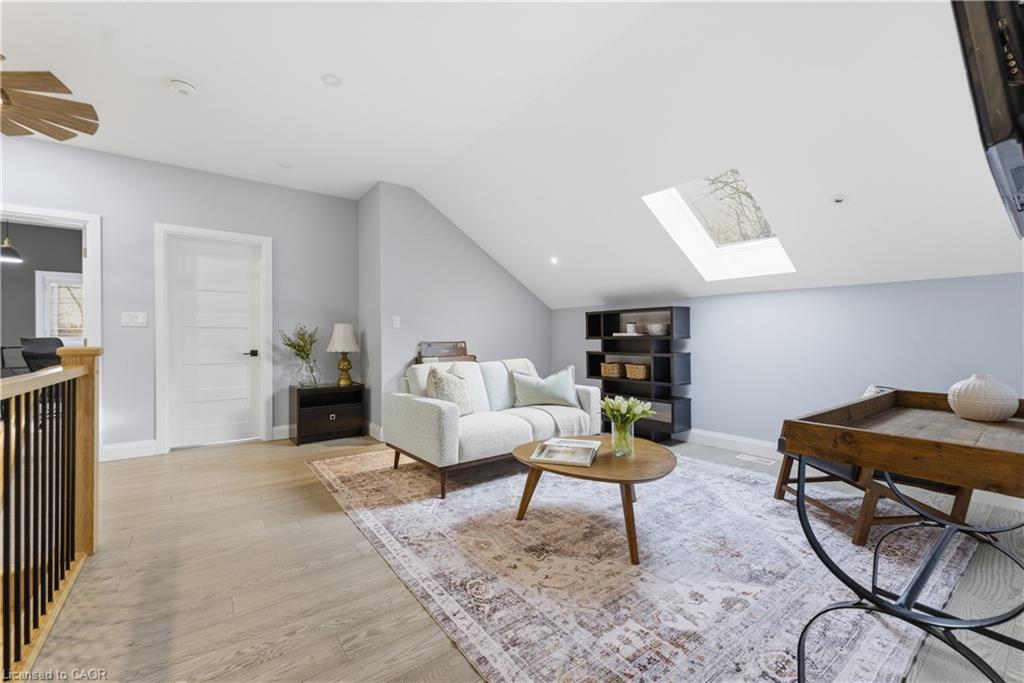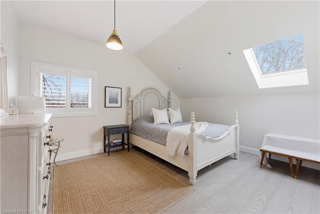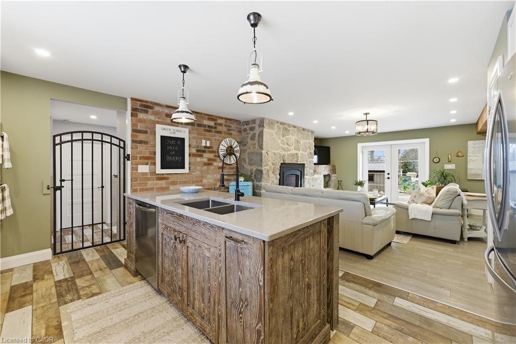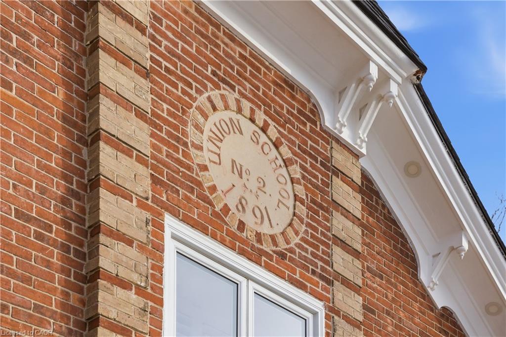This 1891 schoolhouse in Erin is a rare offering, blending over 130 years of history with a full-scale restoration completed in 2020. Originally a one-room school for grades 1–8, the home has been fully gutted and rebuilt, preserving its historic charm while delivering modern comfort and structural integrity. The exterior showcases restored red brick, a functional rooftop school bell, and three stone patios at the front, side, and rear—ideal for outdoor dining, entertaining, or quiet mornings. Original “Boys” and “Girls” entrances remain as a nod to the home’s past. Inside, the open-concept main floor features 9-ft ceilings, exposed wood beams, and a striking stone propane fireplace that anchors the space. The kitchen is designed for entertaining with white cabinetry, quartz counters, a large grey quartz island with seating for four, stainless steel appliances including a propane stove, and double wall ovens. A mudroom with wrought iron gate provides practical access to the backyard. Upstairs, six skylights flood the space with natural light, highlighting a versatile loft. The primary suite offers a remote-controlled skylight, walk-in closet, and private ensuite. All bathrooms feature heated floors, custom tile, and individual touch-control HVAC systems. Major upgrades include an owned tankless water heater, UV filtration system, new foundation and structural supports, energy-efficient windows, and a full-home Generac generator ($20,000 value), offering peace of mind year-round. Located in a close-knit community known for its skating rink, line dancing, Halloween events. Just 10 mins to Hillsburgh, 20 mins to Orangeville, Fergus, Acton & Rockwood, 30 mins to Elora & Guelph, and 1 hour to Oakville. A truly unique blend of history and modern living.