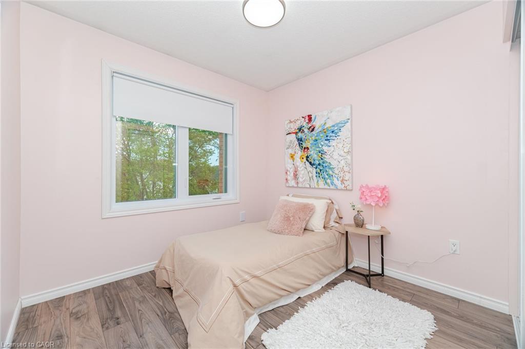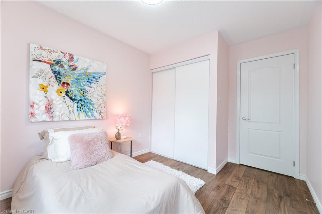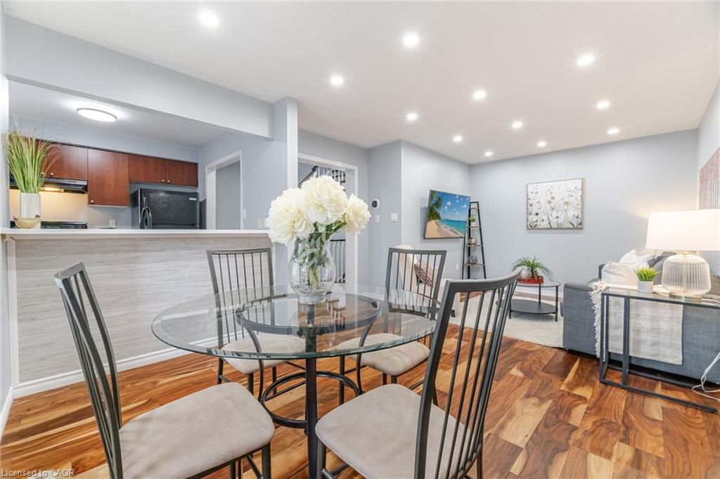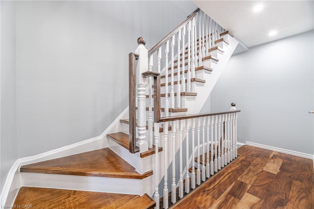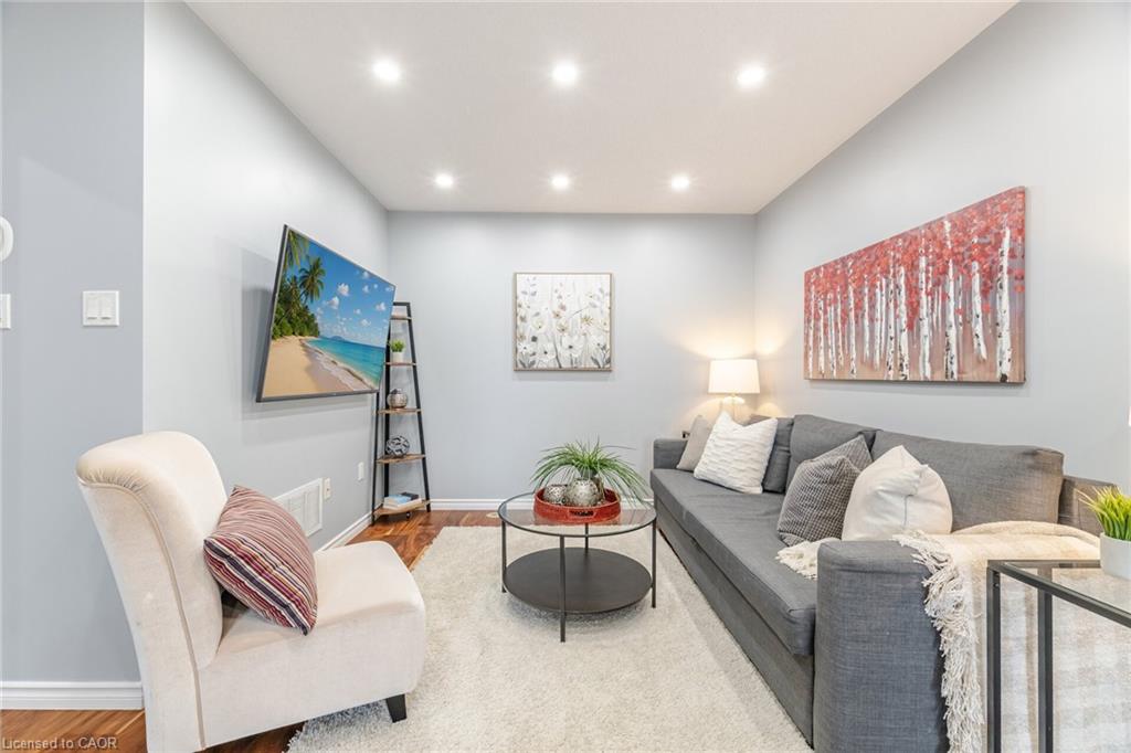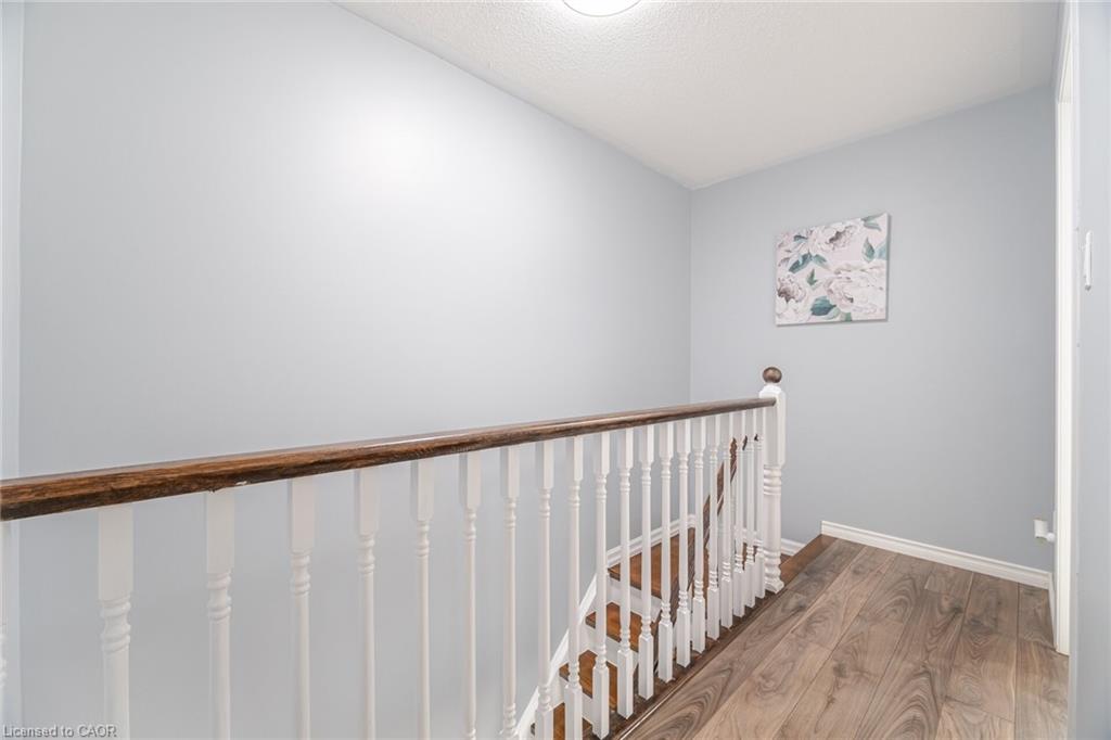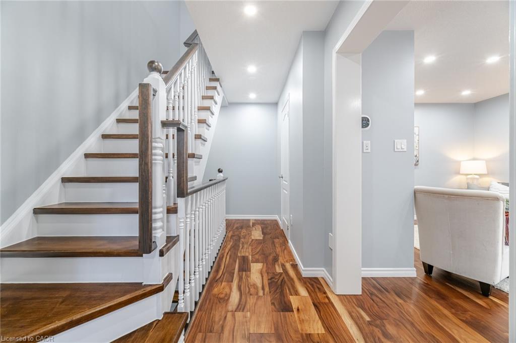Attention Buyers! Discover your opportunity to own a charming freehold townhome in the family-friendly community of Milton! Perfect for first-time buyers, this carpet-free 2-bedroom, 2-bath beauty offers a smart and functional layout with thoughtful upgrades. The ground level features a spacious foyer with garage access, convenient laundry area, newer furnace and air conditioner (2021) and plenty of storage. The second floor boasts an open-concept living and dining area, ideal for entertaining, plus a bright kitchen with quartz countertops (2022), breakfast bar, and a walkout to a stunning private terrace – perfect for morning coffee or evening relaxation. Hardwood stairs (2021) add warmth and style, while all windows were replaced in 2024 (wow!), offering peace of mind and energy efficiency. The third-floor features two bright, roomy bedrooms and a 4-piece bath, perfect for comfort and convenience. Enjoy an extra-long driveway with no sidewalk, fitting 2 cars plus the garage. Location is