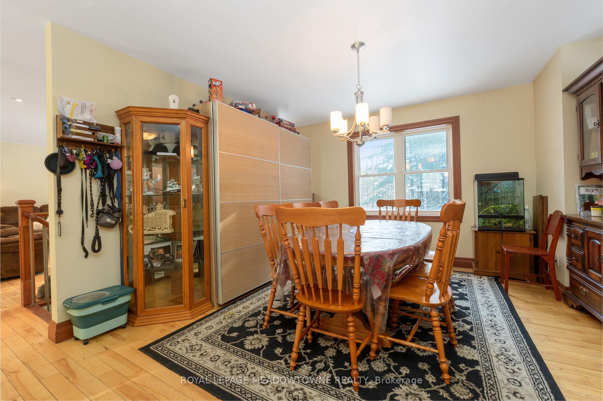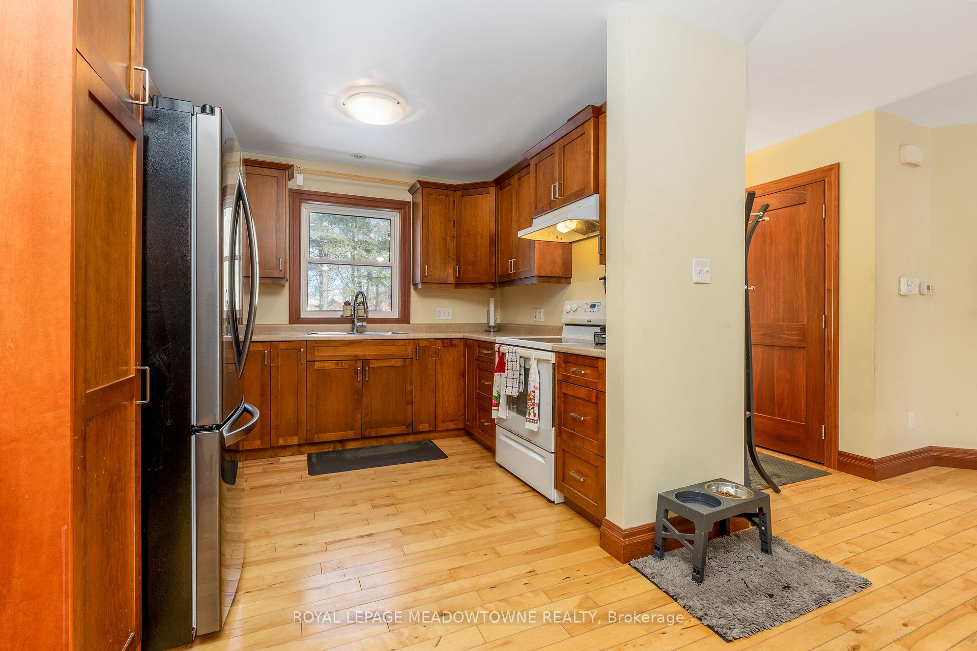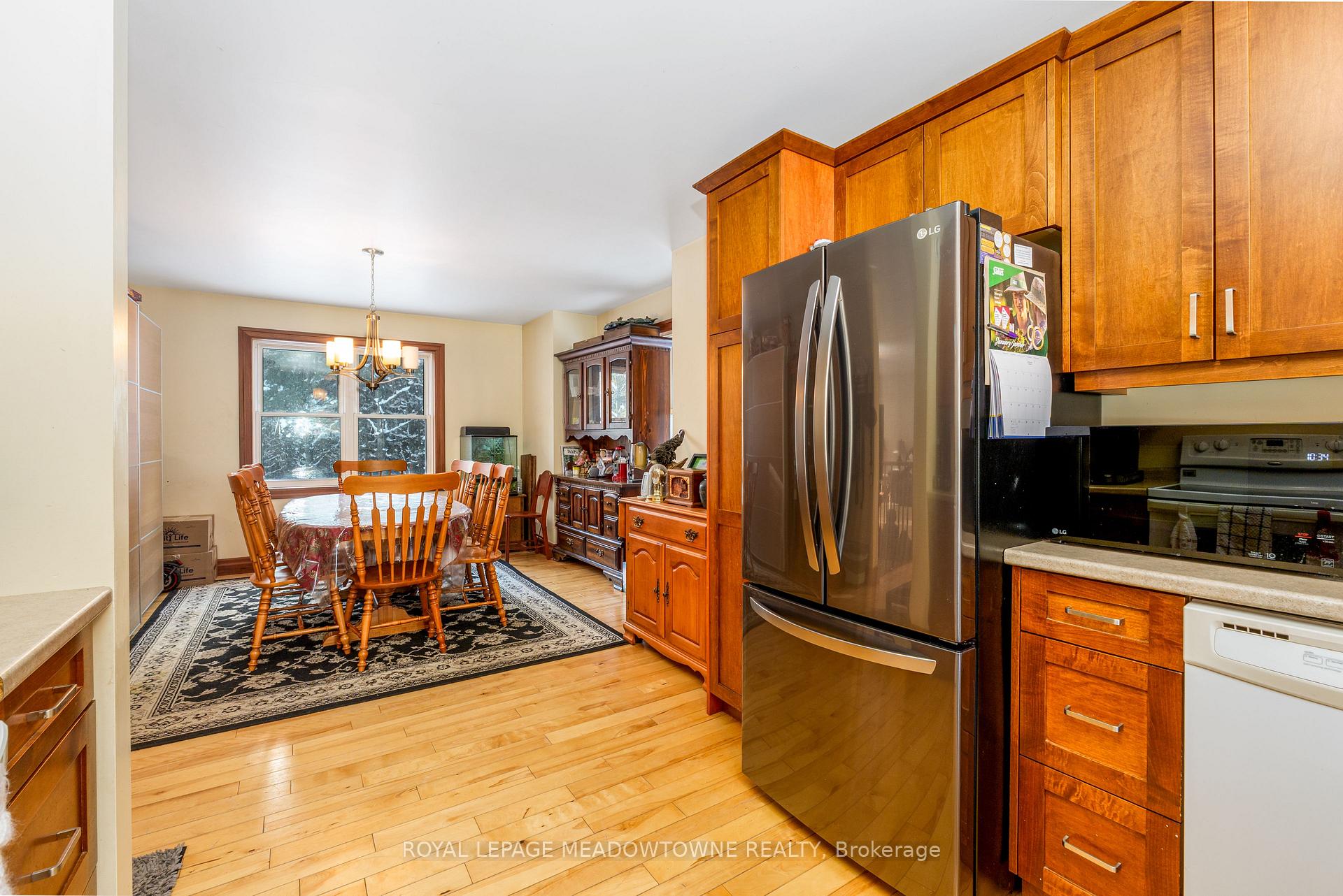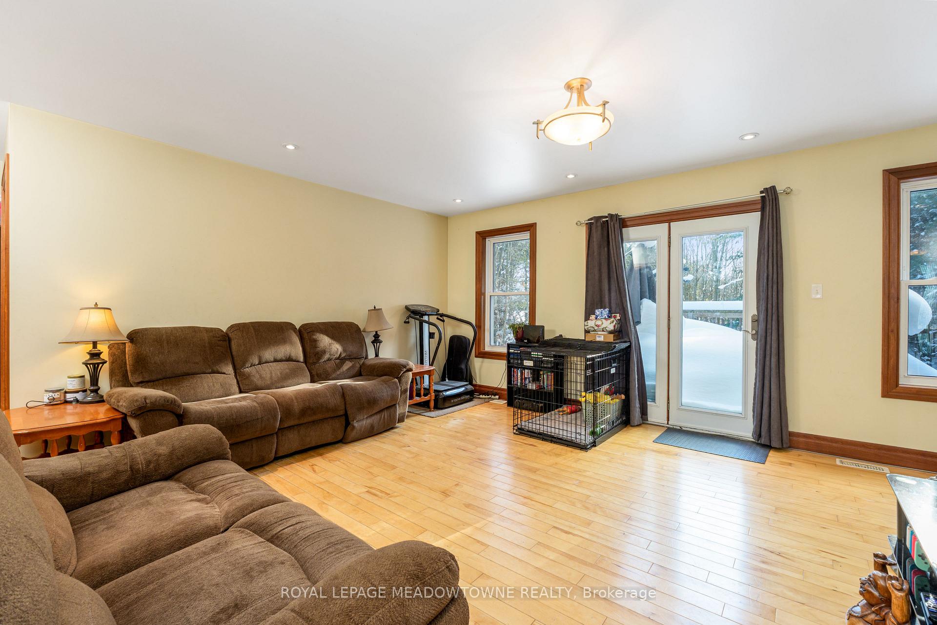 Nestled on a private and serene 1+ acre lot surrounded by mature trees, this beautifully maintained 3+1 bedroom, 2 bathroom detached raised bungalow offers the perfect blend of modern comfort and peaceful country living. Built in 2013 and topped with a durable metal roof, this home is set in a quiet rural setting while remaining conveniently close to town amenities.The welcoming foyer opens into a bright, open-concept living room featuring hardwood flooring, pot lights, and a walk-out to the deck. The dining area is seamlessly overlooked by the kitchen, creating an easy flow for gatherings. Hardwood flooring continues throughout, and the kitchen offers ample cabinetry and counter space to meet all your culinary needs.The main level hosts a spacious primary suite complete with a double closet and a private 3-piece ensuite. Two additional bedrooms on this level are generously sized and feature large closets.The finished lower level expands your living space with a massive open-concept recreation room, laminate flooring, two above-grade windows, and a walk-out to the backyard. A convenient fourth bedroom with an above-grade window, ample storage, a mechanical room, and a laundry room with a rough-in for an additional bathroom complete this level.Step outside to a lush, private backyard-perfect for relaxing, entertaining, or enjoying nature. Ideally located just a short drive to all major amenities, including GO stations in both Acton and Georgetown. Additional highlights include a newly added propane forced-air furnace (2024). A fantastic opportunity to enjoy tranquil country living without sacrificing convenience.
