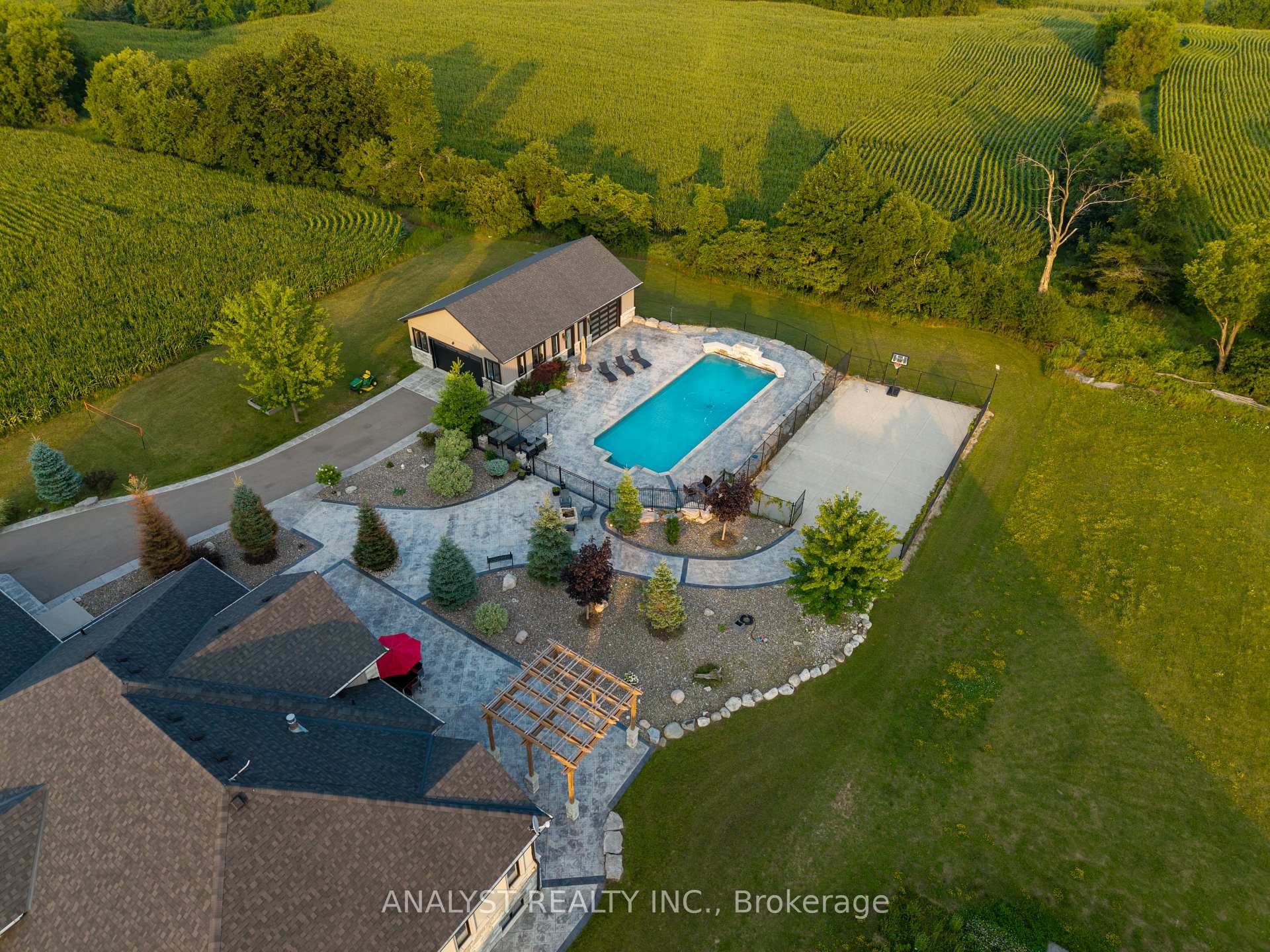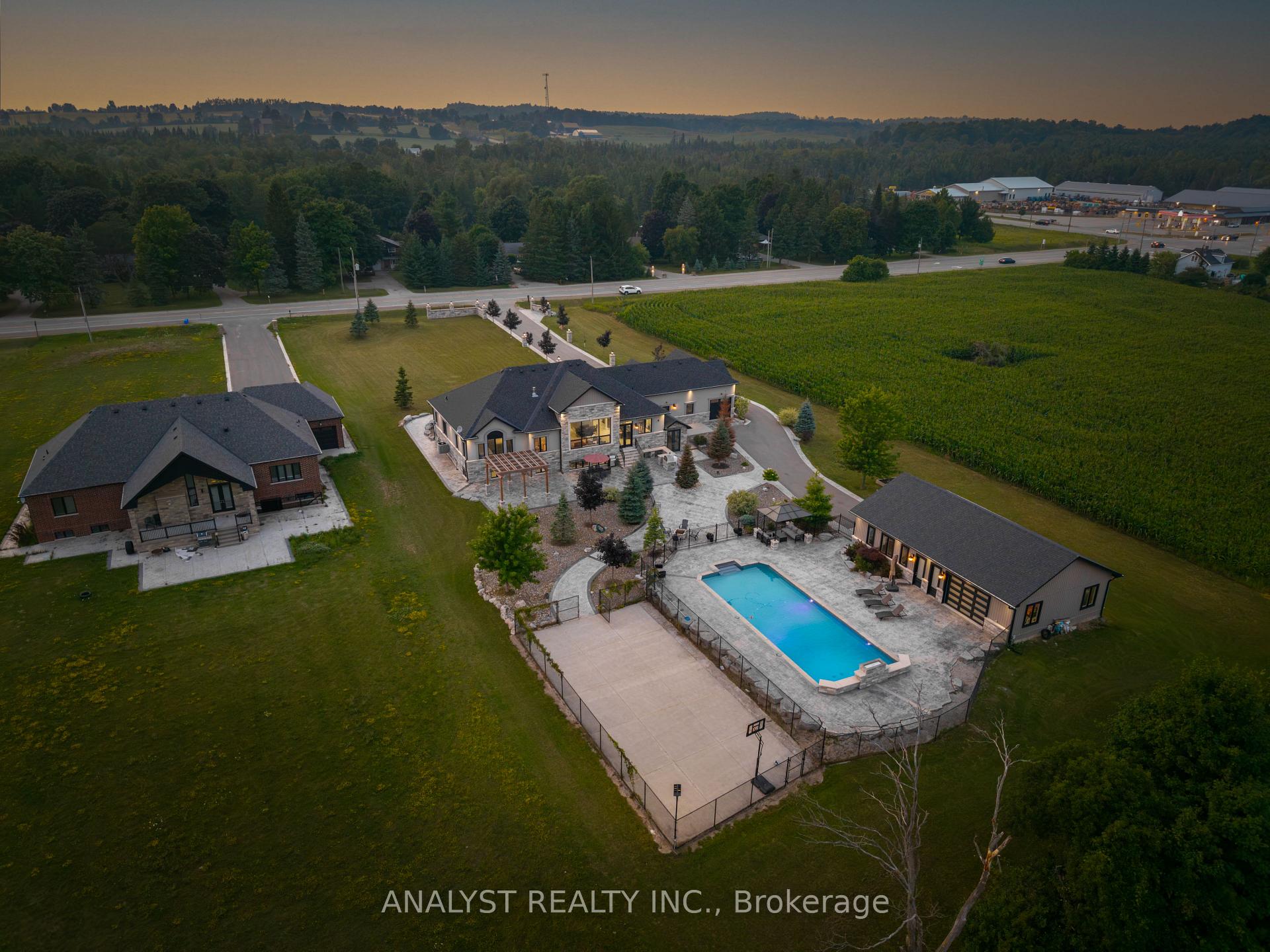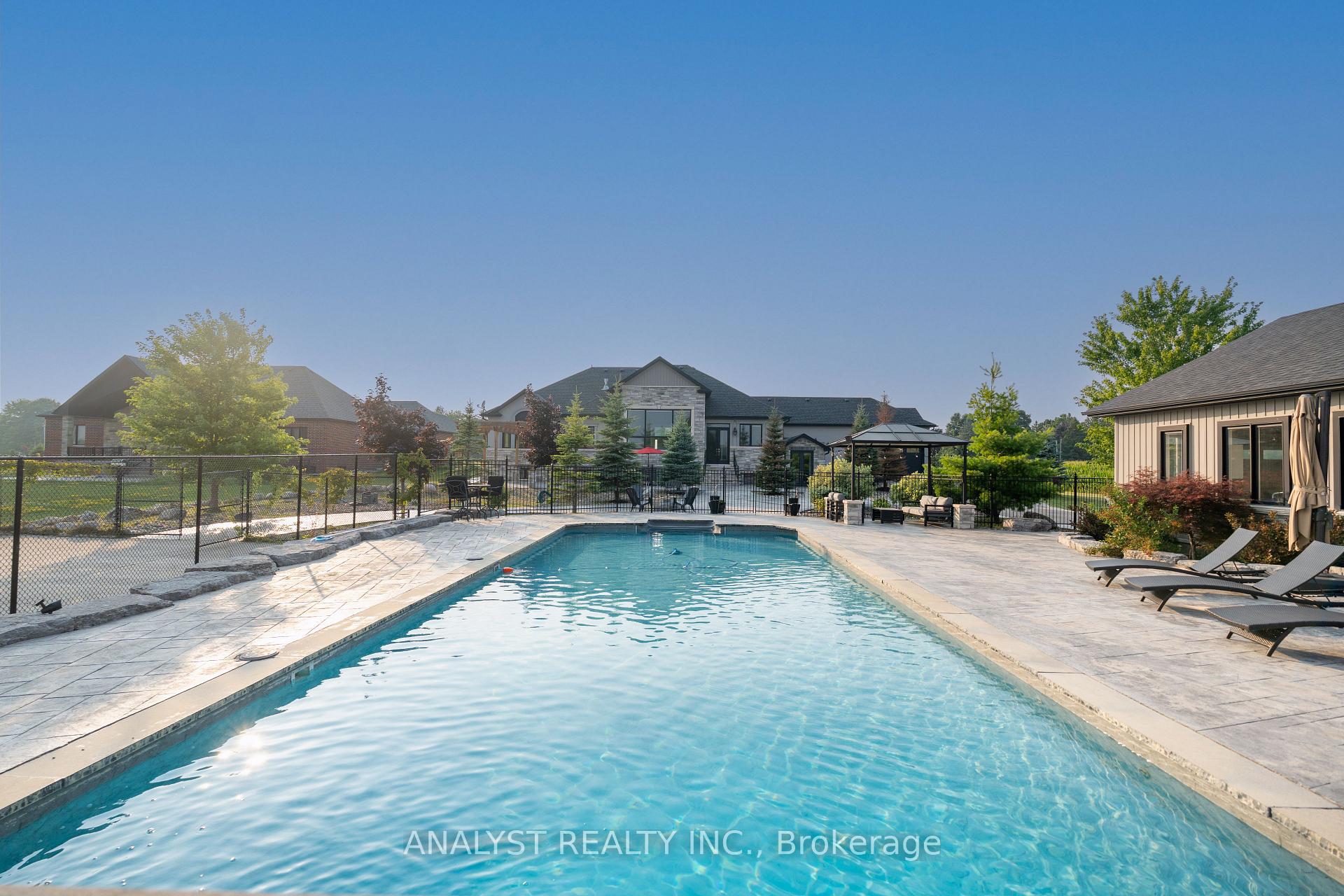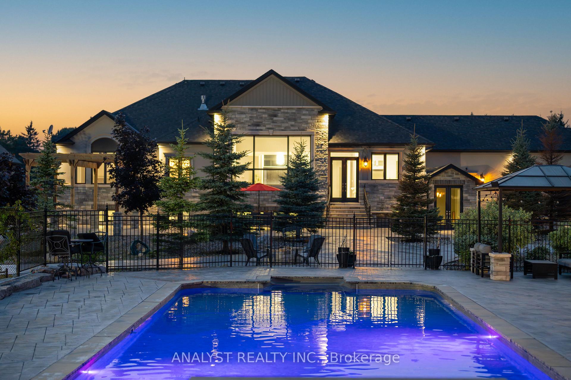 Welcome to 9383 Wellington 124 Road in Erin, an absolutely stunning custom-built bungalow offering over 5,700 square feet of finished living space. Set on 1.31 acres of beautifully landscaped grounds, this home is designed with exceptional craftsmanship and thoughtful details throughout.The main level spans 2,846 square feet and features an open-concept layout with soaring 10- to 15-foot ceilings. A striking 9-by-15-foot picture window floods the family room with natural light, while the gas fireplace adds warmth and elegance. The gourmet kitchen is a showpiece, complete with a centre island, leathered granite counters, stainless steel appliances, and upper and lower accent lighting. The primary suite is a true retreat with a lavish spa-like ensuite, while the additional bedrooms offer spacious layouts, walk-in closets, and a Jack-and-Jill bath.The fully finished lower level adds another 2,876 square feet of living space, featuring a massive recreation room, guest suite, and full bath. This versatile space is perfect for entertaining, relaxing, or hosting extended family and friends.Outdoors, the property continues to impress with a heated saltwater pool, cascading waterfalls, a sports pad, and a cabana that can also serve as a separate garage with space for up to four additional vehicles. Along with the oversized three-car garage with a drive-thru bay and the long private driveway, this home offers exceptional parking and functionality.This is more than a home its a lifestyle. Combining luxury, recreation, and comfort, 9383 Wellington 124 Road delivers the best of both home and cottage living in one remarkable property.