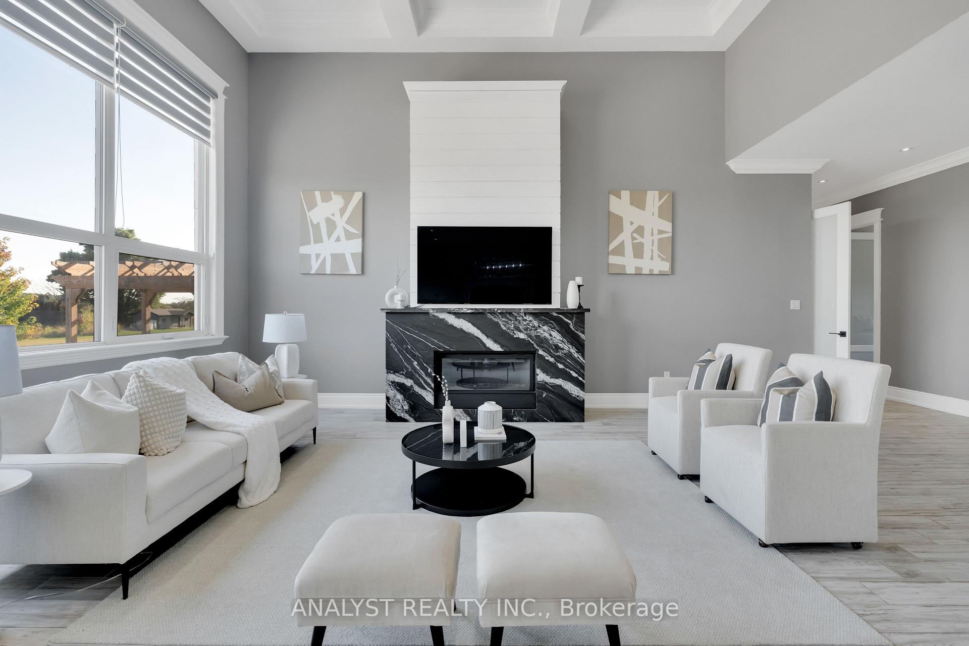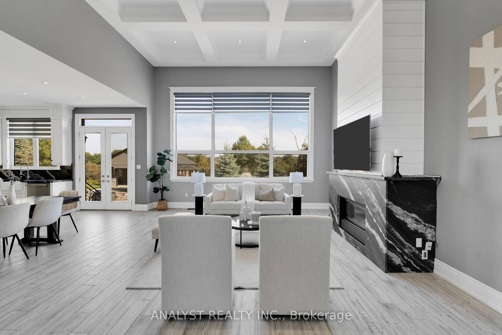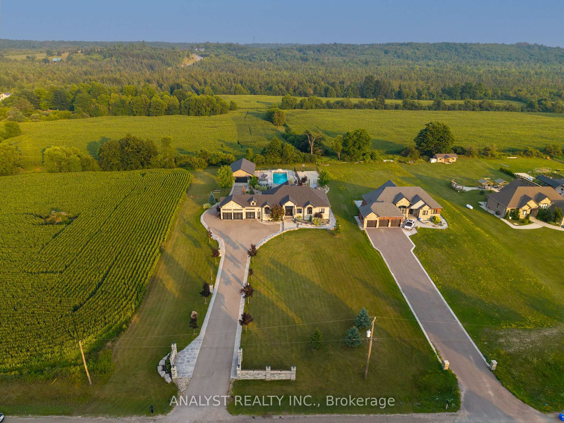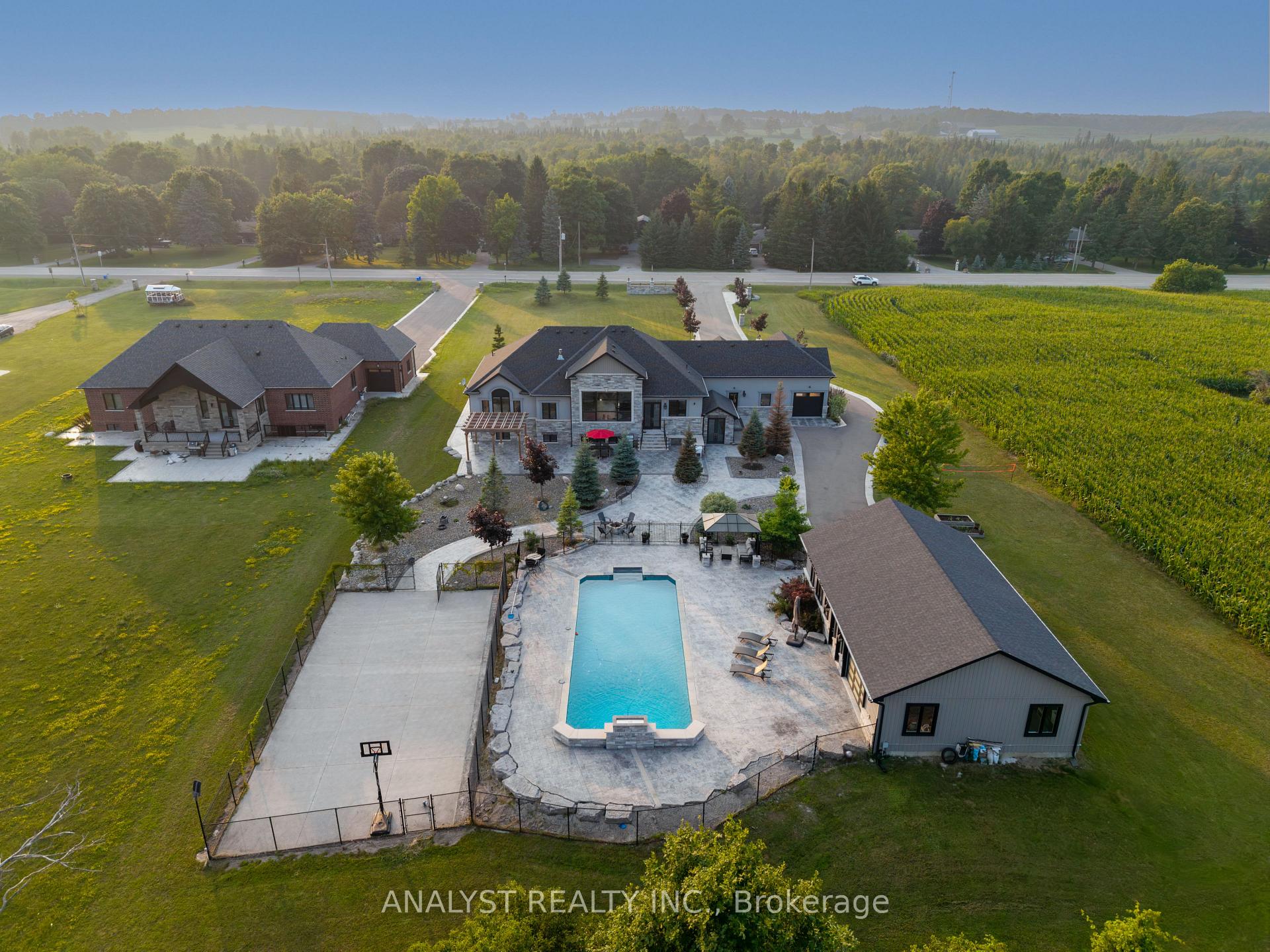 Welcome to 9383 Wellington 124 Road in Erin, an absolutely stunning custom-built bungalow offering over 5,700 square feet of finished living space. Set on 1.31 acres of beautifully landscaped grounds, this home is designed with exceptional craftsmanship and thoughtful details throughout.The main level spans 2,846 square feet and features an open-concept layout with soaring 10- to 15-foot ceilings. A striking 9-by-15-foot picture window floods the family room with natural light, while the gas fireplace adds warmth and elegance. The gourmet kitchen is a showpiece, complete with a centre island, leathered granite counters, stainless steel appliances, and upper and lower accent lighting. The primary suite is a true retreat with a lavish spa-like ensuite, while the additional bedrooms offer spacious layouts, walk-in closets, and a Jack-and-Jill bath.The fully finished lower level adds another 2,876 square feet of living space, featuring a massive recreation room, guest suite, and full bath. This versatile space is perfect for entertaining, relaxing, or hosting extended family and friends.Outdoors, the property continues to impress with a heated saltwater pool, cascading waterfalls, a sports pad, and a cabana that can also serve as a separate garage with space for up to four additional vehicles. Along with the oversized three-car garage with a drive-thru bay and the long private driveway, this home offers exceptional parking and functionality.This is more than a home its a lifestyle. Combining luxury, recreation, and comfort, 9383 Wellington 124 Road delivers the best of both home and cottage living in one remarkable property.