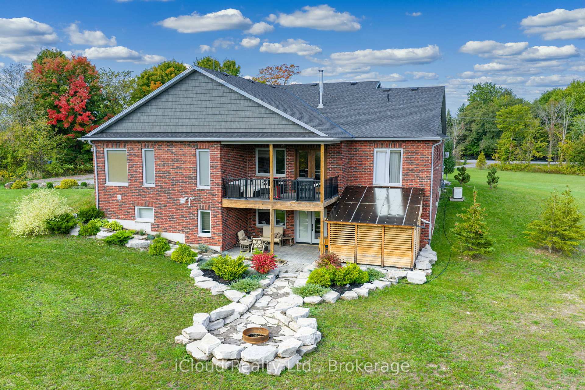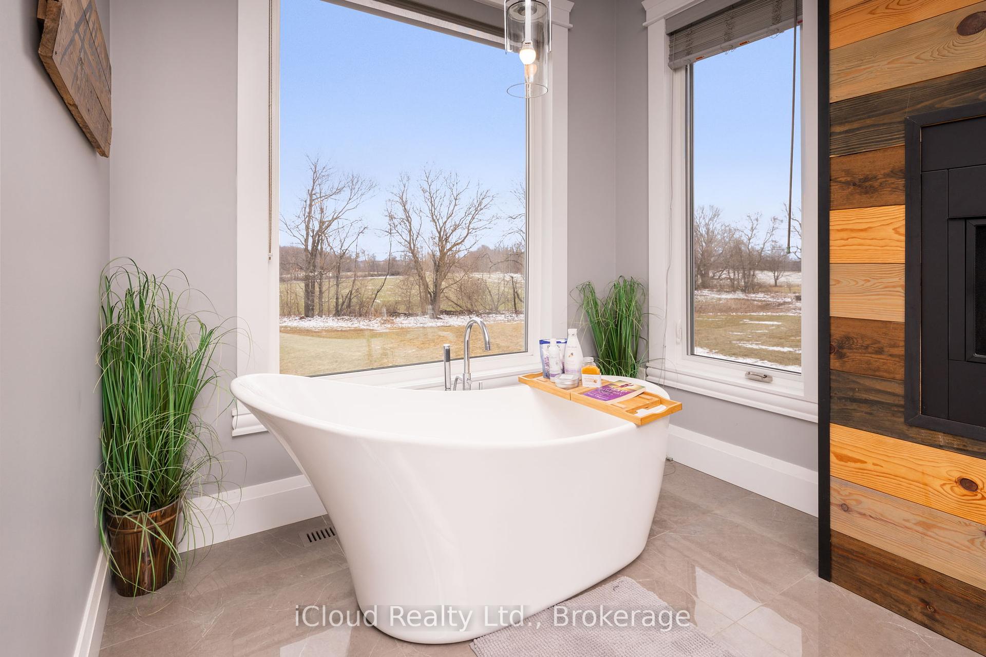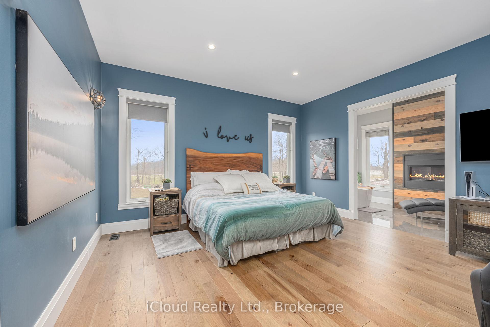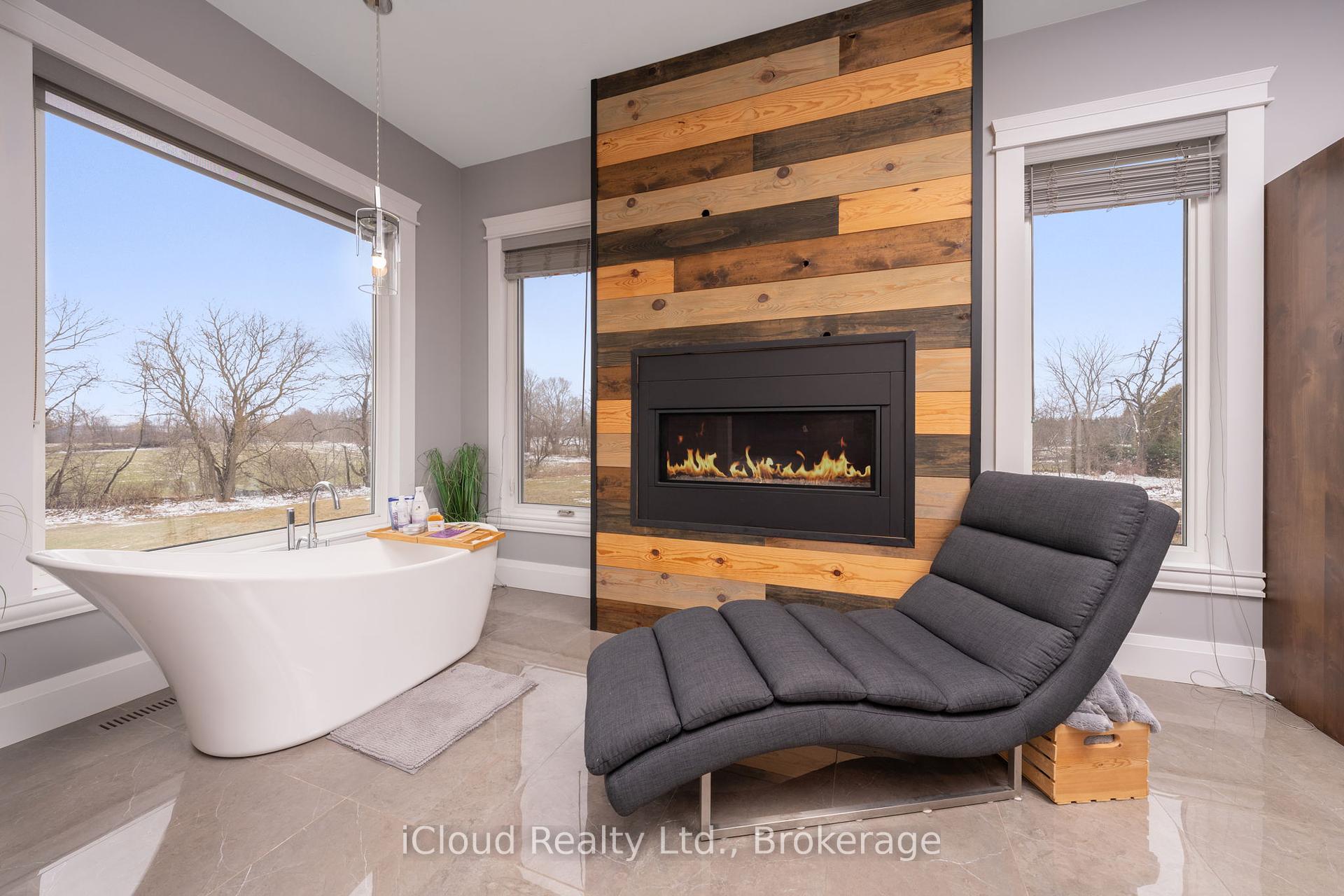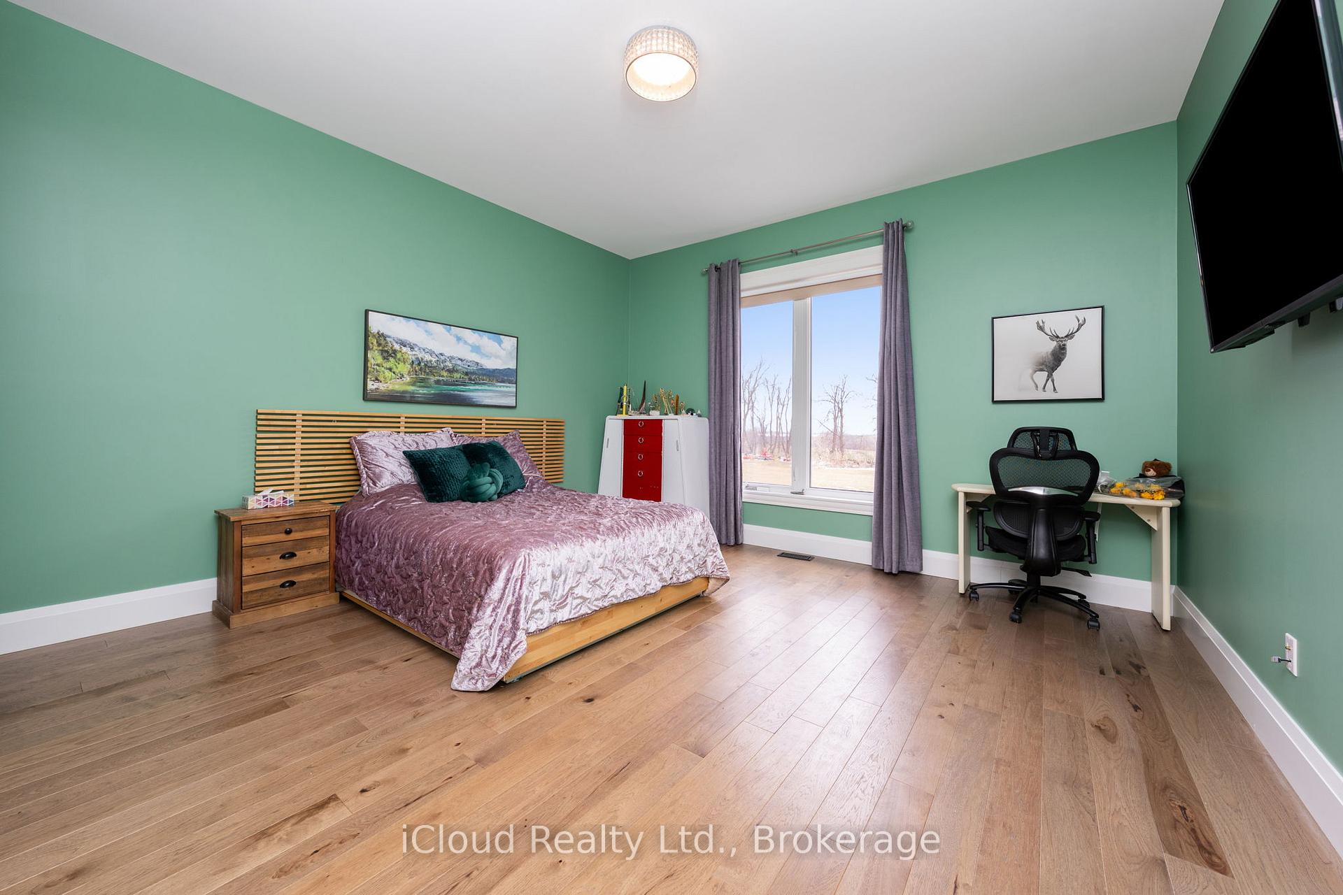 This extraordinary 5-bedroom, 5-bathroom custom-built bungalow offers over 5,000 sq ft of beautifully finished living space on 9 peaceful, tree-lined acres in sought-after Erin. A perfect blend of luxury and functionality, the home features hardwood flooring throughout the main level and a chefs dream kitchen with a large quartz island, top-of-the-line appliances, and a two-way fireplace connecting to the inviting living room. A walkout from the living room leads to a covered deck overlooking the stunning property ideal for entertaining or quiet evenings in nature. The primary suite is a true retreat, featuring a spa-inspired ensuite with a spacious 6×6 open-framed shower, freestanding tub warmed by a gas fireplace, and elegant finishes. Two additional main floor bedrooms each offer 4-piece ensuites and double closets, providing comfort and privacy for family or guests. The fully finished walk-out basement boasts a spacious layout with heated floors, a second kitchen, games area, cozy great room with gas fireplace, dedicated theatre room with Dolby Atmos 9.1 surround sound, one bedroom currently used as a home gym, and a second bedroom with a semi-ensuite featuring another 6×6 open-framed shower. Step outside to a private patio with gazebo, hot tub and built-in fire nook perfect for relaxation. Additional highlights include a heated garage with epoxy flooring, whole-home 22kW automatic generator, reverse osmosis water treatment system, and scenic pond separating two 4+ acre parcels each with its own driveway and natural gas hookup. Previously approved for a second building (with septic and well), this property offers luxury, flexibility, potential future development, and country charm in one unmatched package.
