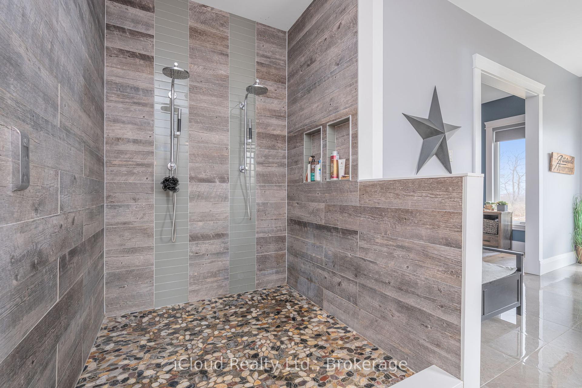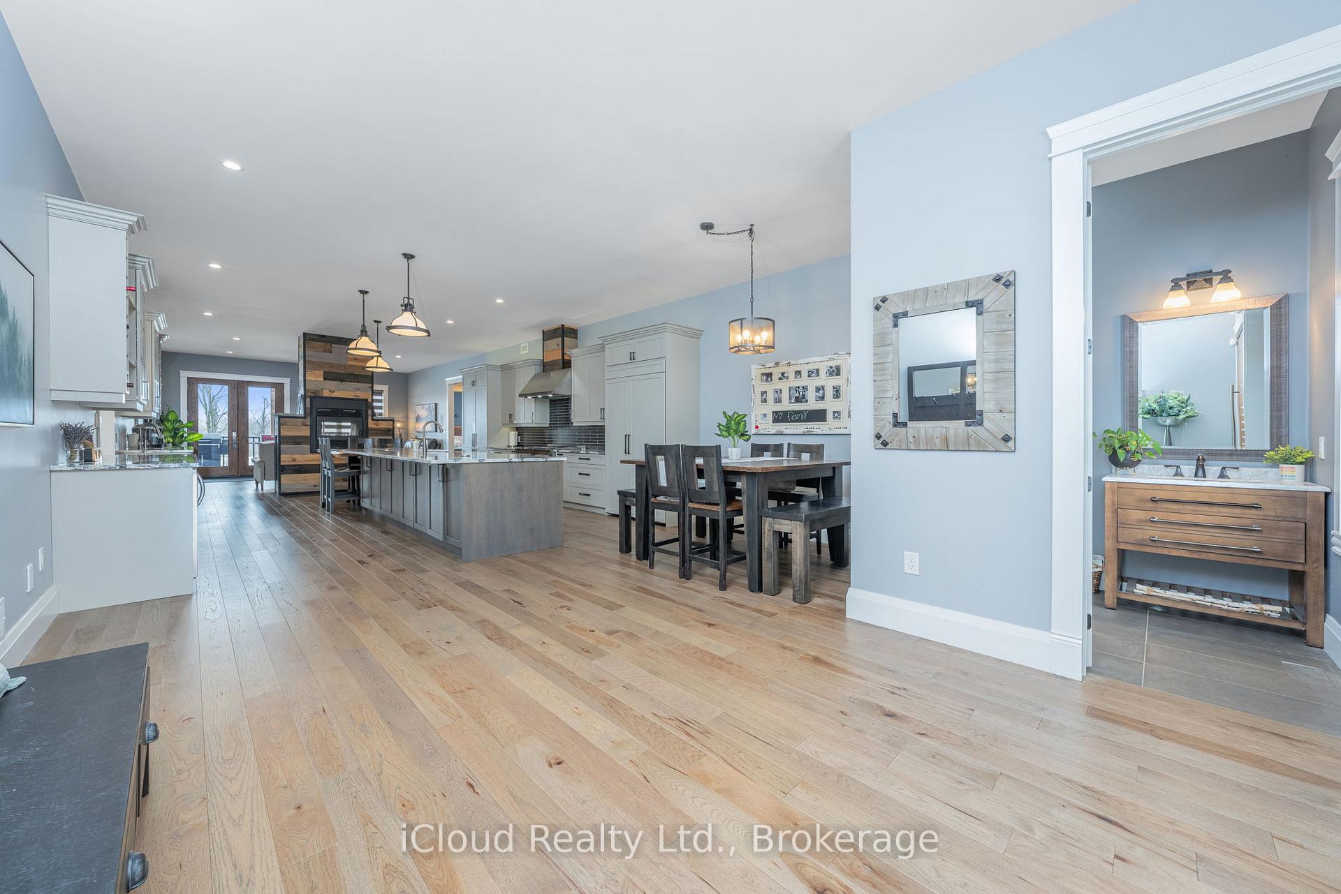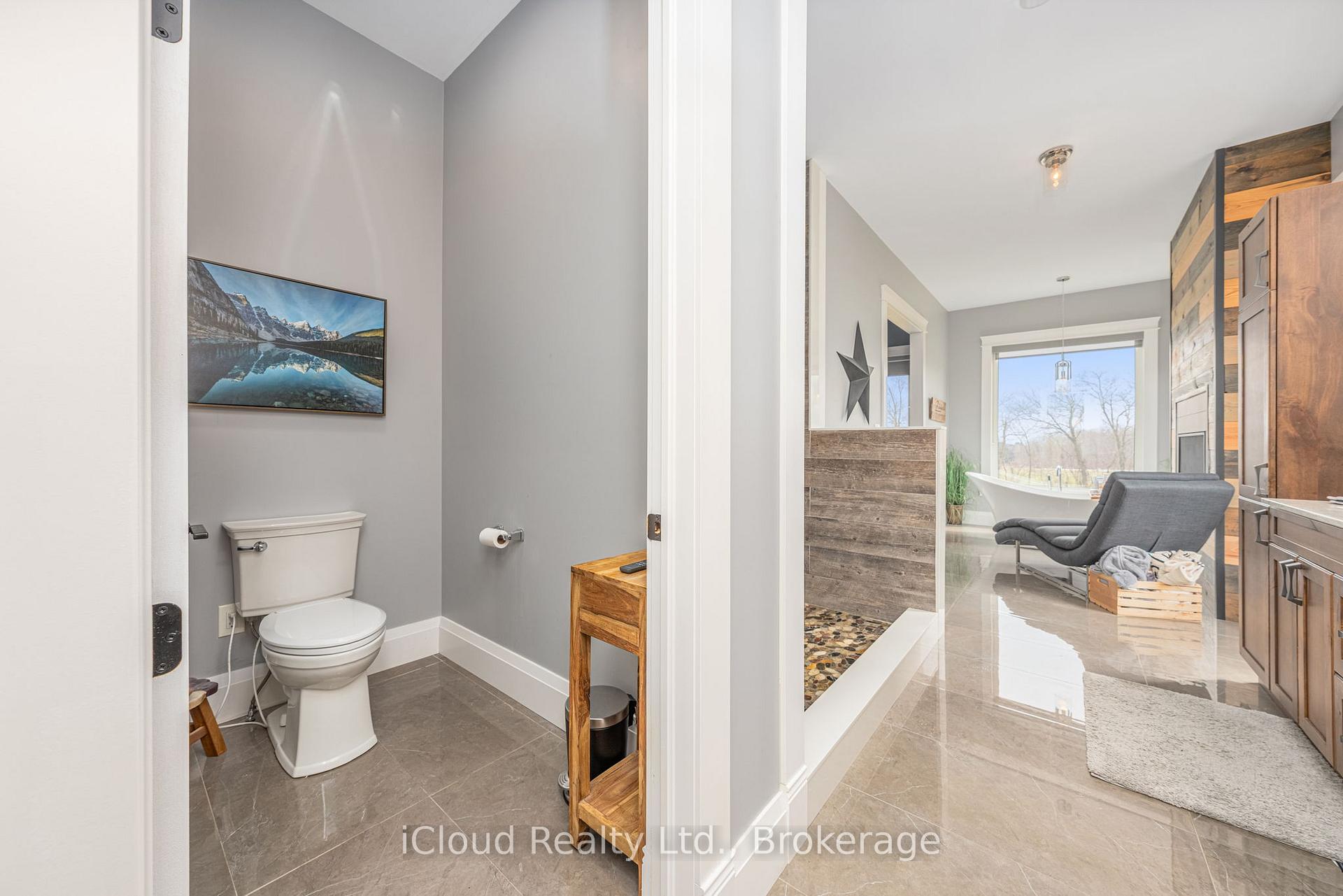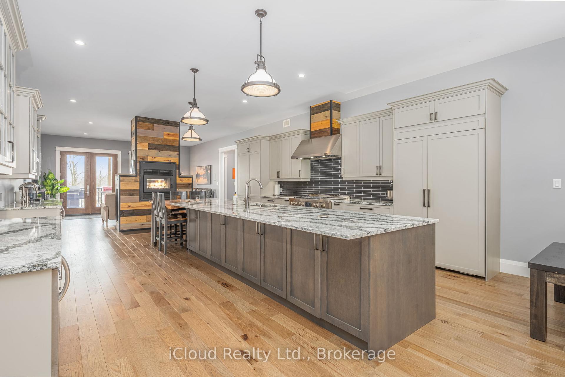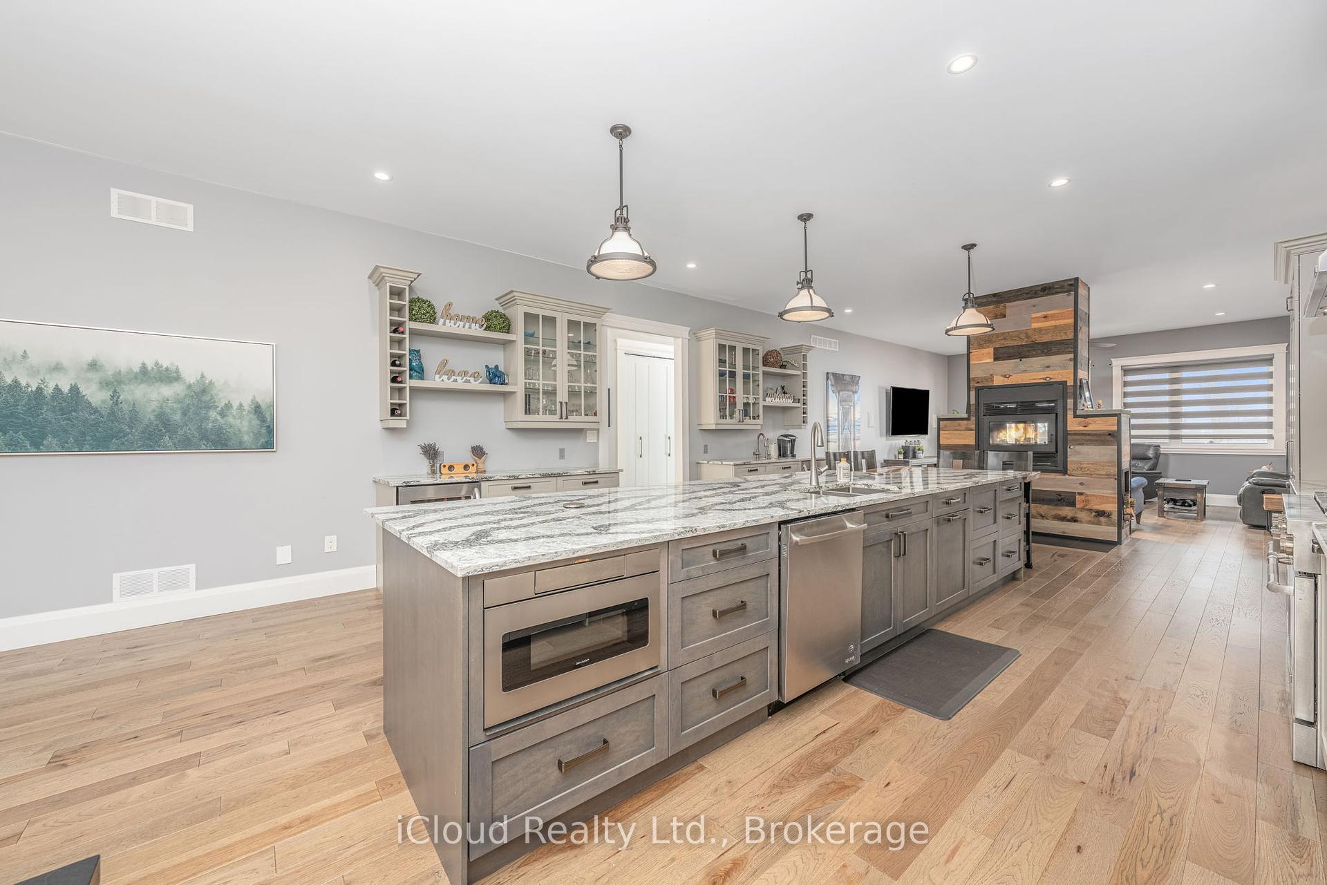 This extraordinary 5-bedroom, 5-bathroom custom-built bungalow offers over 5,000 sq ft of beautifully finished living space on 9 peaceful, tree-lined acres in sought-after Erin. A perfect blend of luxury and functionality, the home features hardwood flooring throughout the main level and a chefs dream kitchen with a large quartz island, top-of-the-line appliances, and a two-way fireplace connecting to the inviting living room. A walkout from the living room leads to a covered deck overlooking the stunning property ideal for entertaining or quiet evenings in nature. The primary suite is a true retreat, featuring a spa-inspired ensuite with a spacious 6×6 open-framed shower, freestanding tub warmed by a gas fireplace, and elegant finishes. Two additional main floor bedrooms each offer 4-piece ensuites and double closets, providing comfort and privacy for family or guests. The fully finished walk-out basement boasts a spacious layout with heated floors, a second kitchen, games area, cozy great room with gas fireplace, dedicated theatre room with Dolby Atmos 9.1 surround sound, one bedroom currently used as a home gym, and a second bedroom with a semi-ensuite featuring another 6×6 open-framed shower. Step outside to a private patio with gazebo, hot tub and built-in fire nook perfect for relaxation. Additional highlights include a heated garage with epoxy flooring, whole-home 22kW automatic generator, reverse osmosis water treatment system, and scenic pond separating two 4+ acre parcels each with its own driveway and natural gas hookup. Previously approved for a second building (with septic and well), this property offers luxury, flexibility, potential future development, and country charm in one unmatched package.