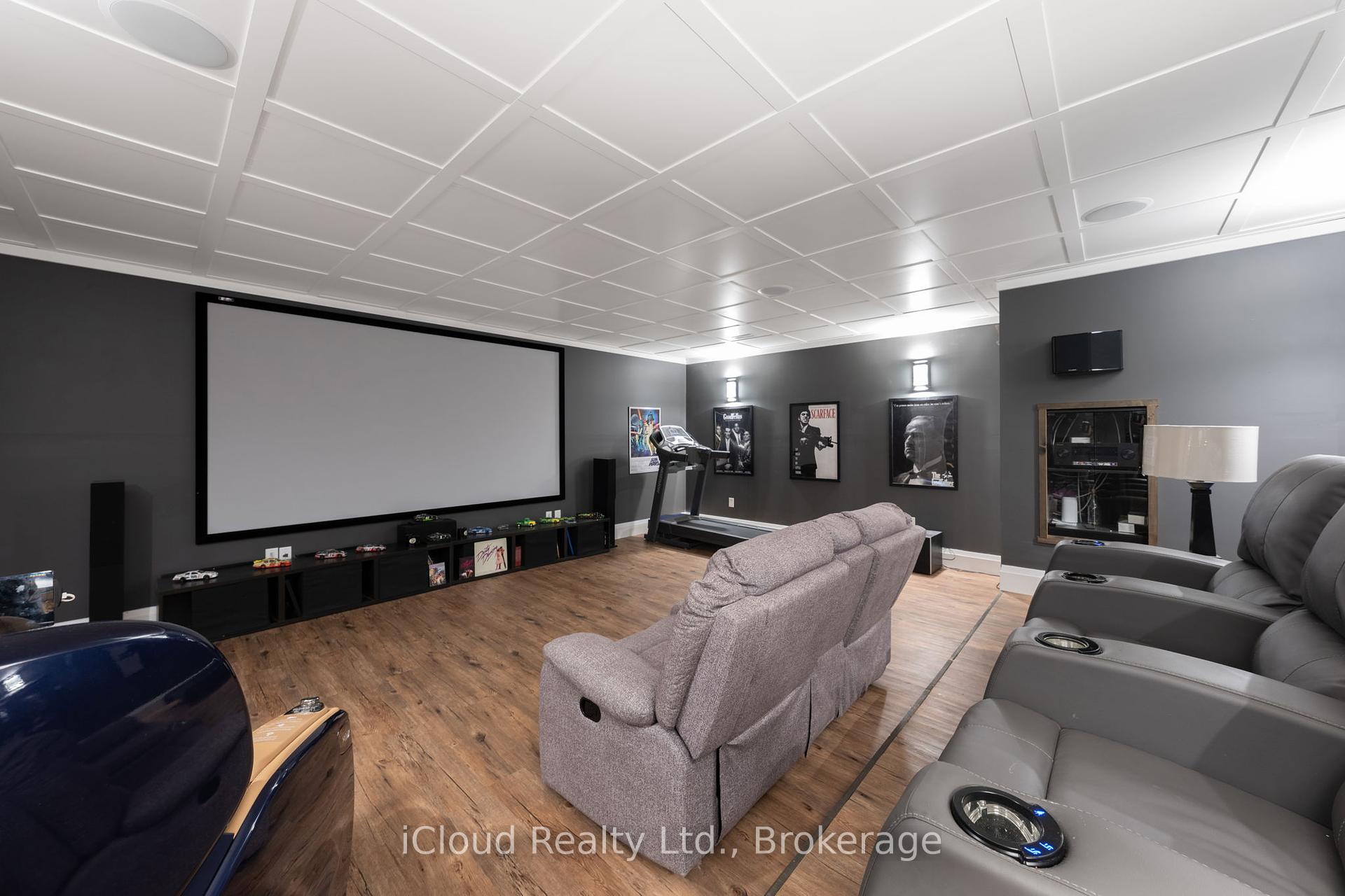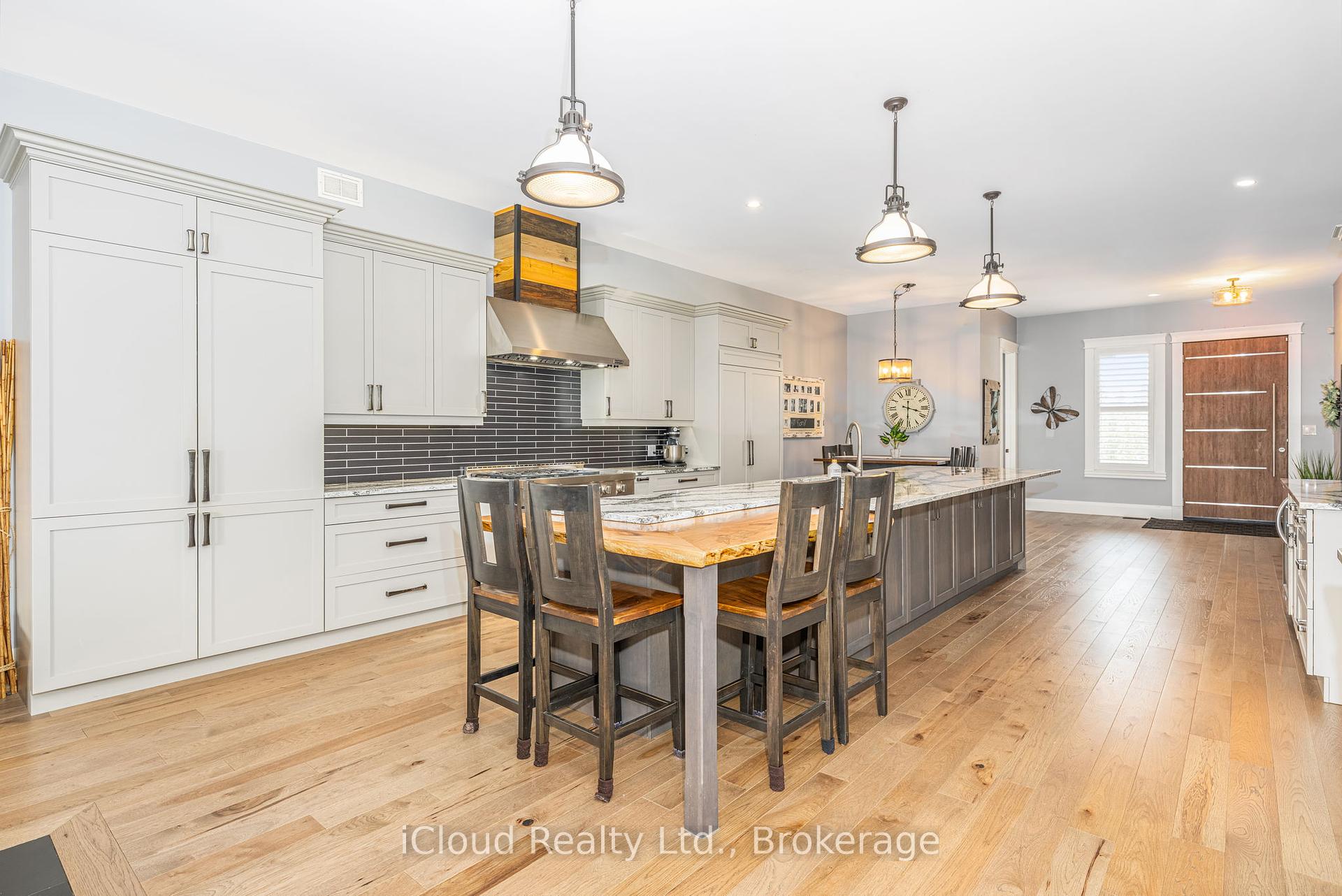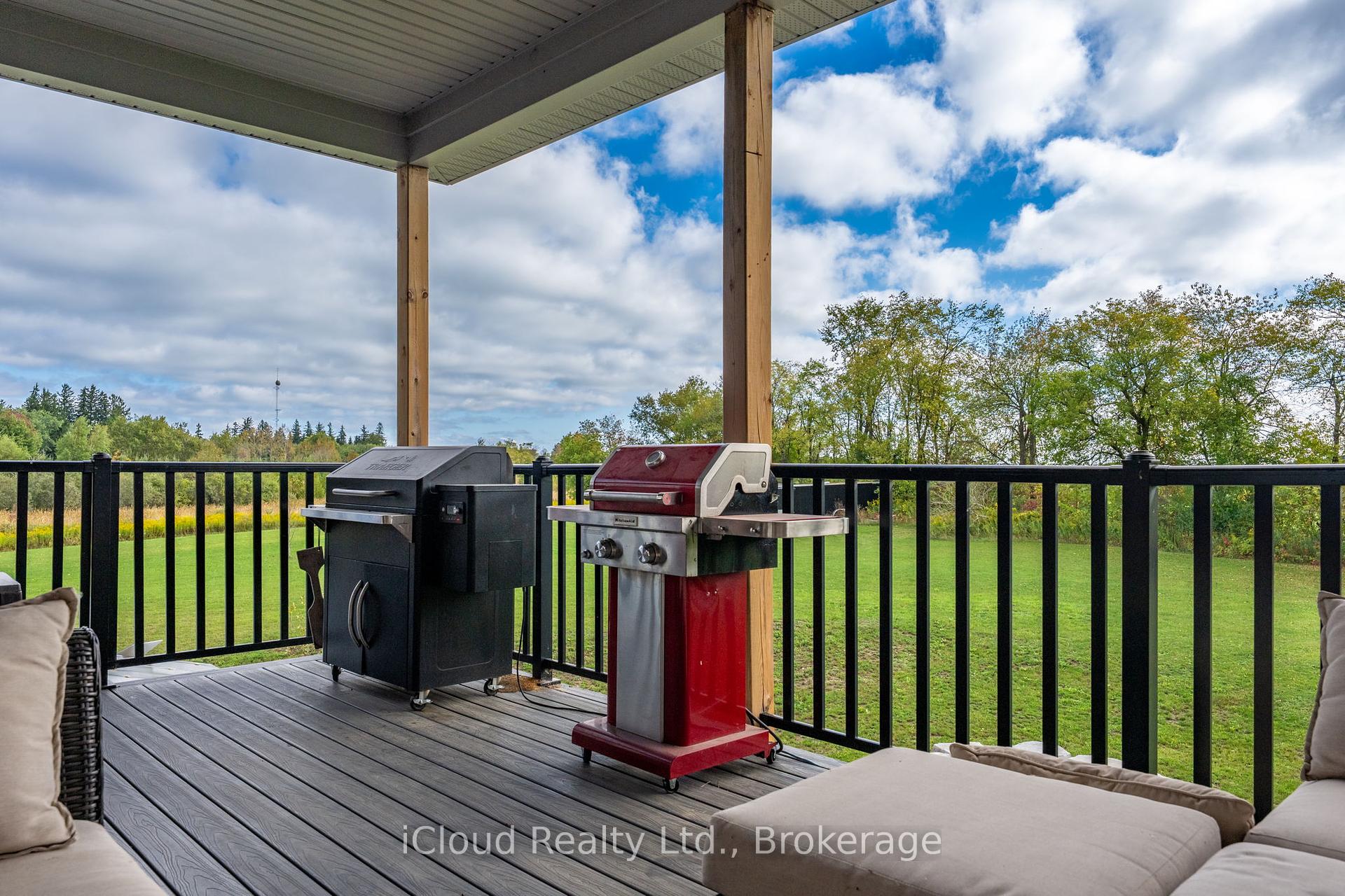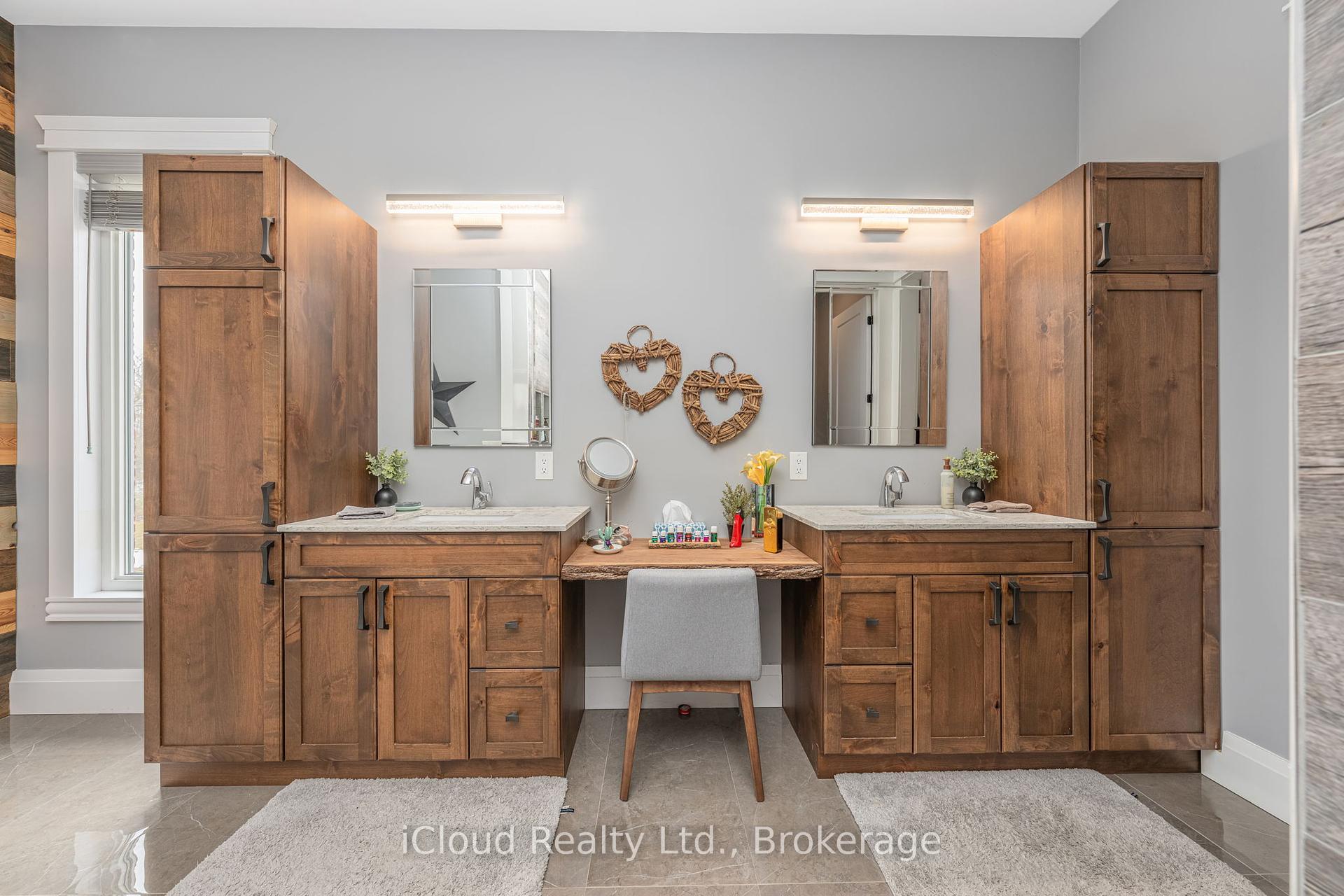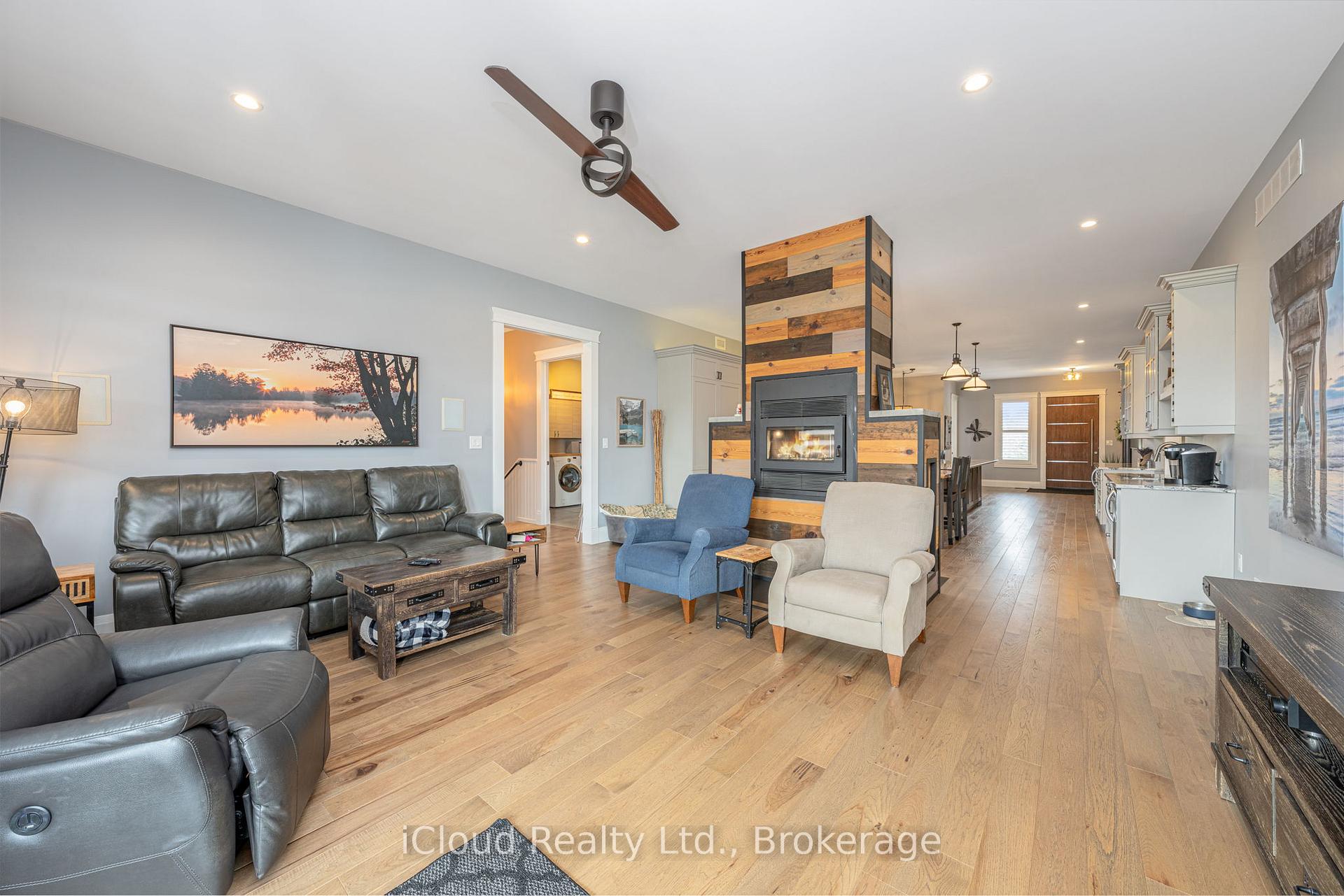 This extraordinary 5-bedroom, 5-bathroom custom-built bungalow offers over 5,000 sq ft of beautifully finished living space on 9 peaceful, tree-lined acres in sought-after Erin. A perfect blend of luxury and functionality, the home features hardwood flooring throughout the main level and a chefs dream kitchen with a large quartz island, top-of-the-line appliances, and a two-way fireplace connecting to the inviting living room. A walkout from the living room leads to a covered deck overlooking the stunning property ideal for entertaining or quiet evenings in nature. The primary suite is a true retreat, featuring a spa-inspired ensuite with a spacious 6×6 open-framed shower, freestanding tub warmed by a gas fireplace, and elegant finishes. Two additional main floor bedrooms each offer 4-piece ensuites and double closets, providing comfort and privacy for family or guests. The fully finished walk-out basement boasts a spacious layout with heated floors, a second kitchen, games area, cozy great room with gas fireplace, dedicated theatre room with Dolby Atmos 9.1 surround sound, one bedroom currently used as a home gym, and a second bedroom with a semi-ensuite featuring another 6×6 open-framed shower. Step outside to a private patio with gazebo, hot tub and built-in fire nook perfect for relaxation. Additional highlights include a heated garage with epoxy flooring, whole-home 22kW automatic generator, reverse osmosis water treatment system, and scenic pond separating two 4+ acre parcels each with its own driveway and natural gas hookup. Previously approved for a second building (with septic and well), this property offers luxury, flexibility, potential future development, and country charm in one unmatched package.