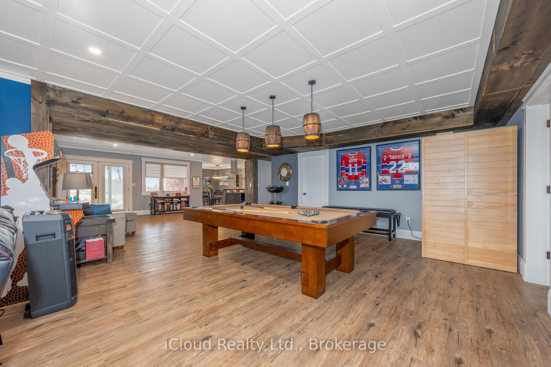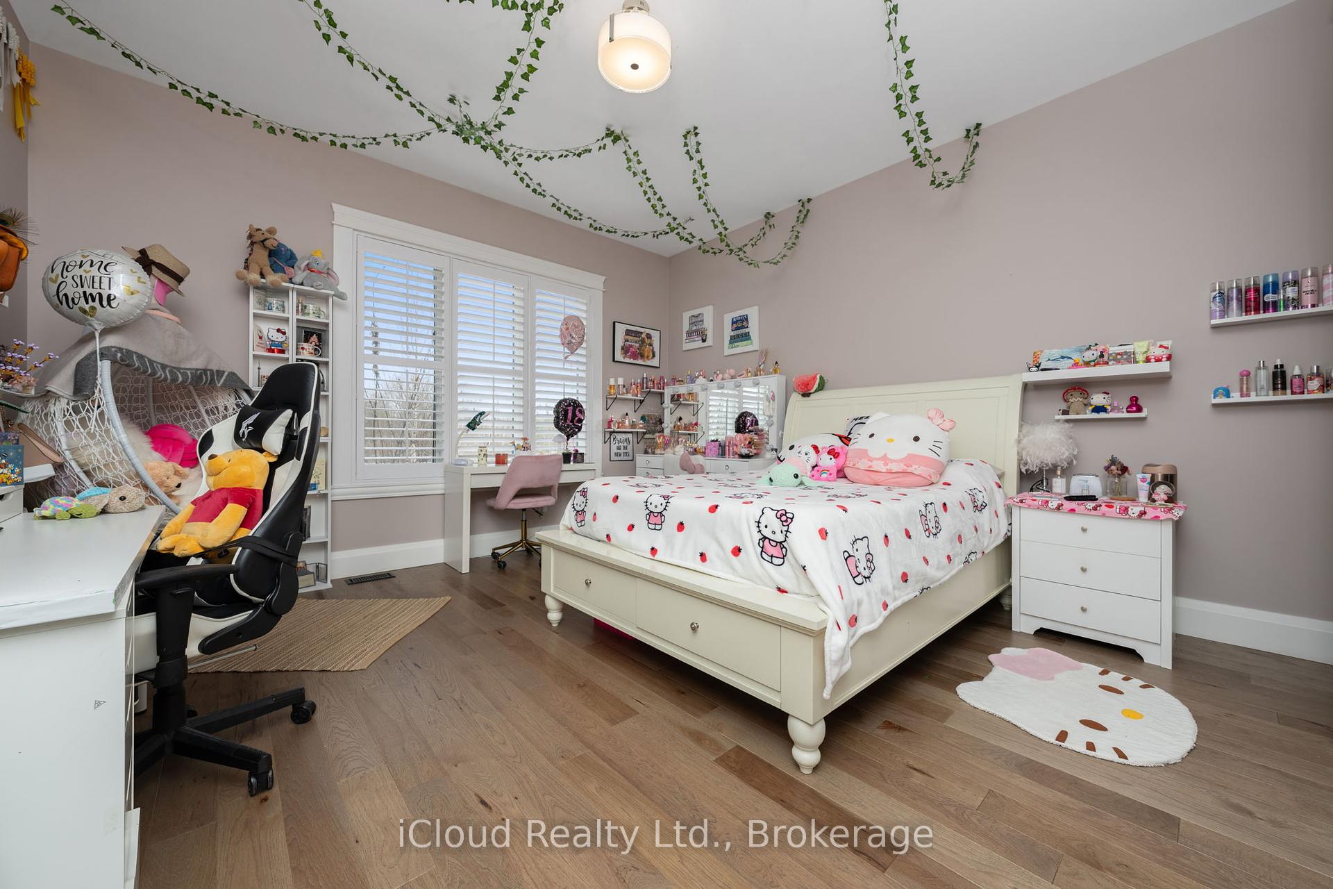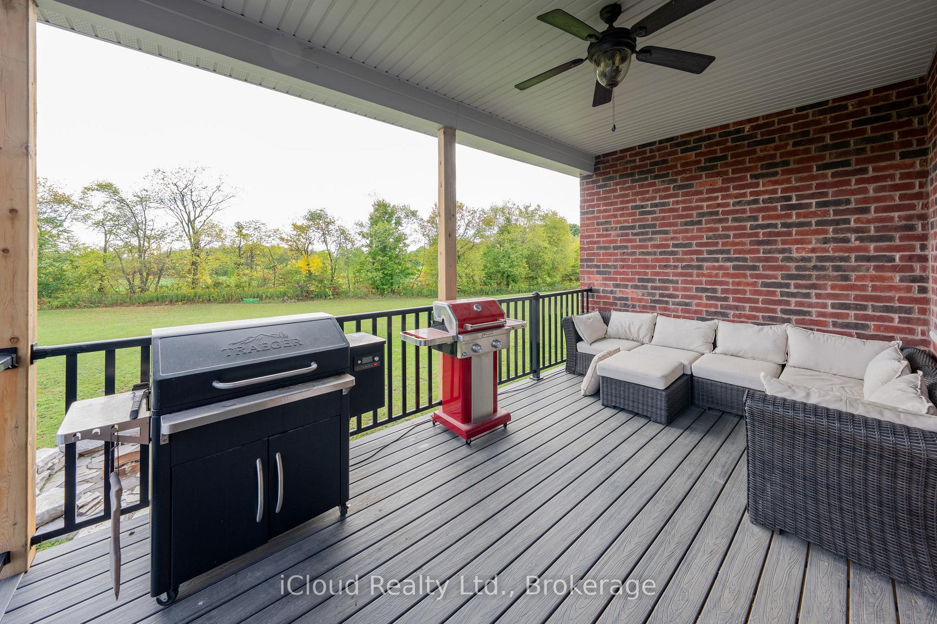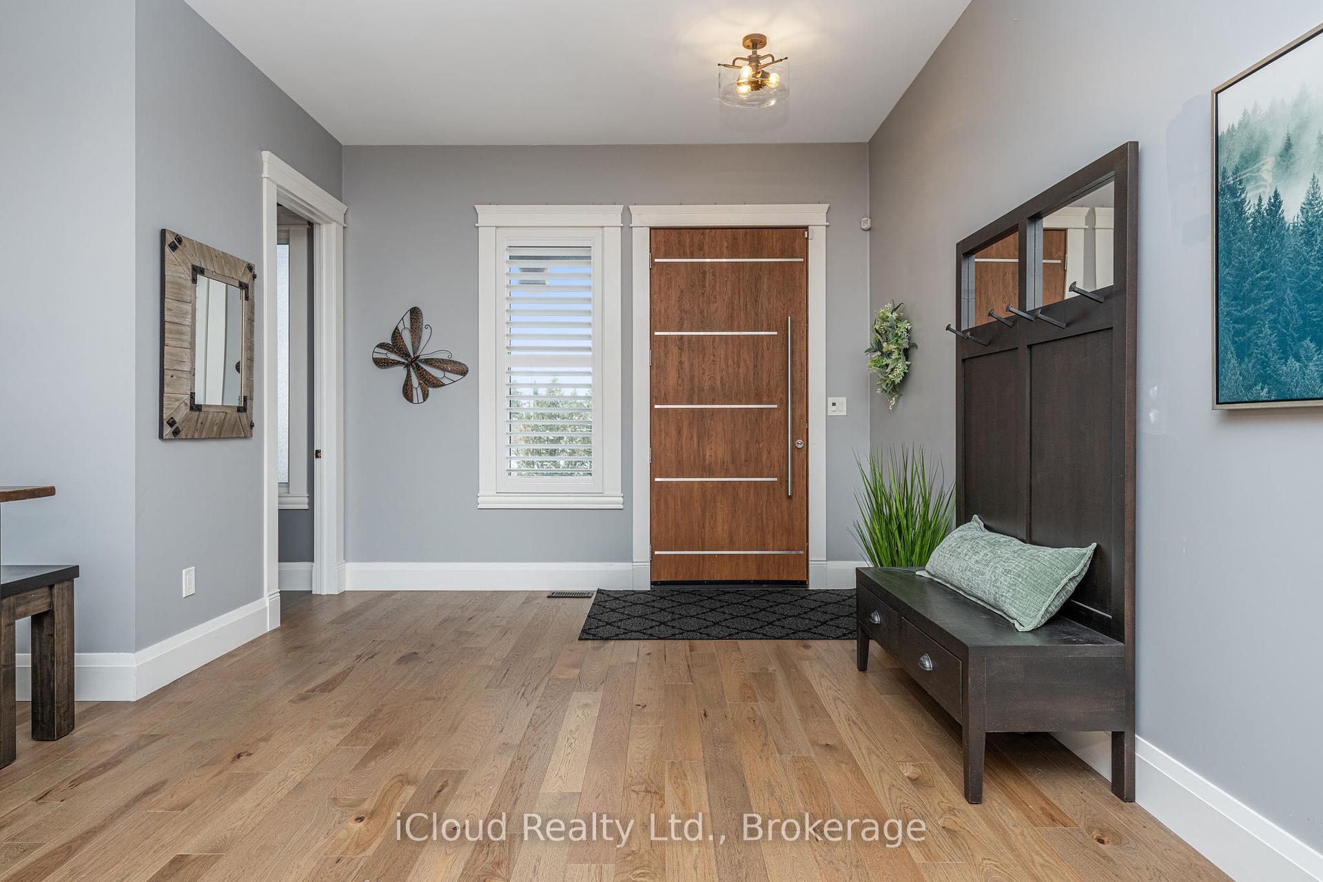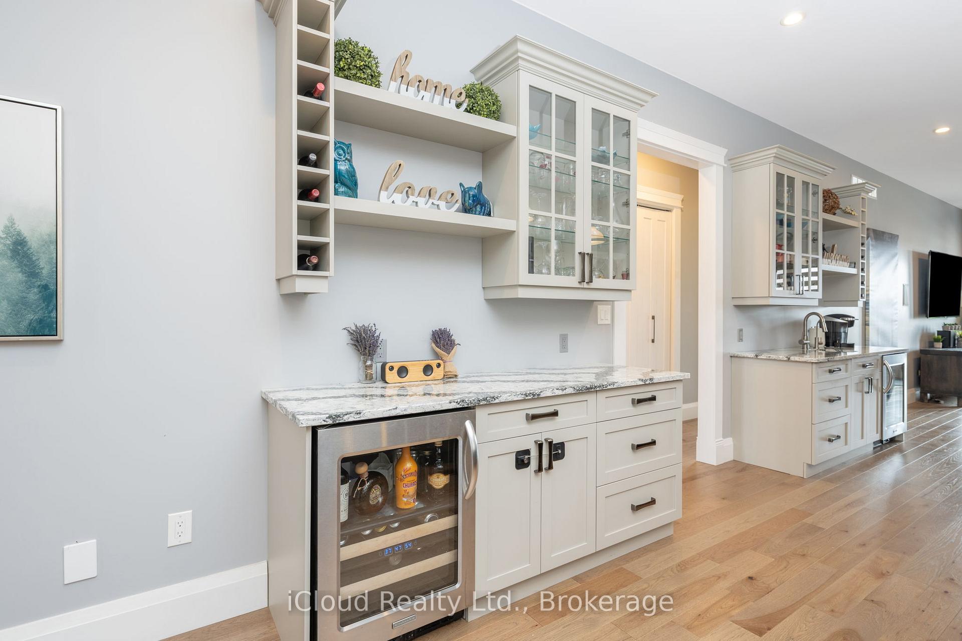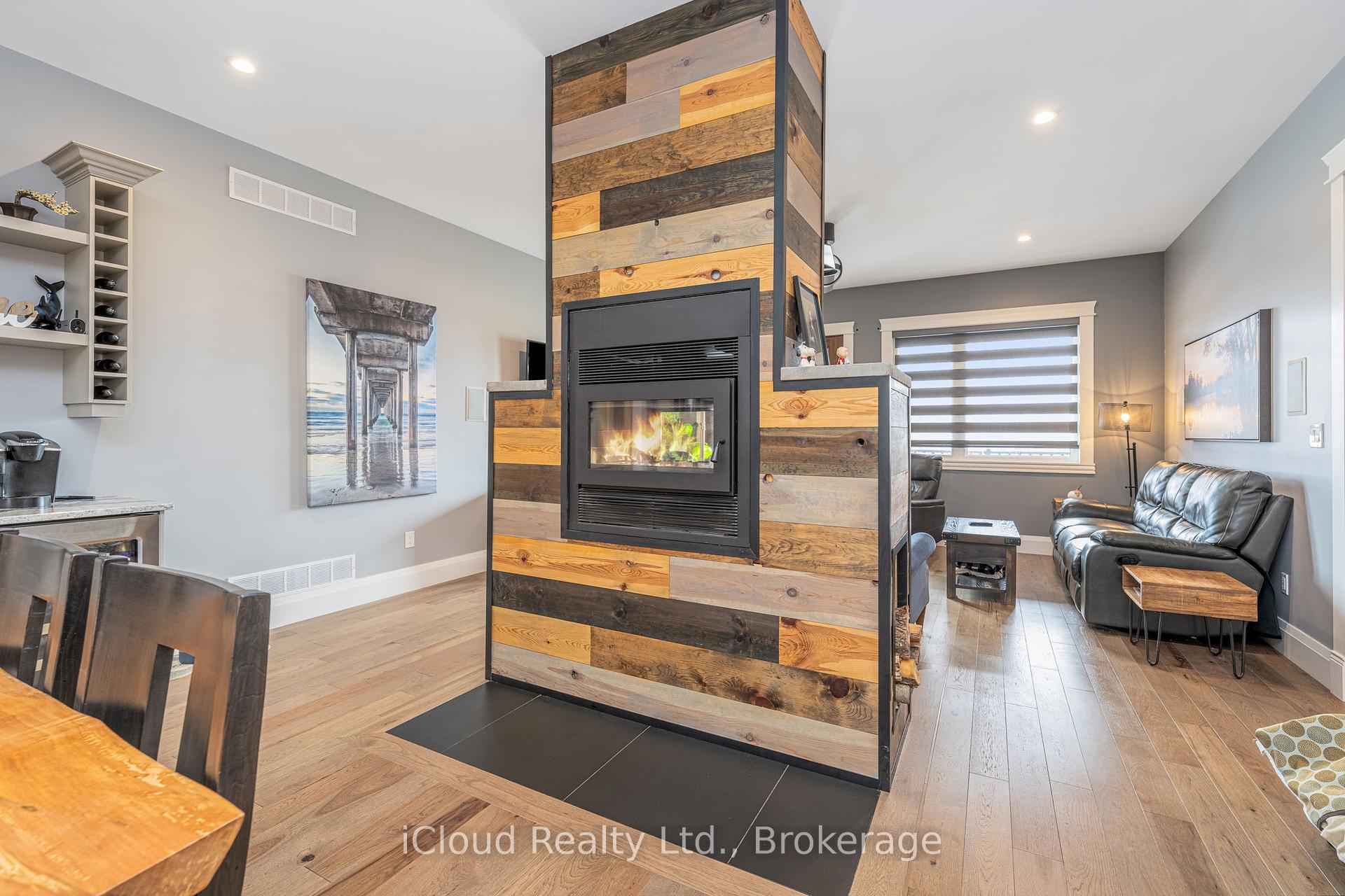This extraordinary 5-bedroom, 5-bathroom custom-built bungalow offers over 5,000 sq ft of beautifully finished living space on 9 peaceful, tree-lined acres in sought-after Erin. A perfect blend of luxury and functionality, the home features hardwood flooring throughout the main level and a chefs dream kitchen with a large quartz island, top-of-the-line appliances, and a two-way fireplace connecting to the inviting living room. A walkout from the living room leads to a covered deck overlooking the stunning property ideal for entertaining or quiet evenings in nature. The primary suite is a true retreat, featuring a spa-inspired ensuite with a spacious 6×6 open-framed shower, freestanding tub warmed by a gas fireplace, and elegant finishes. Two additional main floor bedrooms each offer 4-piece ensuites and double closets, providing comfort and privacy for family or guests. The fully finished walk-out basement boasts a spacious layout with heated floors, a second kitchen, games area, cozy great room with gas fireplace, dedicated theatre room with Dolby Atmos 9.1 surround sound, one bedroom currently used as a home gym, and a second bedroom with a semi-ensuite featuring another 6×6 open-framed shower. Step outside to a private patio with gazebo, hot tub and built-in fire nook perfect for relaxation. Additional highlights include a heated garage with epoxy flooring, whole-home 22kW automatic generator, reverse osmosis water treatment system, and scenic pond separating two 4+ acre parcels each with its own driveway and natural gas hookup. Previously approved for a second building (with septic and well), this property offers luxury, flexibility, potential future development, and country charm in one unmatched package.