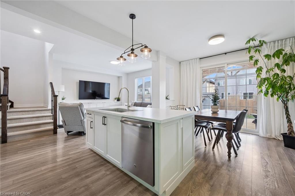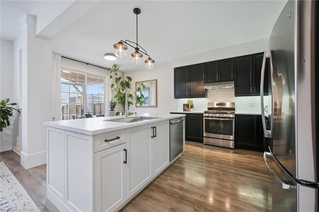Nestled in the highly sought-after Summerfields community, this beautifully finished 3-bedroom, 3.5-bathroom detached home offers over 2,200 sq ft of thoughtfully designed living space — perfect for modern family life. Step inside to an inviting open-concept main floor featuring luxury vinyl plank flooring throughout. The living room includes custom built-ins, ideal for displaying keepsakes or keeping toys neatly tucked away. The stylish kitchen boasts a custom island, stainless steel appliances, and under-cabinet lighting that highlights a porcelain tile backsplash. The adjoining dining area opens onto a covered back deck and private backyard — perfect for summer BBQs and family get-togethers. Upstairs, the spacious primary suite offers two walk-in closets and a serene ensuite complete with a soaker tub. Two additional bedrooms share a bright 4-piece bathroom, ideal for kids or guests. The finished basement is a true family bonus — featuring a versatile home office or flex space, a cozy recreation room with an electric fireplace, a wet bar for entertaining (or morning coffee!), and a convenient full bathroom. Outside, the fully fenced yard provides privacy and room to play, with a large storage shed to keep everything organized. Located in a family-friendly neighbourhood close to parks, top-rated schools, and amenities, this home also offers easy commutes to Guelph, Kitchener-Waterloo, Orangeville, and the 401. 98 Kay Crescent isn’t just a house — it’s a place to grow, gather, and create lasting memories.