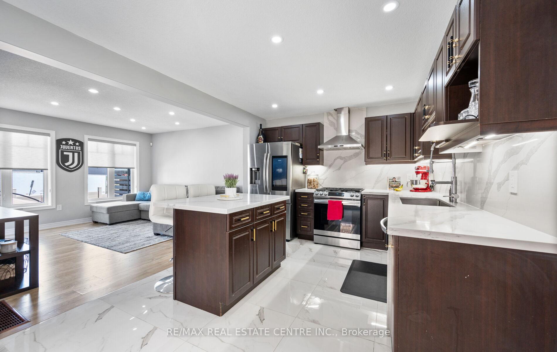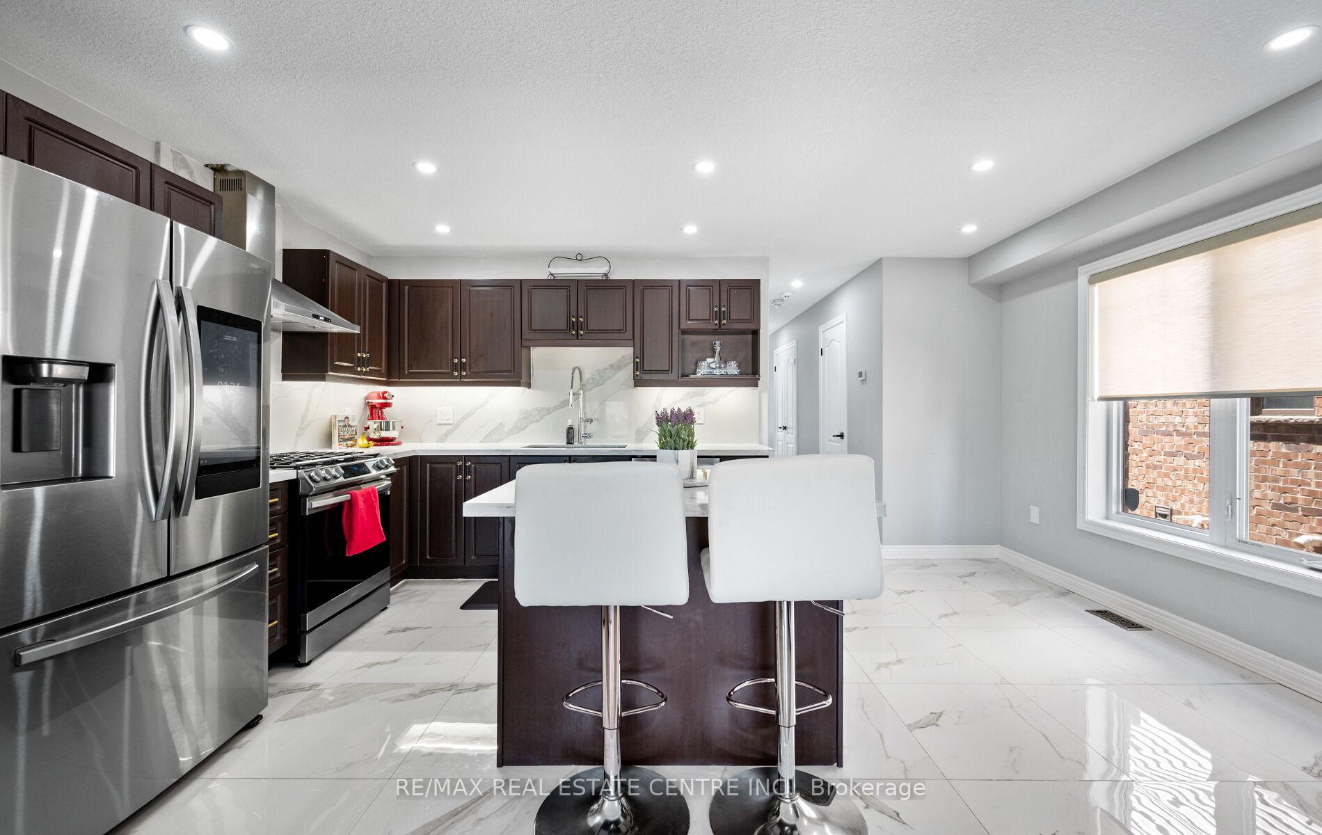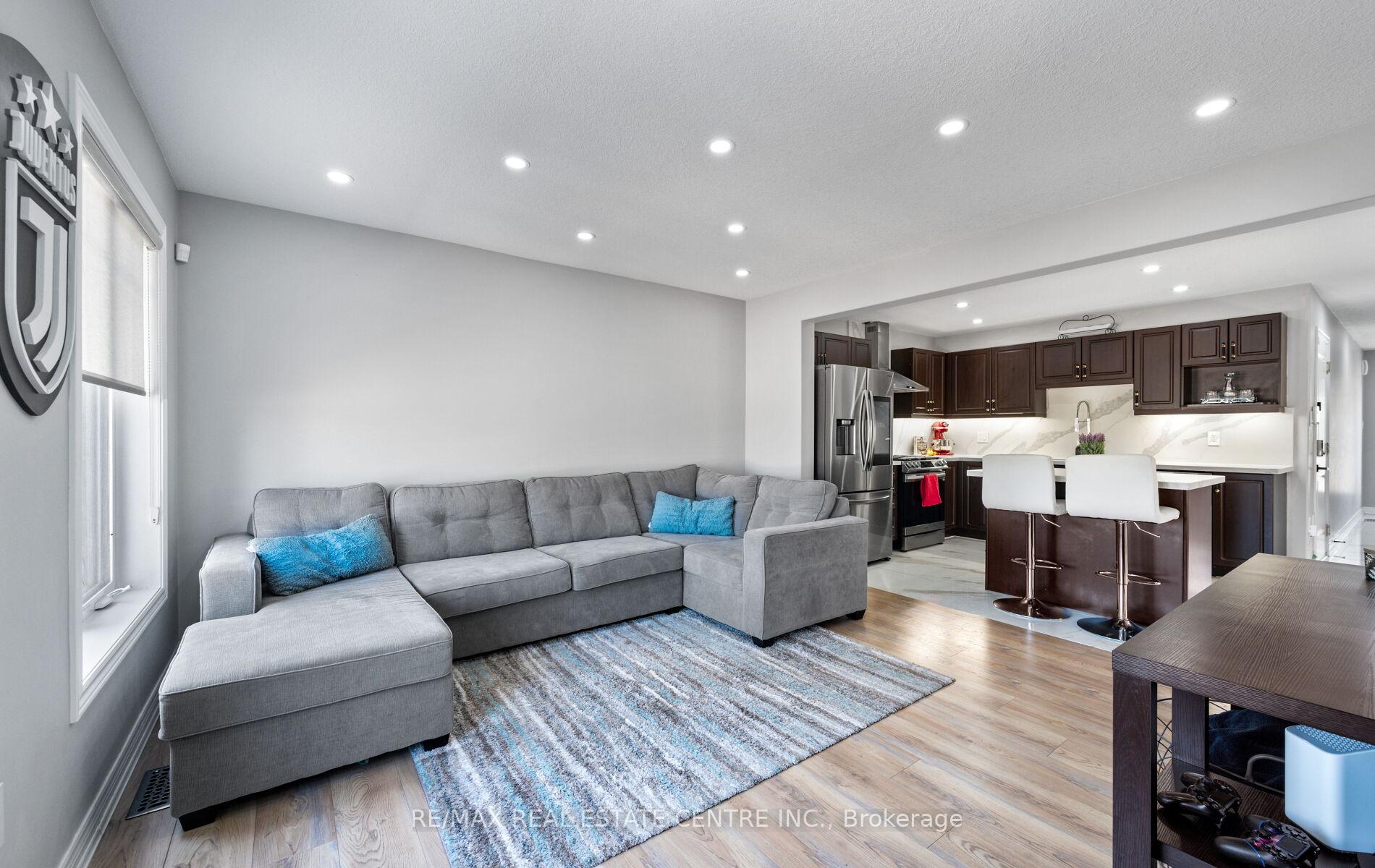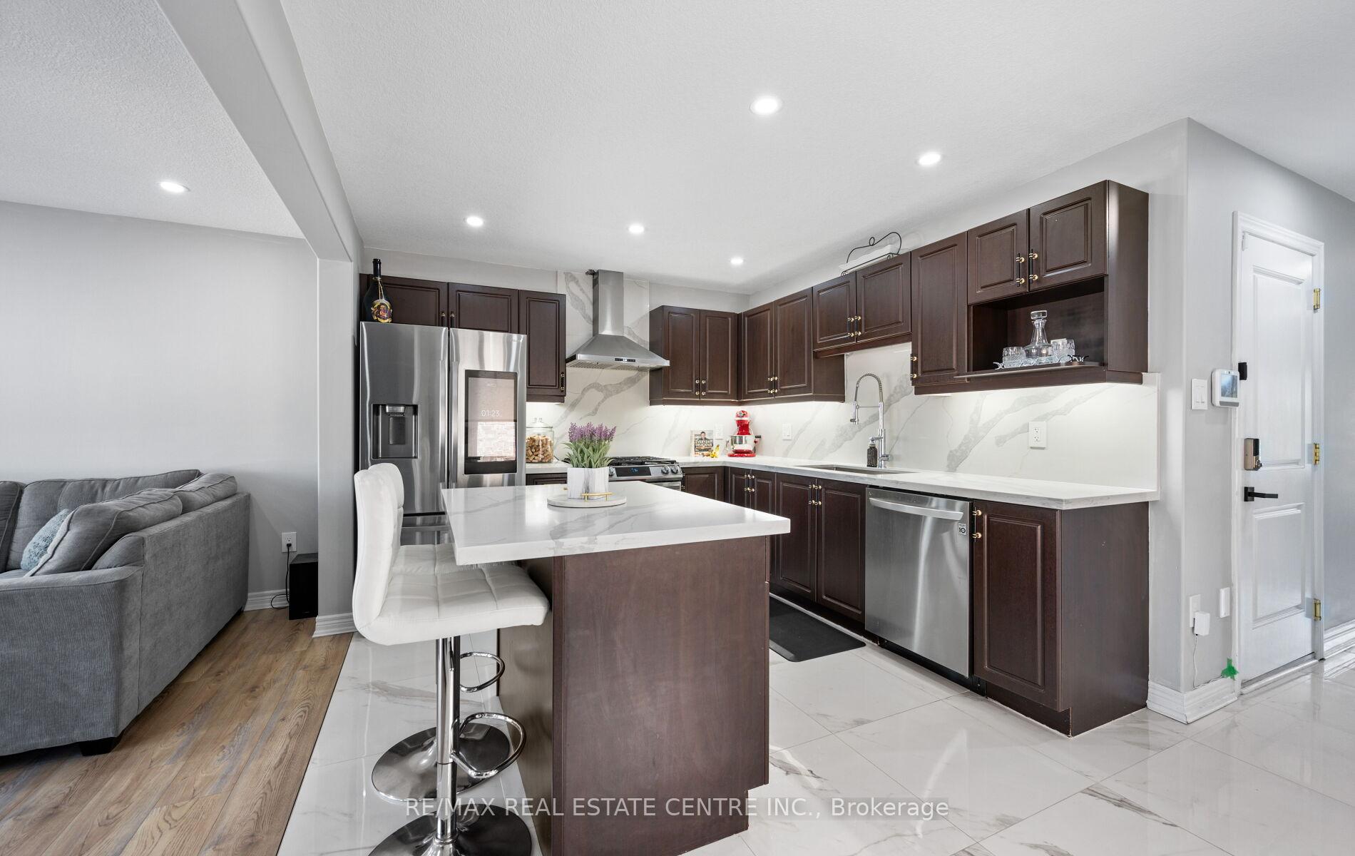 Stunning Upgraded End Unit Townhome on a Quiet Cul-De-Sac! This beautifully maintained home offers a spacious open-concept layout filled with natural light and no sidewalk for extra parking. Featuring upgraded tiles, modern baseboards, and wide plank laminate flooring throughout the main areas. Enjoy cozy comfort with updated Berber broadloom in the bedrooms. The sleek, modern kitchen is complete with stainless steel appliances, quartz countertops, stylish backsplash, and an undermount sink. Pot lights add a touch of elegance throughout. The primary bedroom boasts a private 3-piece ensuite. Step outside to a finished cobblestone backyard with an outdoor deckperfect for entertaining. Fully fenced with gated access for privacy and security. Located in a highly sought-after area, just minutes from schools, parks, shopping, transit, and more!