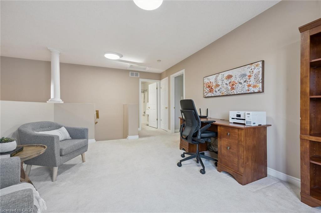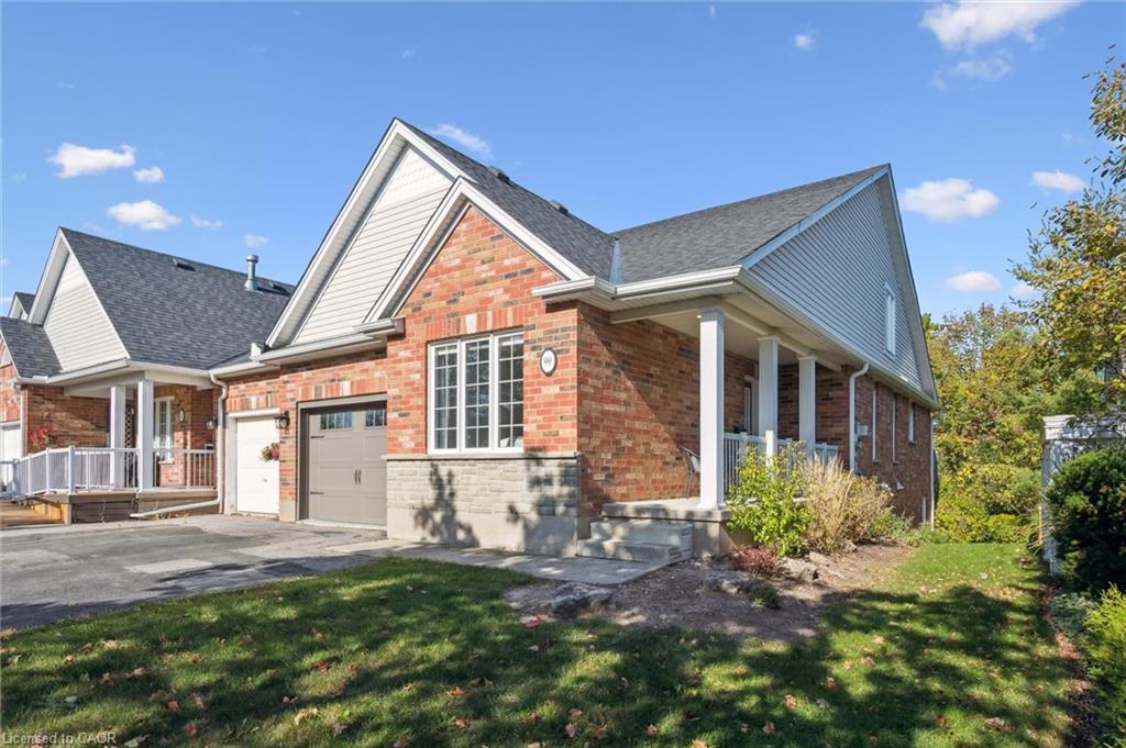 Looking for a home that gives you main-floor living without sacrificing space for family or guests? Welcome to 99 Schroder Crescent – a spacious, move-in-ready bungaloft backing onto Hadati Creek in Guelphs east end. This corner unit feels more like a detached home, with over 2,000 sq ft above grade plus a finished walkout basement. The brick and stone exterior, covered front porch, and double driveway offer great curb appeal from the start. Inside, the layout is ideal for downsizers who still want room to host or for families with older children who like their own space. The main floor features maple hardwood throughout and an open-concept living and dining area with a cozy fireplace and soaring two-storey ceilings that open to the loft above. The bright eat-in kitchen has stone countertops, stainless steel appliances, and a breakfast area that walks out to a deck overlooking the creek – the perfect spot for morning coffee with a view. The oversized main-floor primary suite has generous closet space and a private 4-piece ensuite with a soaker tub. You’ll also find a den or second bedroom on this level, plus a powder room and main floor laundry for easy everyday living. Upstairs, the loft is the perfect flex space – a TV room, reading nook, or office – alongside a third bedroom and full bathroom. The finished walkout basement gives you even more versatility with a large recreation room, fourth bedroom, flex space, a bathroom with sauna, tons of storage, and access to a private patio surrounded by nature. Whether you’re downsizing and want comfort without compromise, or youre a family looking for separation of space, this home delivers. Steps to parks, schools, trails, and amenities, 99 Schroder Crescent combines low-maintenance living with the size and feel of a detached home – backing onto one of the prettiest natural settings in the city!